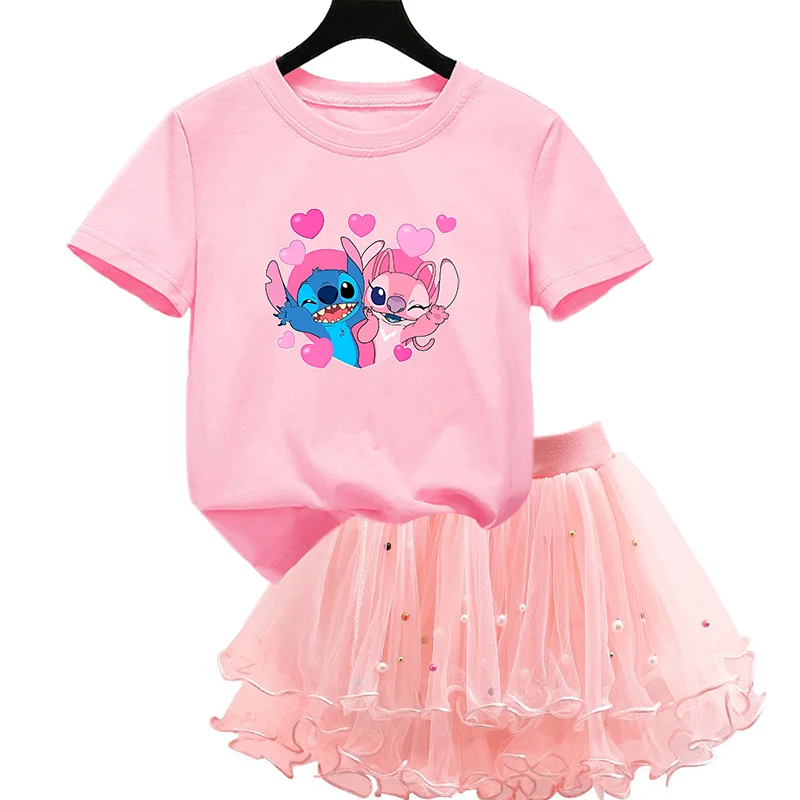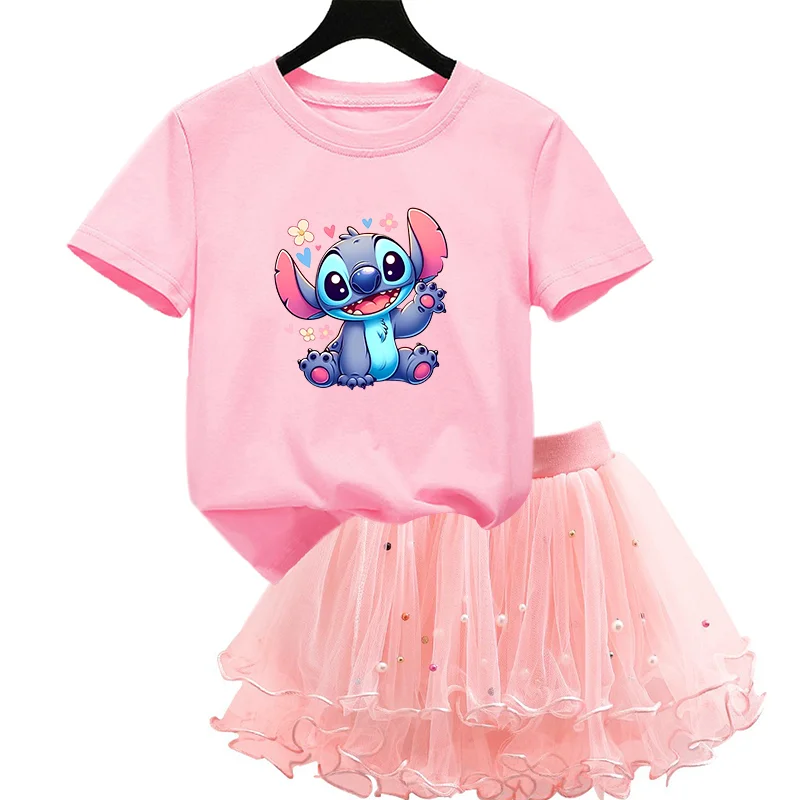 Color: army green, Kid Size: 4 - 2pcs Lilo Stitch Summer Girls Outfits Cartoon T-shirt and Tutu Skirt Princess Clothes Suit Children Birthday Clothing Sets