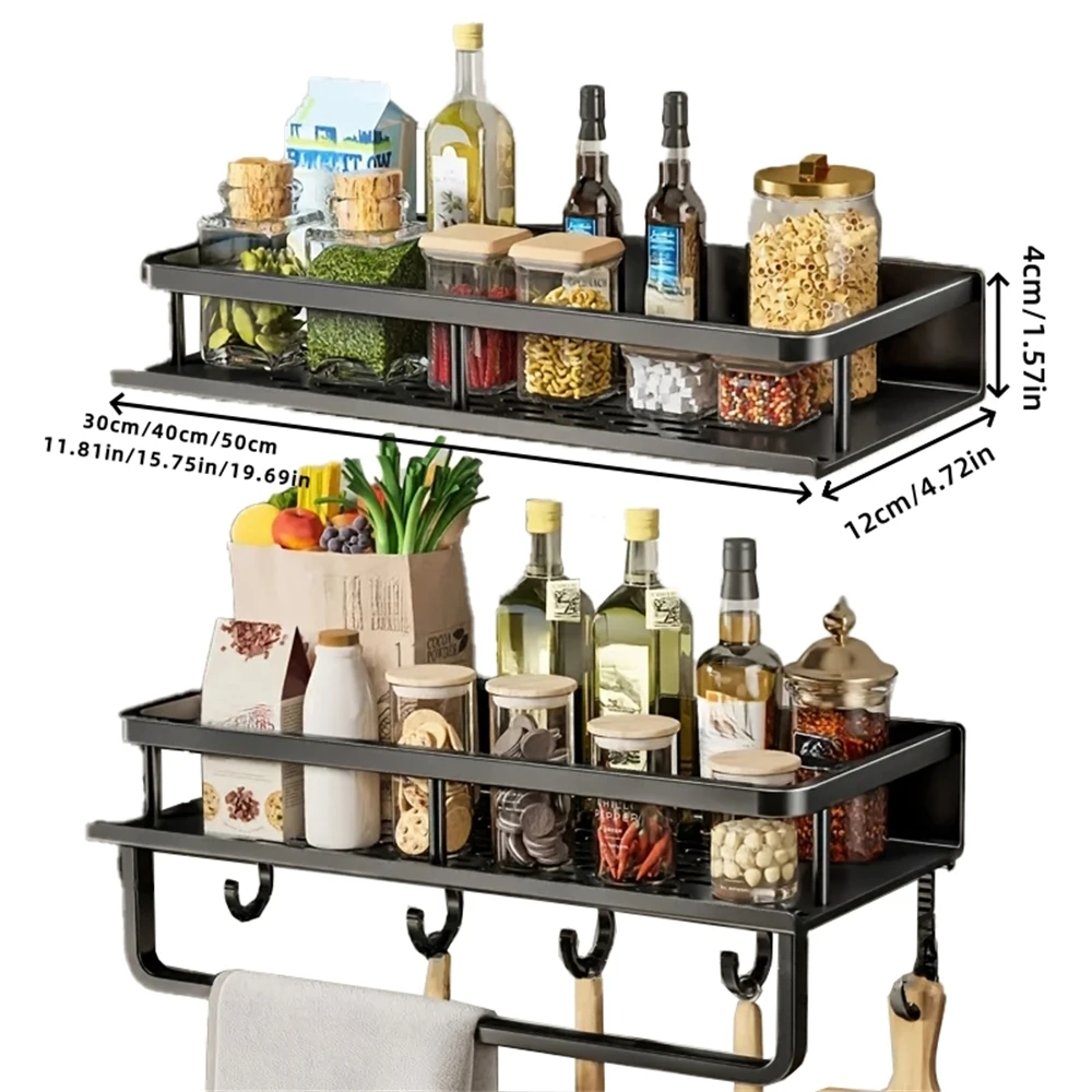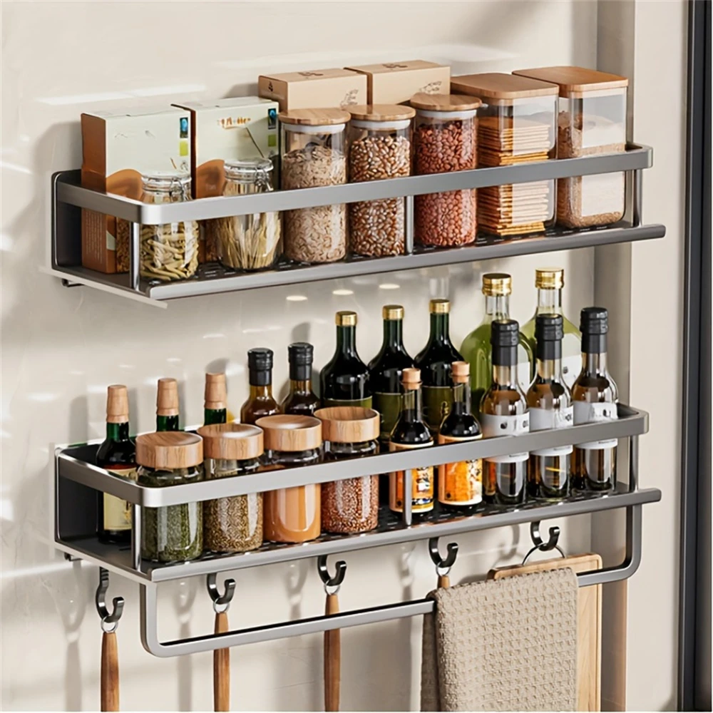 Color: Army Green - Multifunctional Kitchen and Bath Tray Wall-Mounted Aluminum Storage Rack Seasoning Bottle Storage Shelf Kitchen Storage Hooks