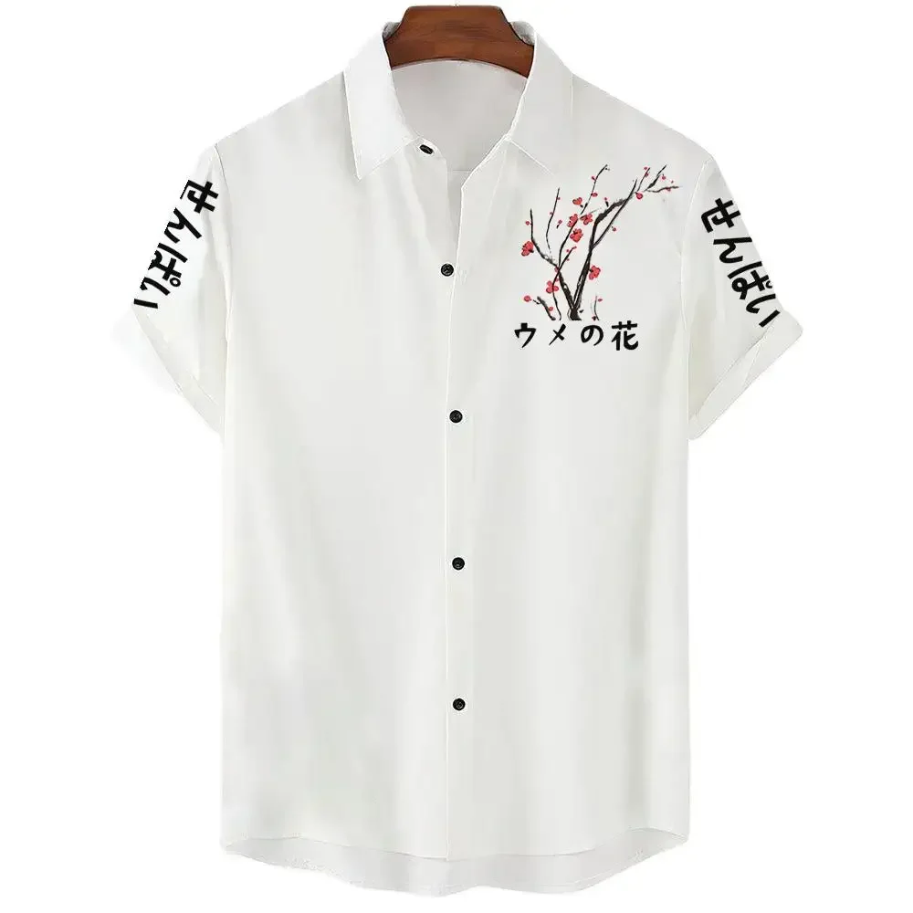 Color: army green, Size: L - Fashionable Luxury Social men's Shirt Lapel button-down Shirt Casual Japanese Aesthetic Cherry Blossom Print short-sleeved Tops