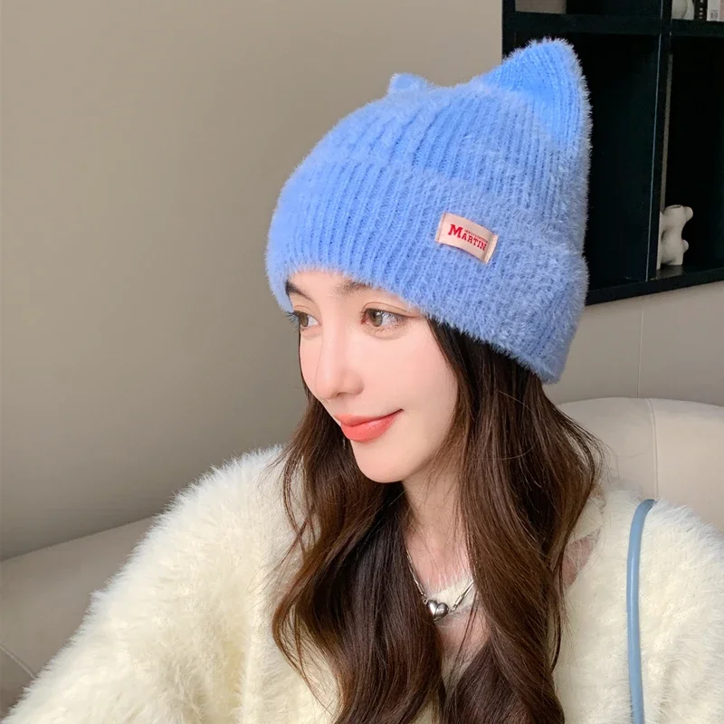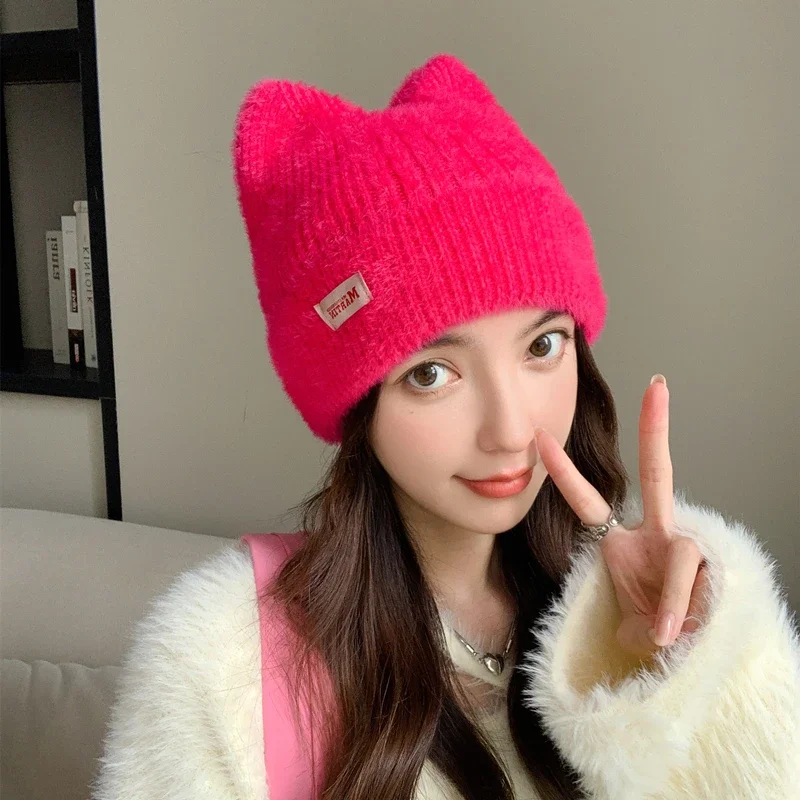Color: army green, Size: One Size - New Women Cute Cat Ear Earflap Winter Hat Fashion Faux Fur Knitted Hat Kpop Style Soft Beanie Hats Candy Female Streetwear Cap
