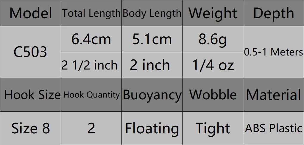 this fishing lure is a slow-floating tight wobble bait with a body length of 5.1 cm and a weight of 7.1 g. It has a length of 6.4 cm, and it is recommended to use a hook size 8. The lure is designed to work best in shallow water.