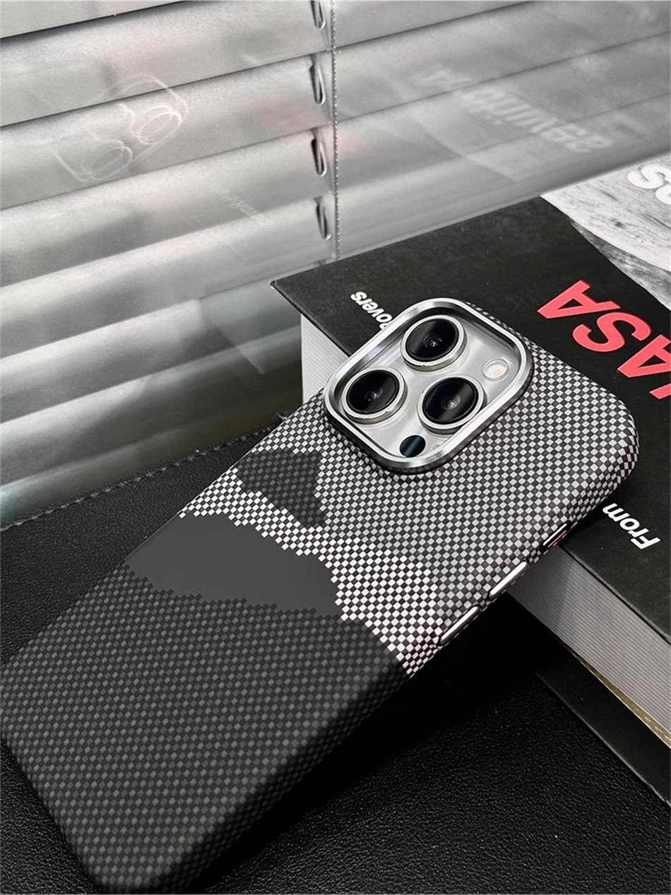 Color: Beige, Material: Plastic - Luxury Alloy Lens 3D Relief Peak Carbon Fibre Pattern Case For iPhone 13 14 15 16 Pro Max Slim Shockproof PC Cover For Magsafe