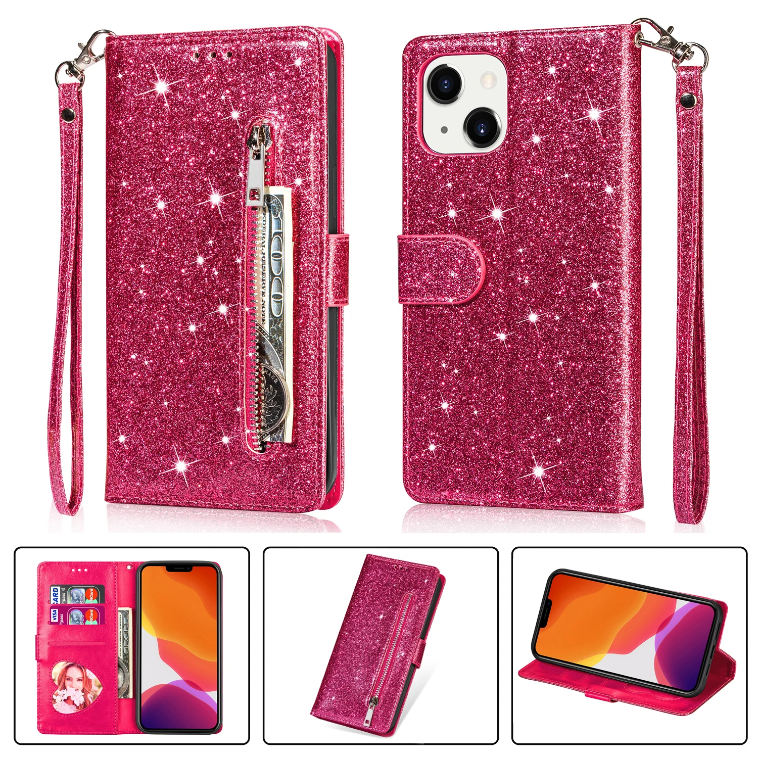 Color: Beige, Material: PU - Zipper Flip Wallet Glitter Leather Case for iPhone 16 15 14 13 12 11 Pro Max XS XR 8 7 Plus SE 2022 Mini Bling Stand Phone Cover