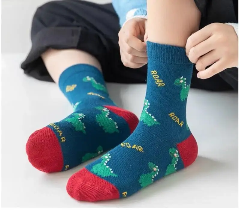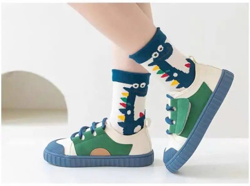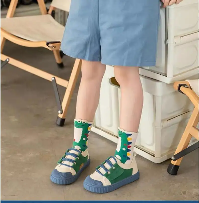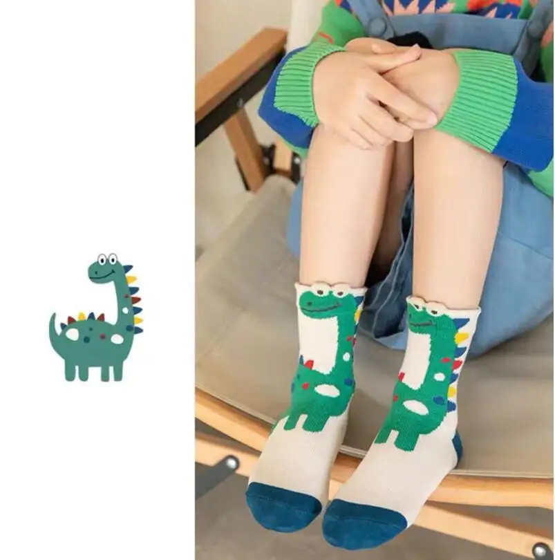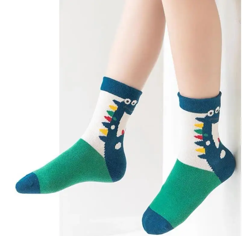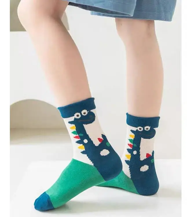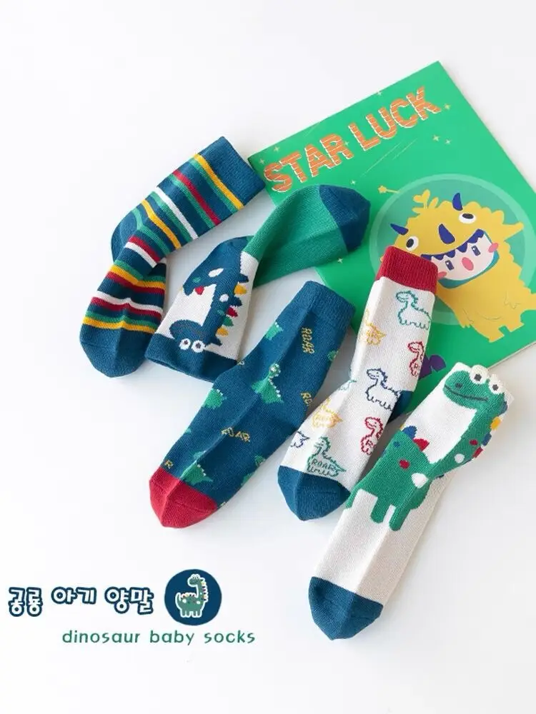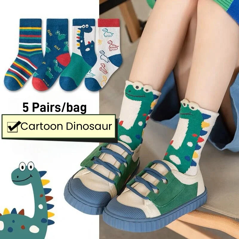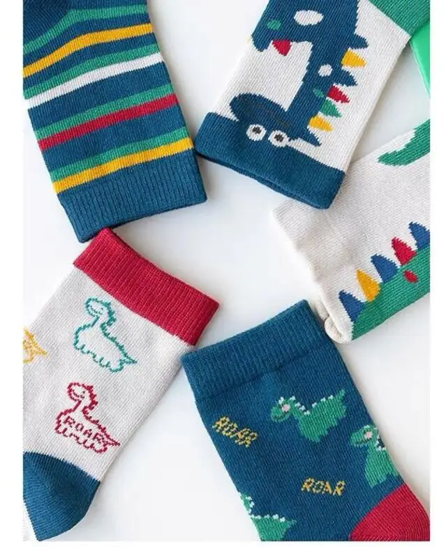Color: Beige, Size: 2-3T - Children's Socks Autumn Boys Cartoon Dinosaur Socks 1-14T Kids Cotton Socks Student Sporty Socks 5 Pairs