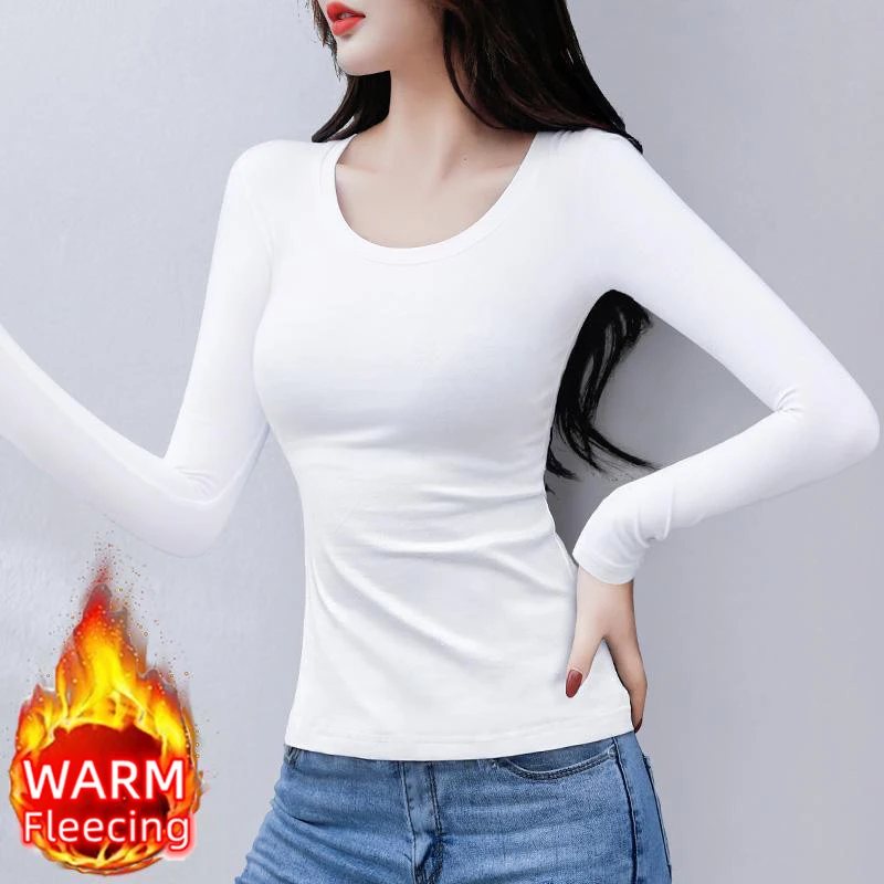 Color: Beige, Size: S - O Neck Long Sleeve Fleeceing Heating Fiber Thermal Basic T-Shirts Women Winter Bottoming Cropped Tops Casual Skinny All-match