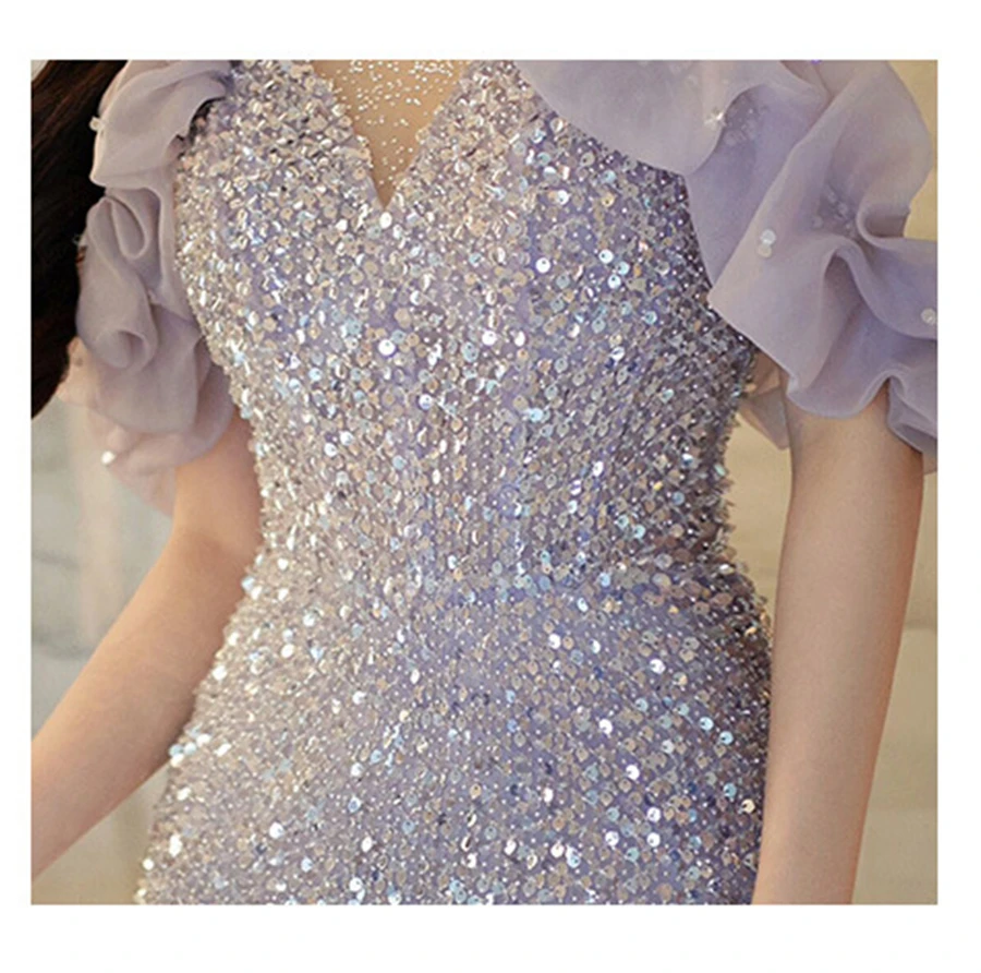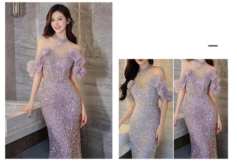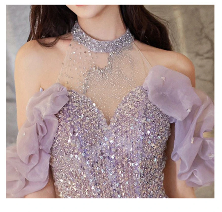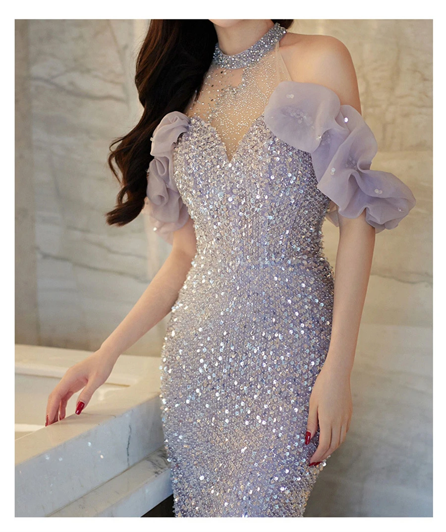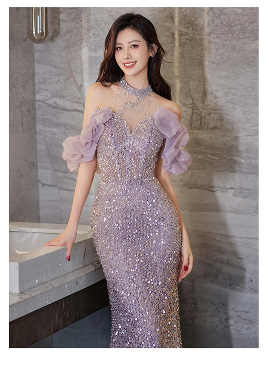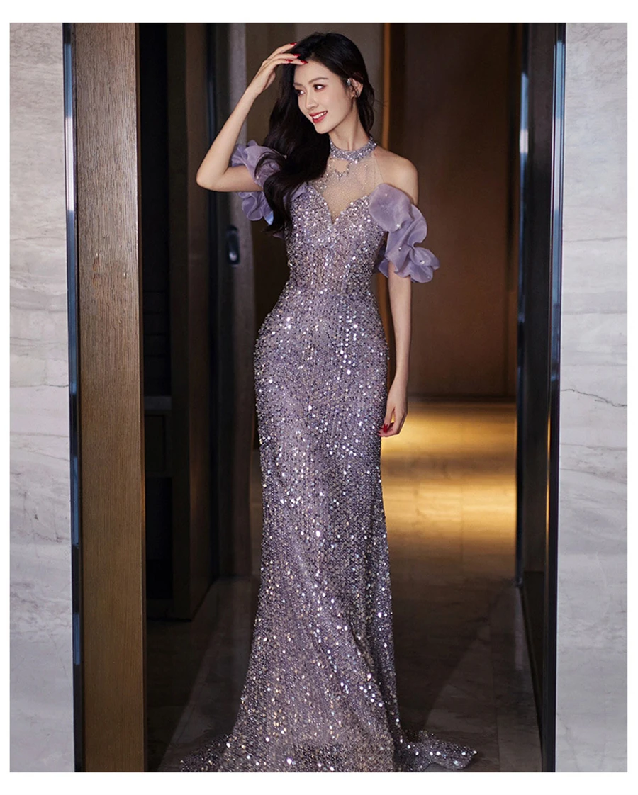 High-End Neck Evening Dress New Entry Luxury Niche Banquet Elegant Usually Wearing Sequin Fishtail Dress Princess Sleeve Women's
