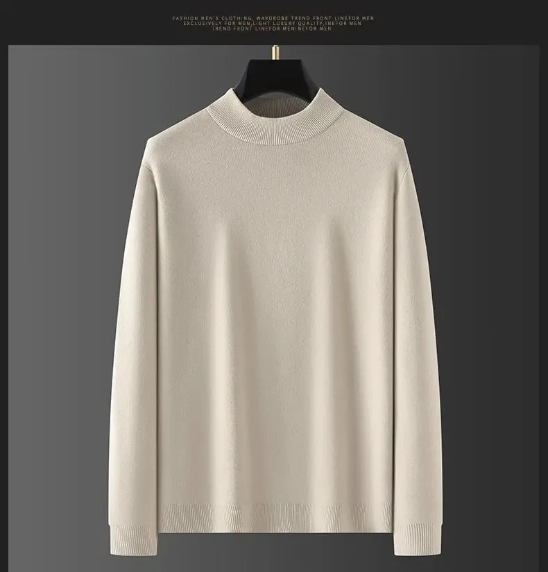 Color: Beige, Size: XXXL - Plush Men's Knitted Sweater Turtleneck with Velvet Padded Warm Solid Pullovers Autumn Winter Thick Bottom Casual O-Neck Sweater