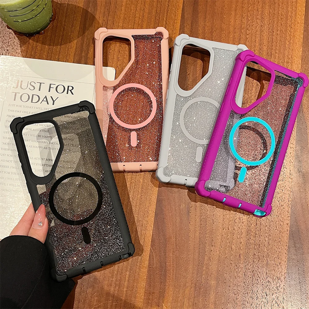 For Magsafe Clear Armor Bumper Glitter Phone Case For Samsung S25 Ultra S24 Plus Wireless Charging Shockproof Protective Cover