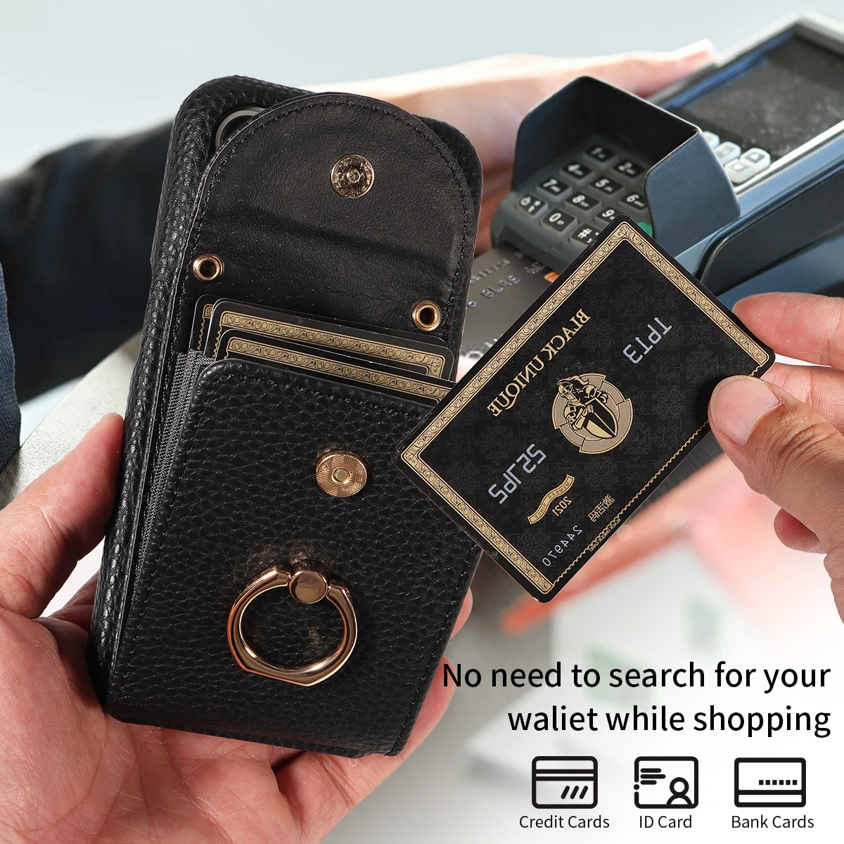 Color: black, Compatible-Phone Models: For iPhone 15 Plus, Bundle: Case & Strap, Material: Artificial Leather - High Quality Ring Stand Lychee Pattern Phone Case for IPhone16promax15 14 13 Crossbody with Lanyard PU Leather Anti-fall Cover