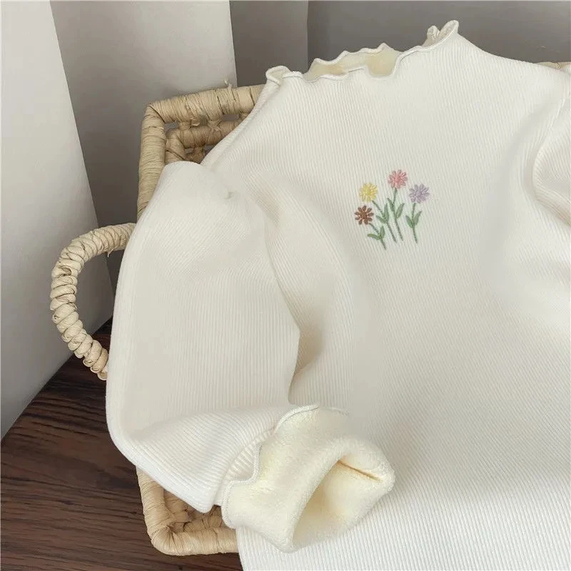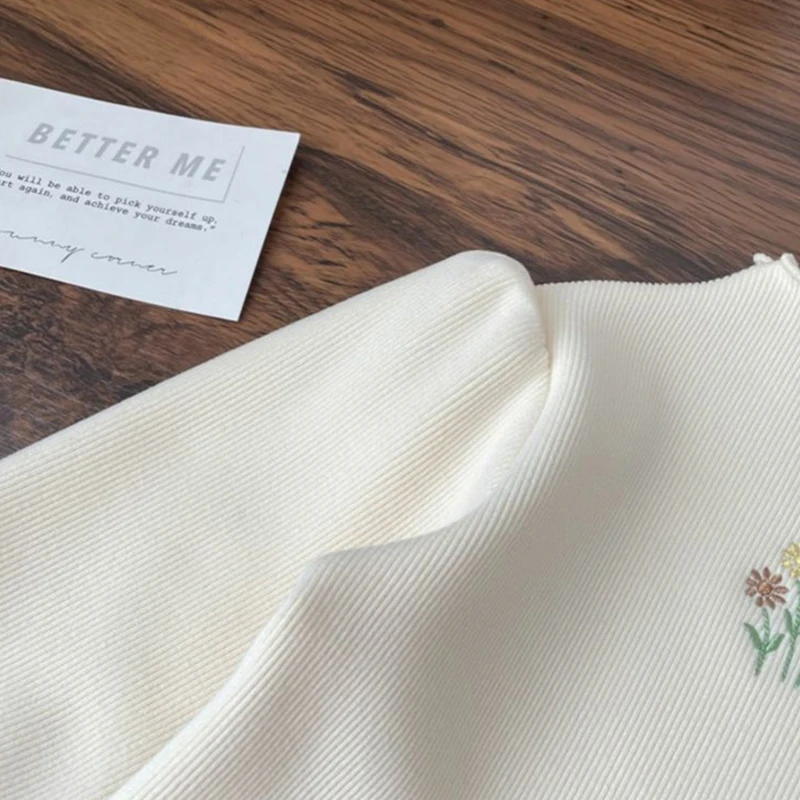 Color: black, Kid Size: 11 - Baby Girls Top Winter Kids Warm Thickening Sweater Children Puff Sleeve Flower Embroidery Bottom Shirt 1-6 Years Casual Clothing