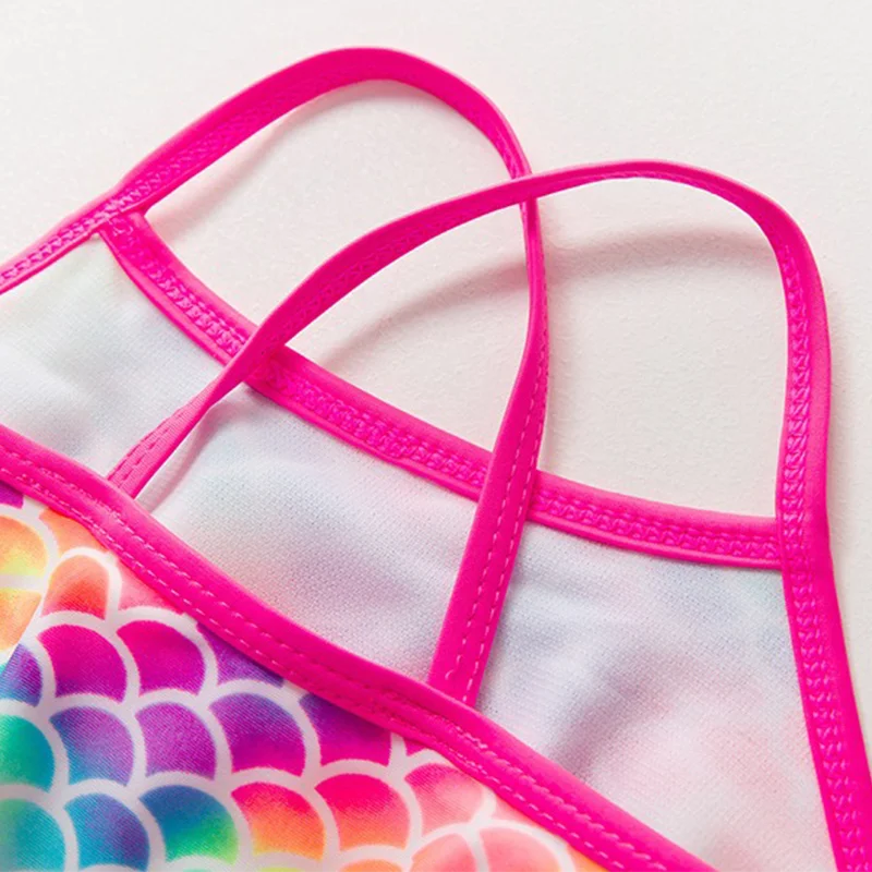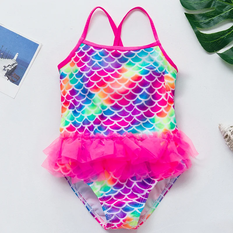 One-piece girls swimsuit, fish scales Designed with a cute ruffle hips.