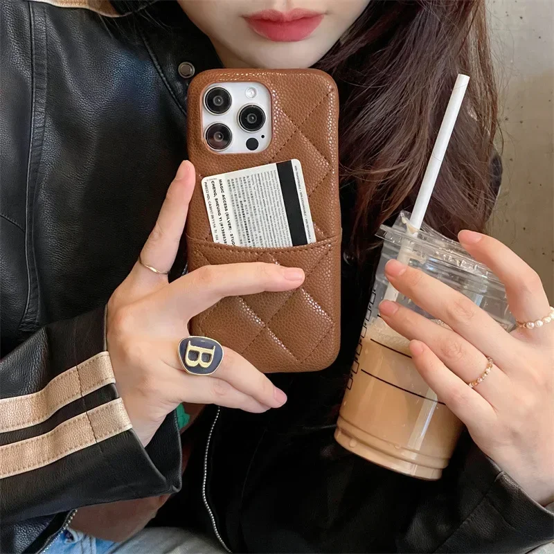 Luxury Lattice Pattern Faux Leather Cover For iPhone 16 15 14 13 Pro Max Credit Card Slot Holder Purse Wallet Shockproof Phone Case