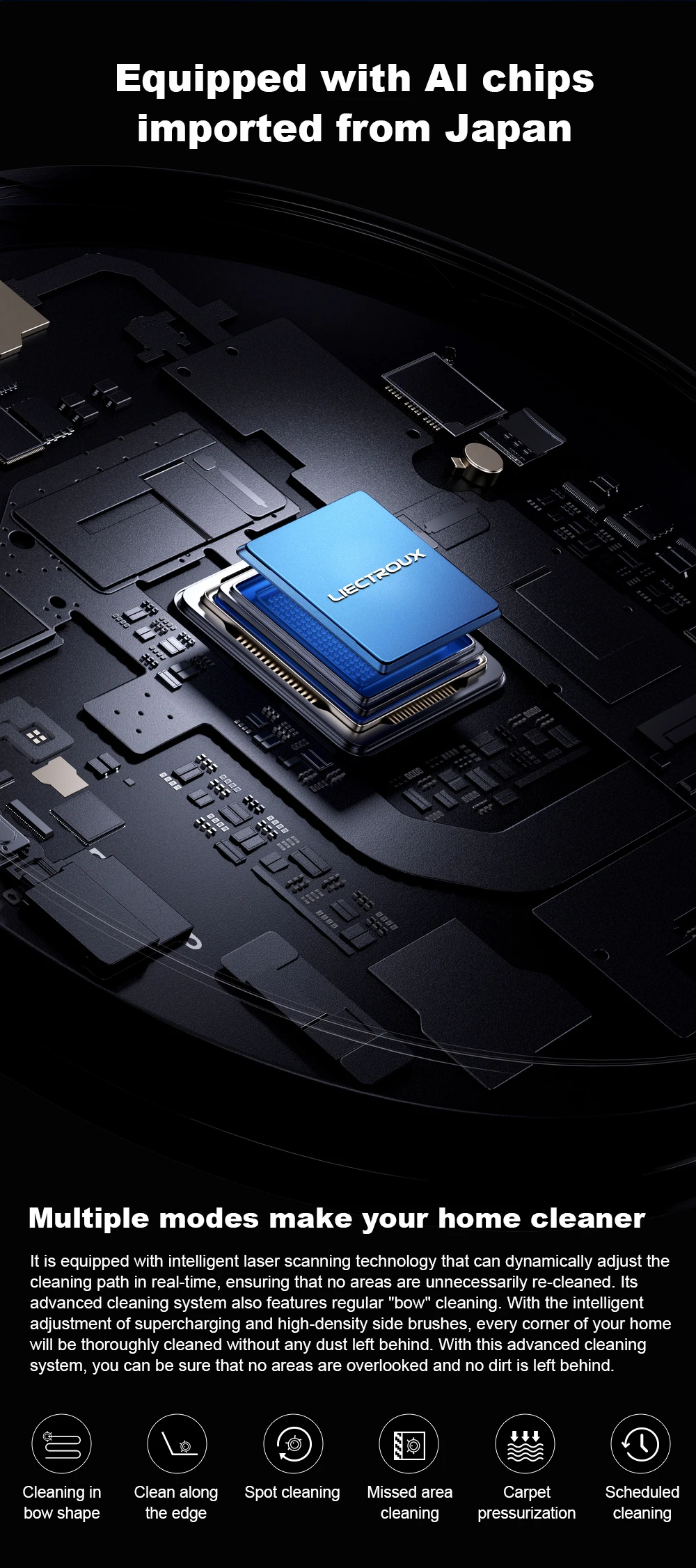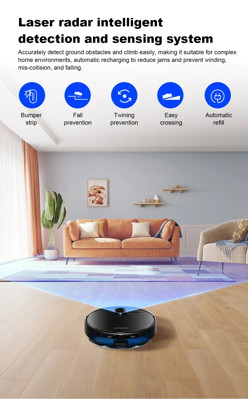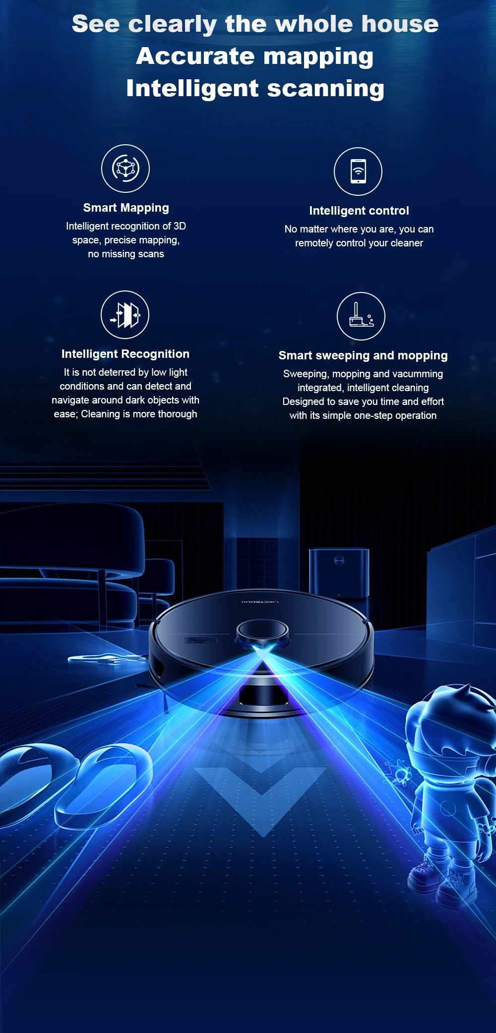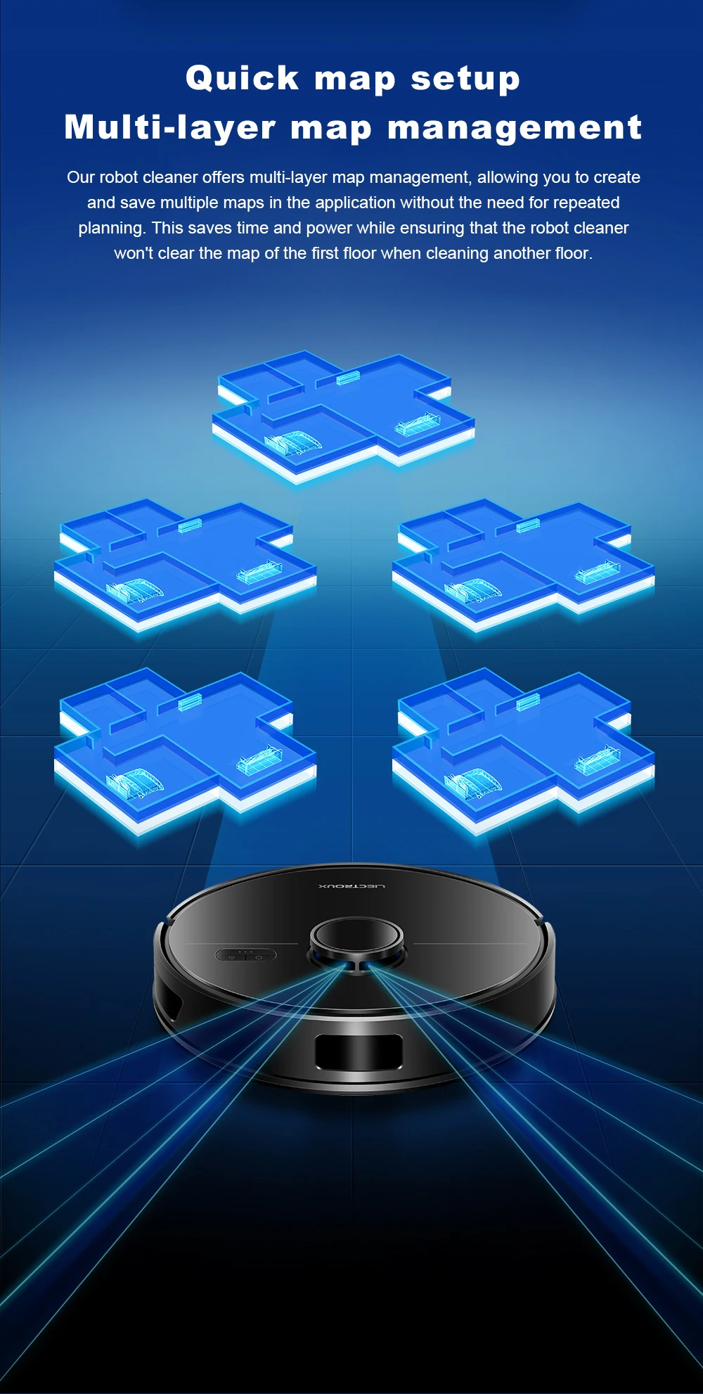 The M70 Pro robot vacuum and mop combo has a long battery life of of 110-175min at different suction settings,and max cleaning area up to 2260 square feet.(*According to the calculations of our Liectroux laboratory,There will be some differences in battery life in complex home environments), Robotic vacuum will automatically return to the charging dock when the battery is low.If the cleaning is not completed, it will automatically return to charge to 80% and the robot will go back to complete the rest of the cleaning