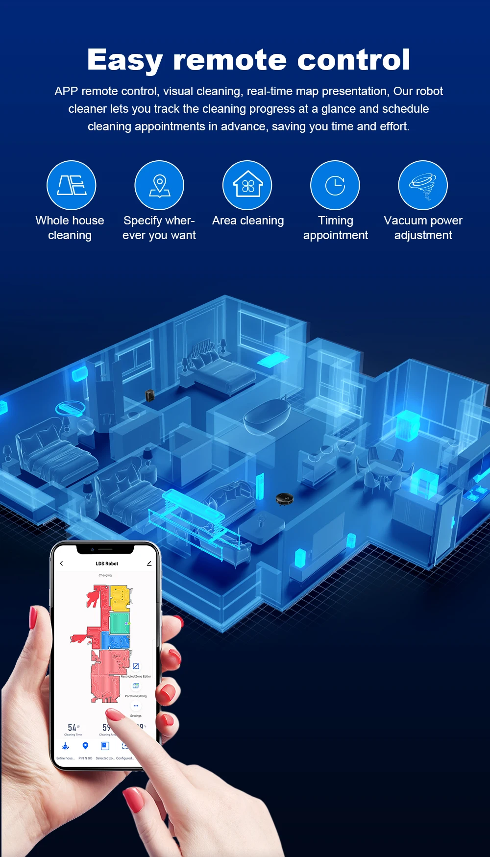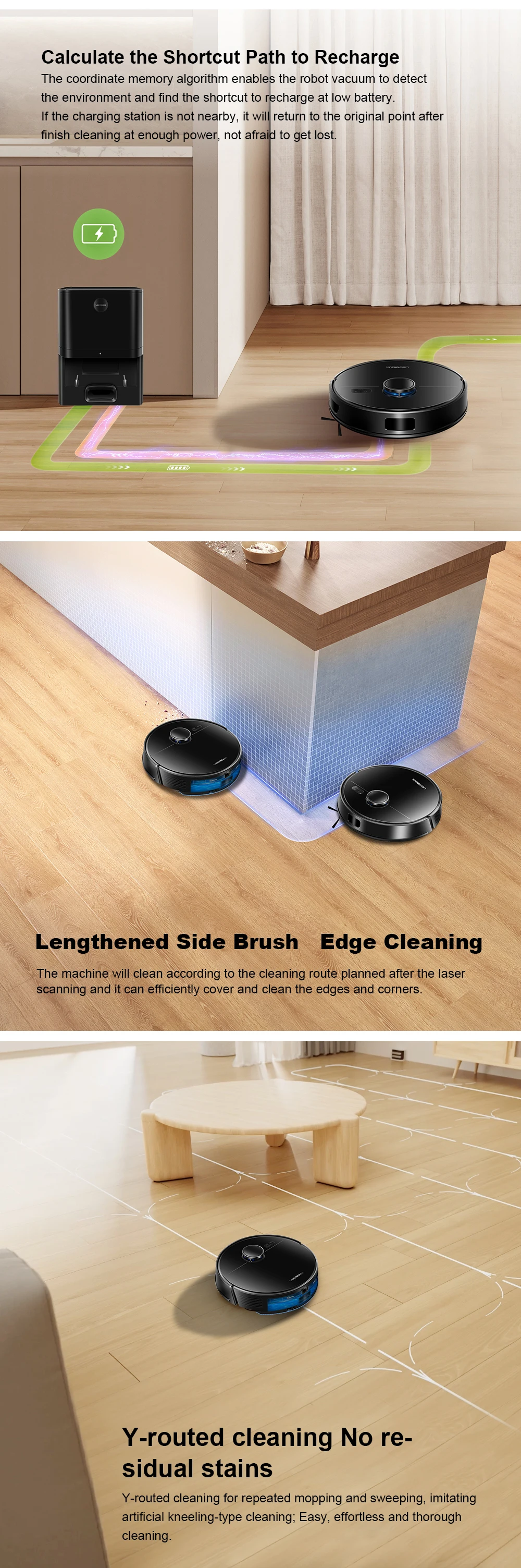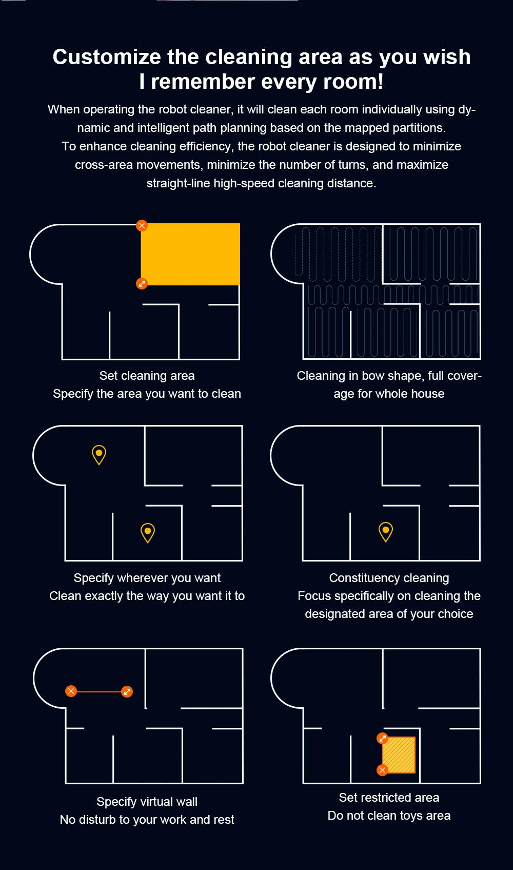 Automatic cleaning, edge cleaning, zone cleaning, spot cleaning, double cleaning, timing cleaning, Y-shaped mopping and Zigzag modes to meet your needs, you can create your own cleaning plan: set cleaning time, room cleaning sequence, suction strength, etc., You can set 30 virtual forbidden areas through the APP, to protect the carpet/pet area/children's play area to keep your robot vacuum cleaner away from the area you don't want it to enter.