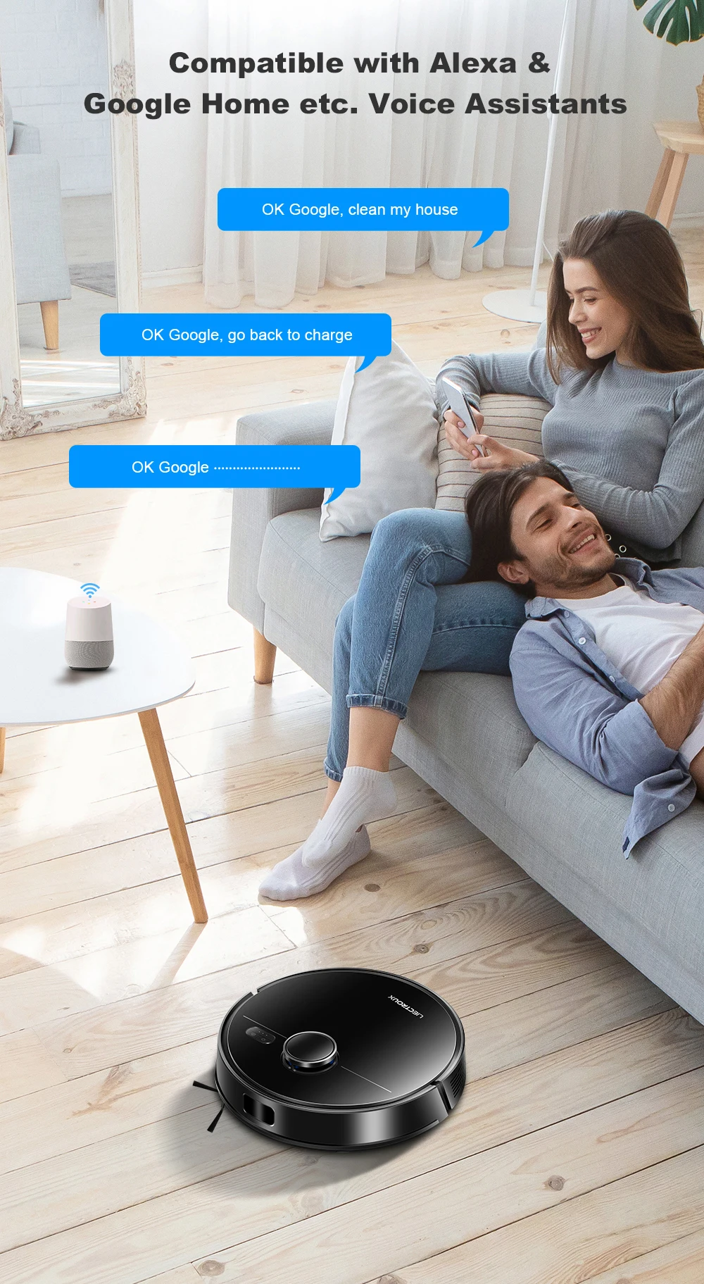 Use the Smart Life Tuya APP to monitor cleaning routes, set cleaning schedules, adjust suction and water levels, change cleaning modes, create restricted areas, saving 5 editable maps,and more. The robot vacuum cleaner will easily start or stop cleaning based on your custom map and voice commands from Alexa and Google Assistant, learning to let your life listen to you (2.4GHz WIFI network support only).