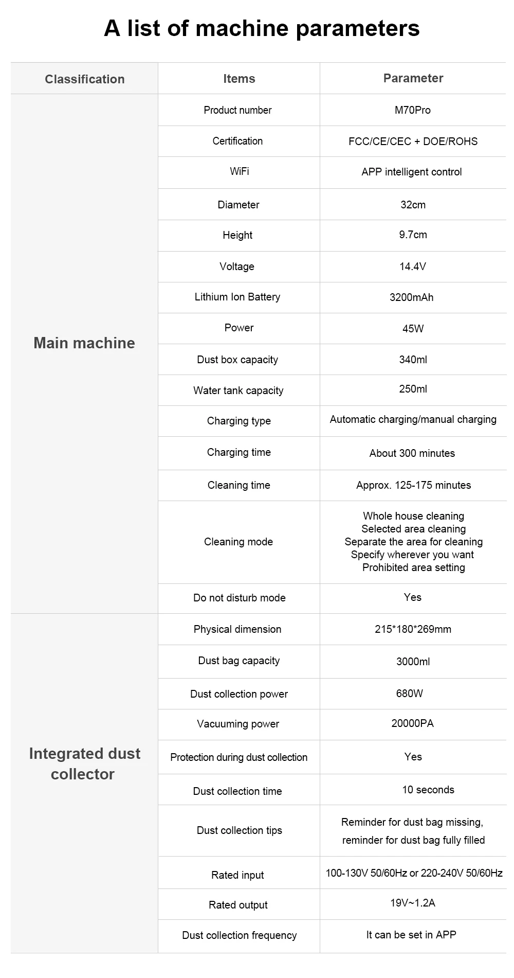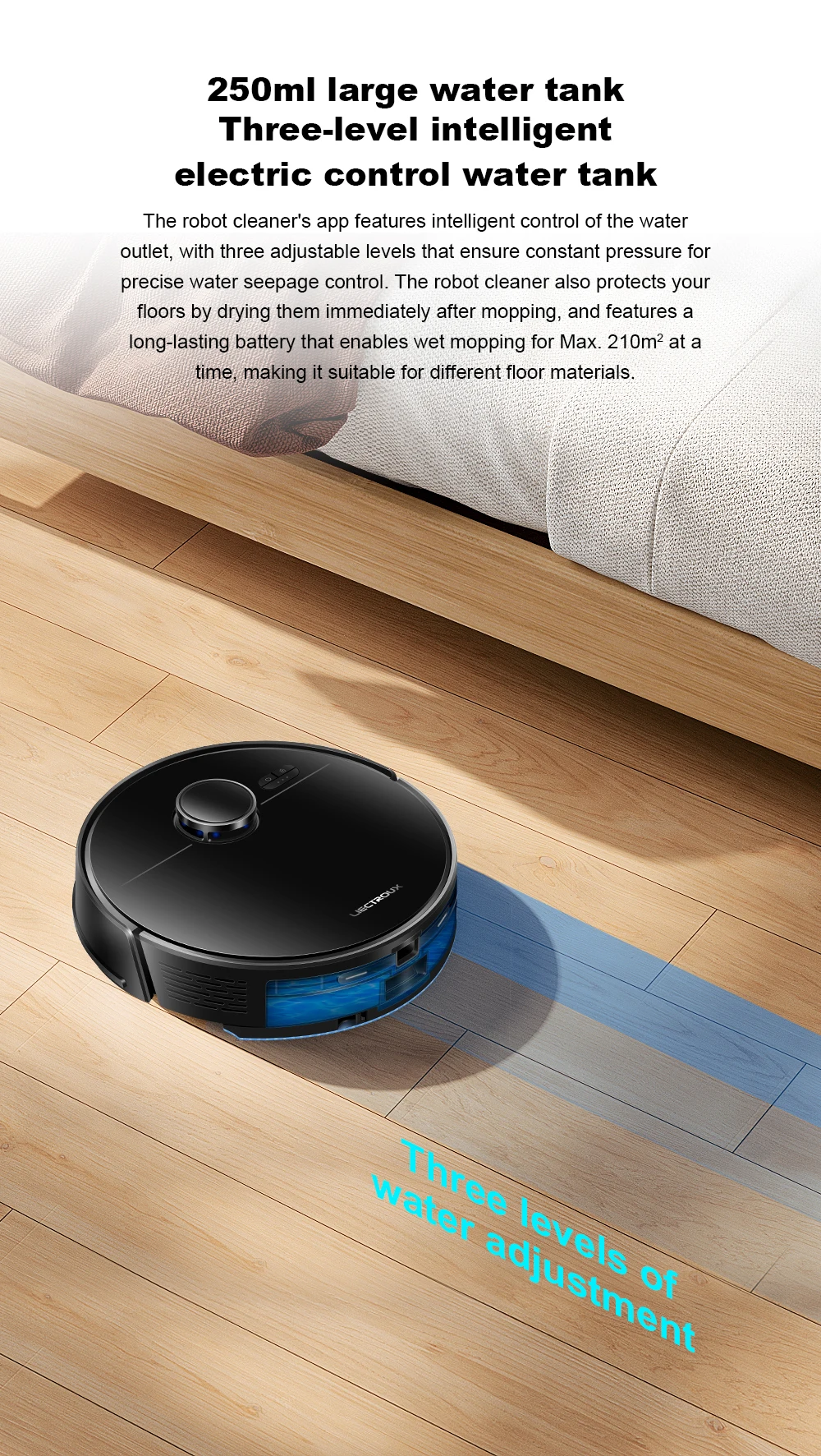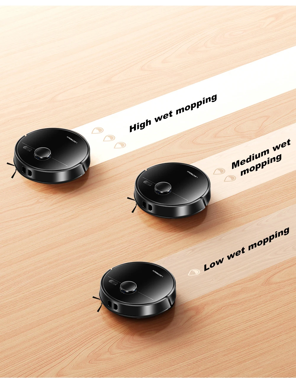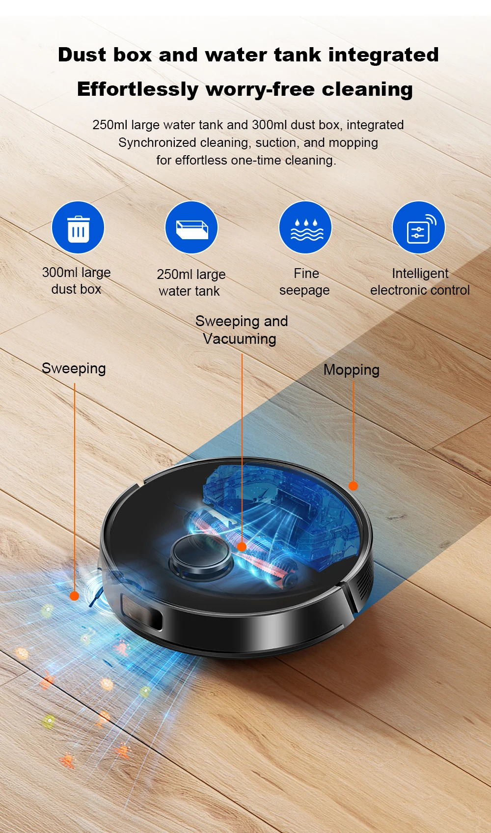 The M70 Pro robot vacuum and mop is equipped with side brushes, V-shaped roller brushes, mops, 3-stage cleaning,effectively reducing cleaning time.340ml large-capacity dust box, no need to sweep garbage frequently, and 250ml large-capacity electronically controlled water pump water tank, which can control water accurately no leak and support 3 levels of water flow adjustment. Y-shaped mopping, imitating manual mopping, no dirt omission, deep cleaning of the whole house,M70 Pro robot vacuum cleaner makes your floor clean and impeccable.