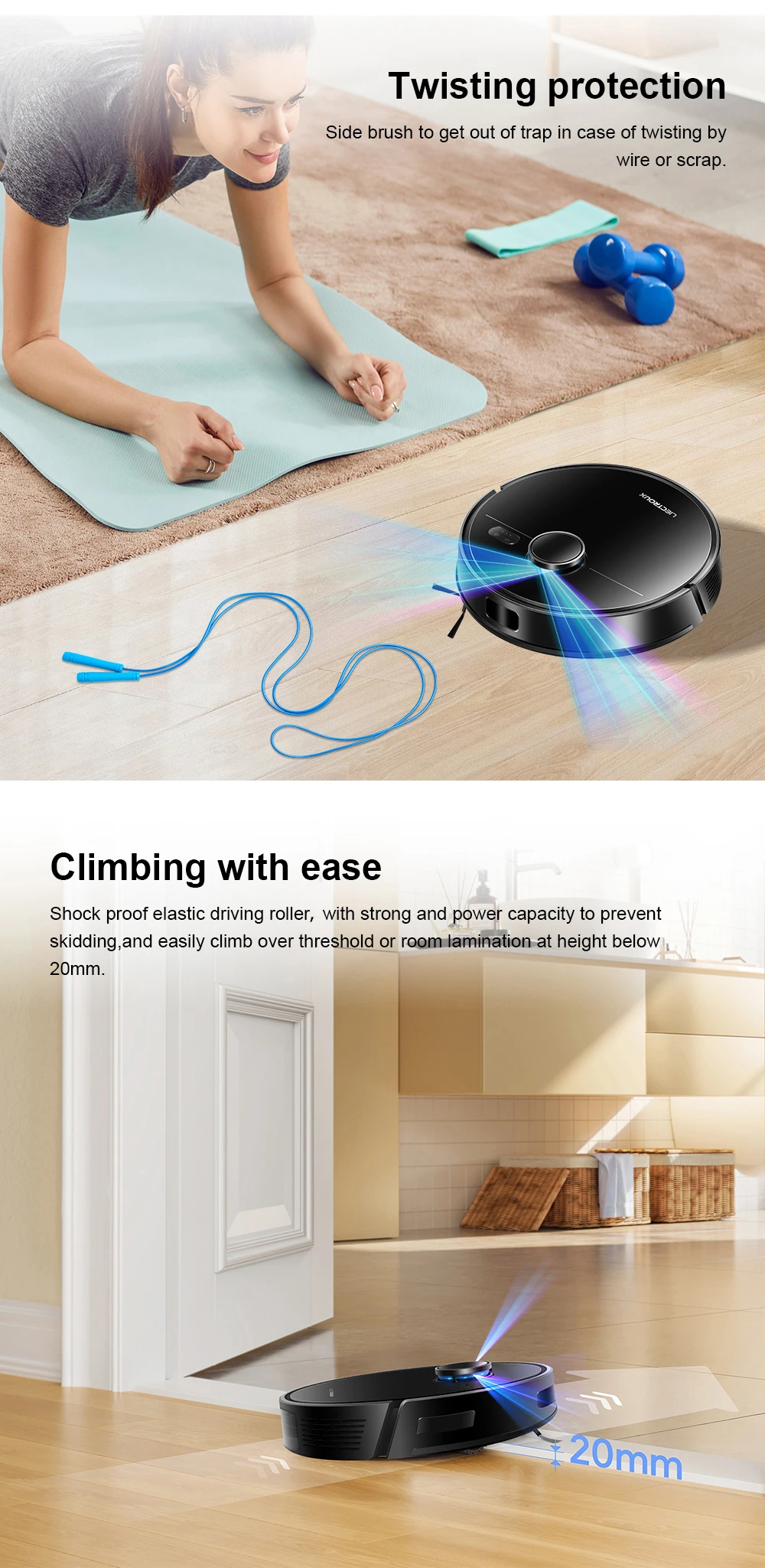 Upgraded off-road wheels allow the robot to easily cross obstacles 18mm, and the climbing support is 15° slope, making it easy to transition from the floor to carpet cleaning, as well as through between rooms.