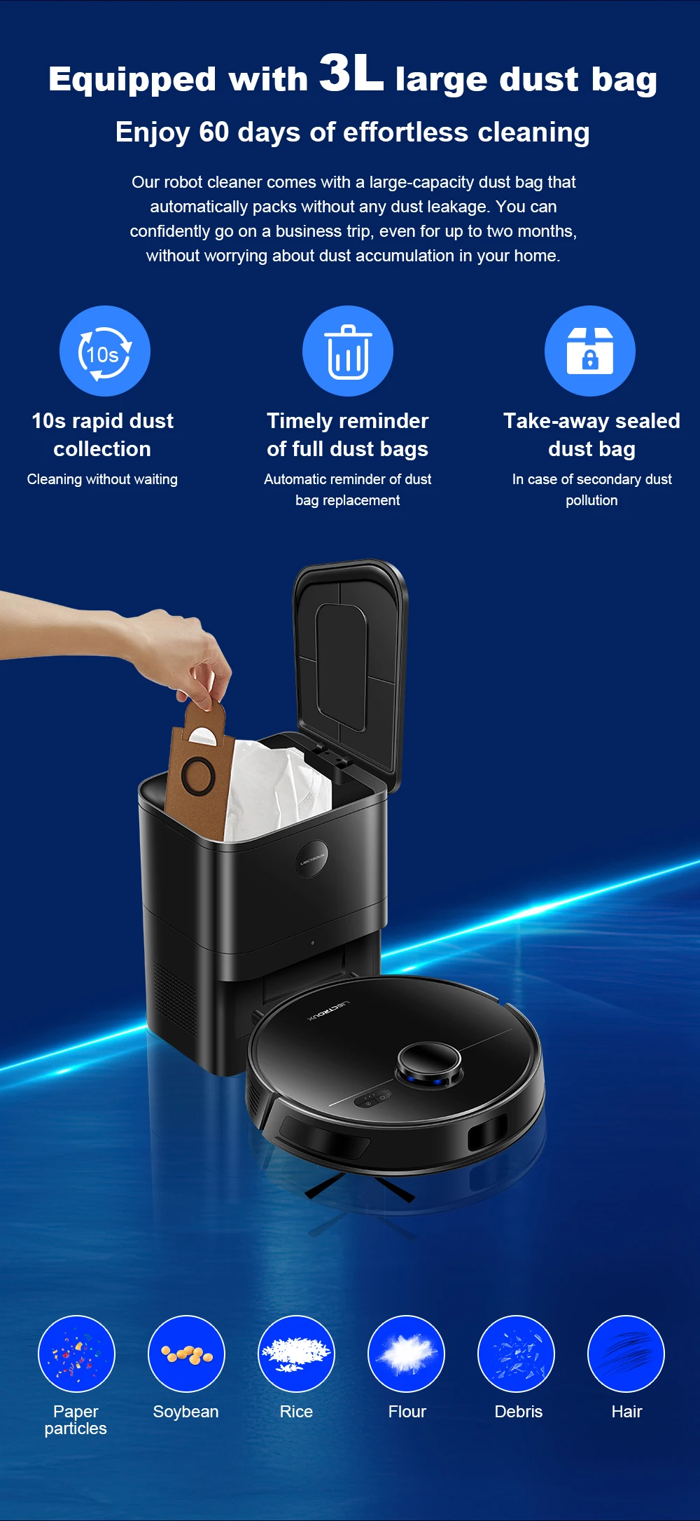 M70 Pro robot vacuum has an automatic emptying base, eliminating the need to manually empty the dustbin after each cleaning. The built-in 3.0L disposable dust bag can store dust and garbage for up to 60 days, and will notify you when the base is full, control the self-cleaning base via the app and adjust the dust collection frequency to your preference. Keep the air in your home fresh, protect your family and baby, perfect for allergy sufferers. *Based on Liectroux lab data, duration varies based on home environment and pets.