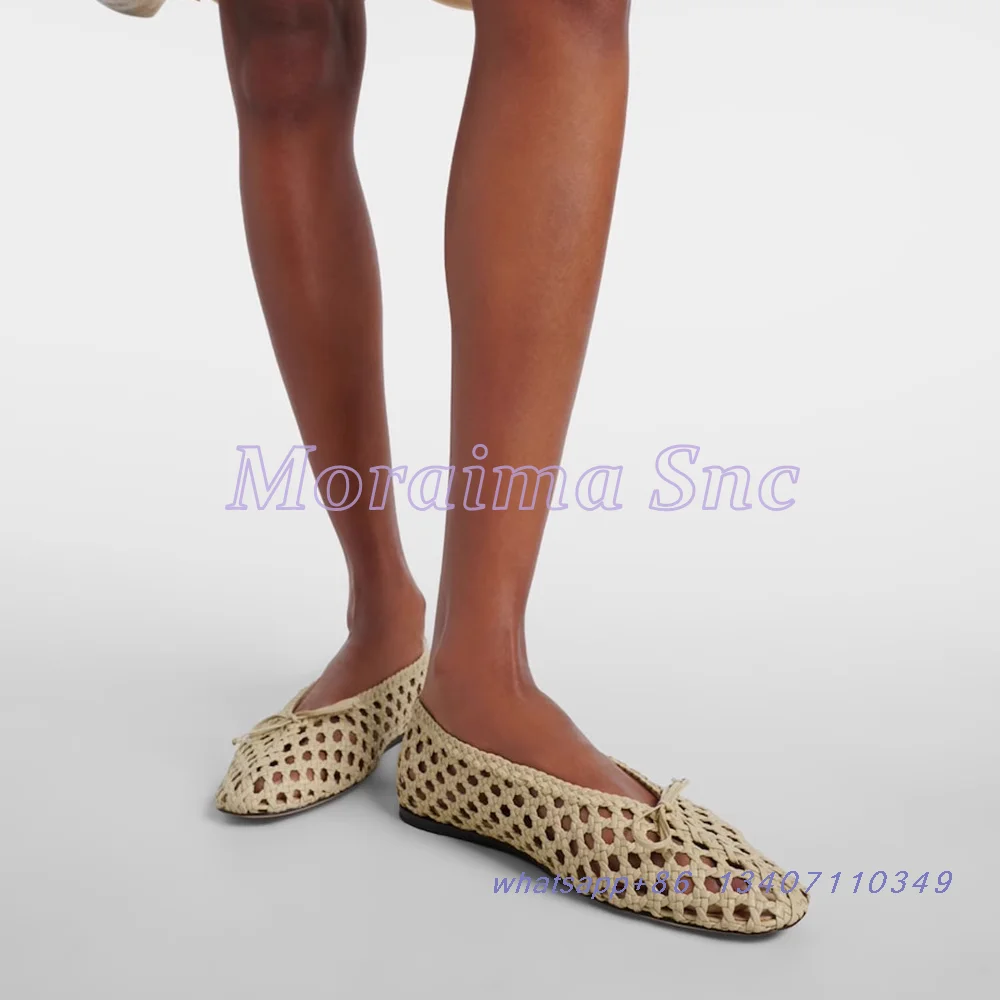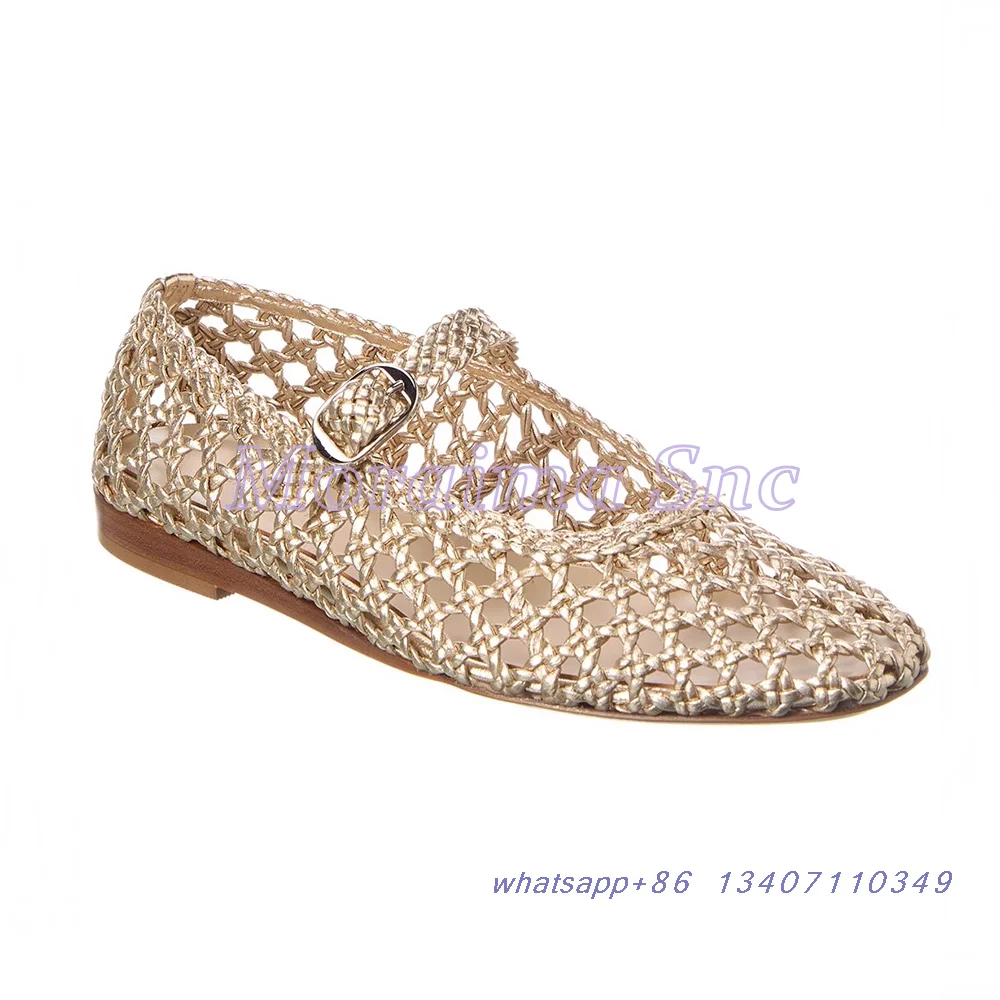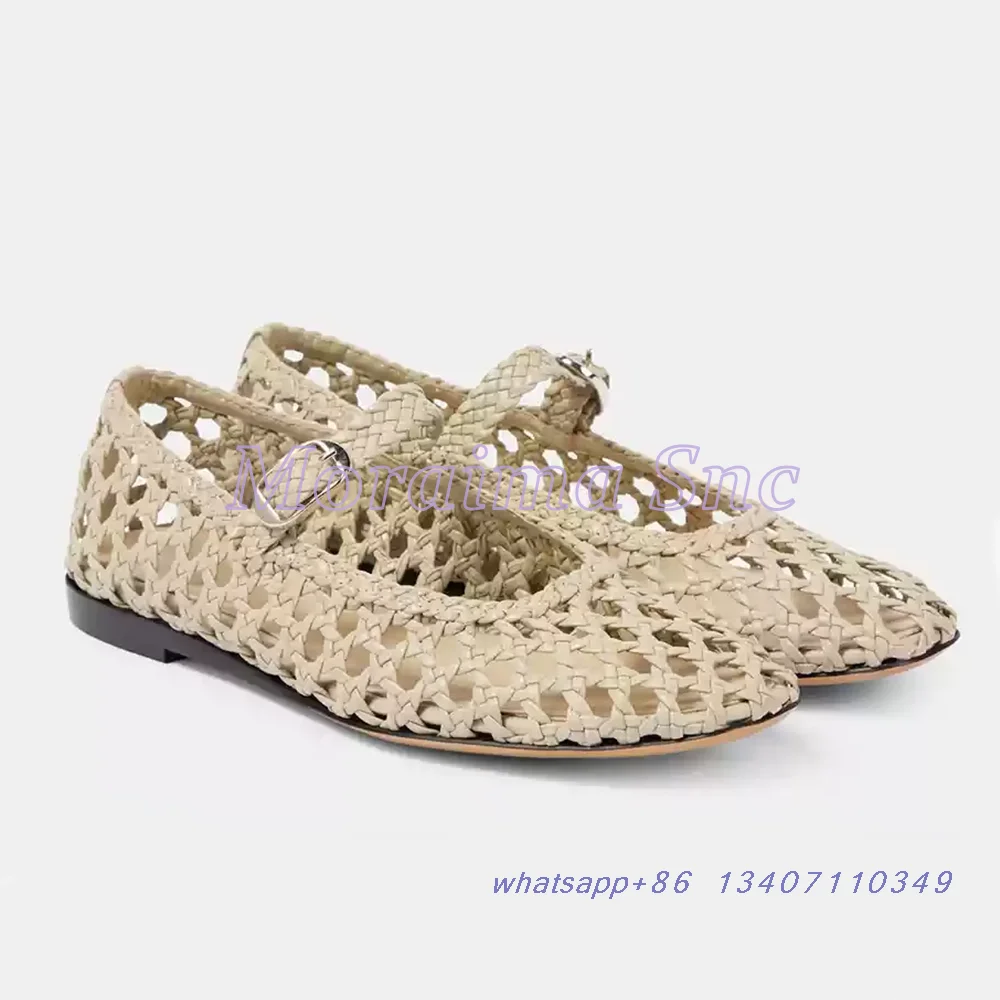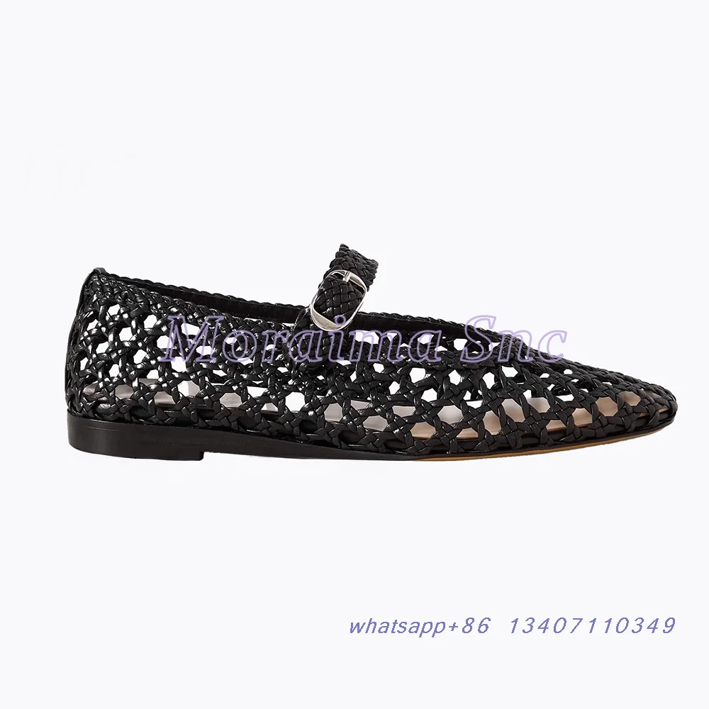 Color: black, Shoe Size: 35 - Hollow Woven Leather Ballet Shoes Flat With Round Toe Ankle Buckle Strap Fashion Shallow Women Shoes Mary Janes Summer New 2025