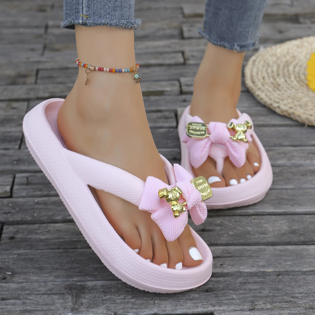 Color: black, Shoe Size: 36-37 - Summer Multi Color Women's Flip Flops Fashionable Metallic Teddy Bear Bow Slide Sandal Beach Vacation Home Versatile Footwear