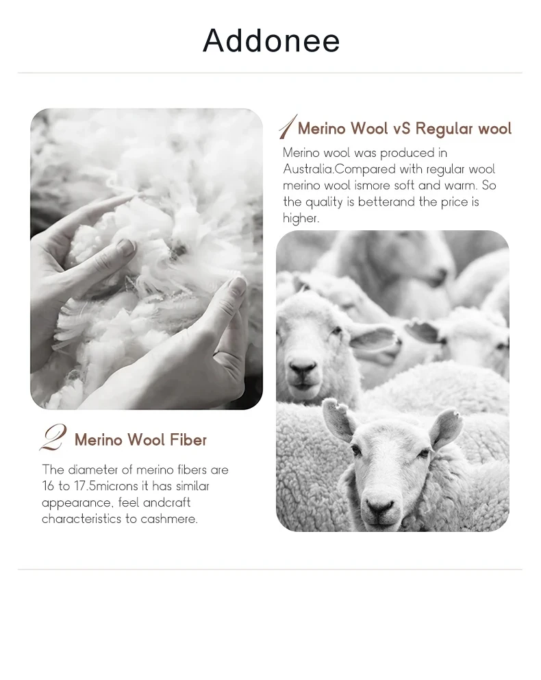 *Merino wool is 100% natural product, Merino Wool is an entirely natural, renewable and biodegradable fiber that comes from the Merino breed of sheep. Merino wool is softer and lighter than traditional wool because the fibers from Merino sheep are finer and smoother. As a result, the fabric is thinner and buttery soft next-to-skin (unlike the scratchy feeling you may typically associate with wool).