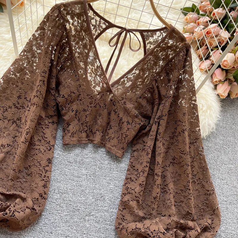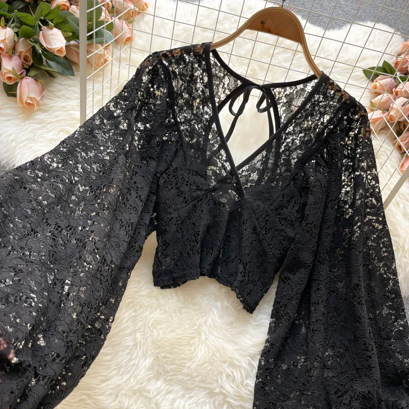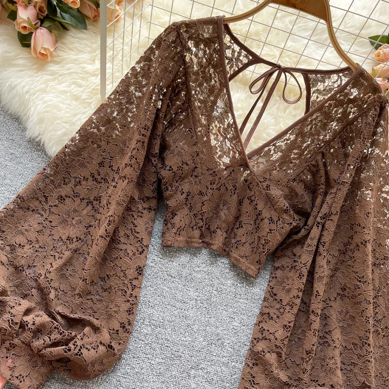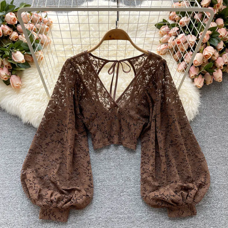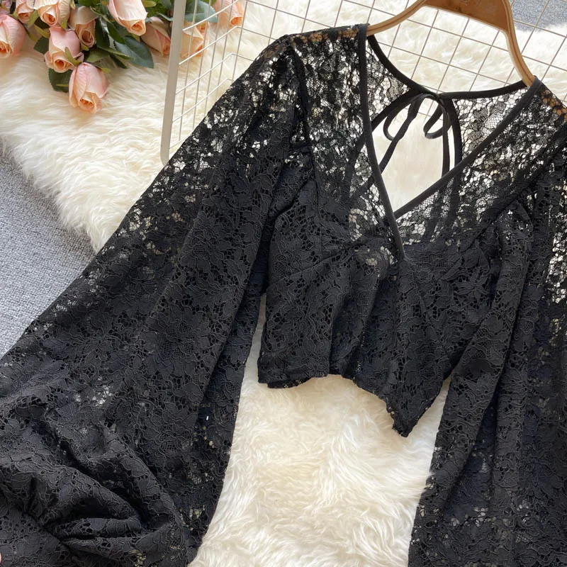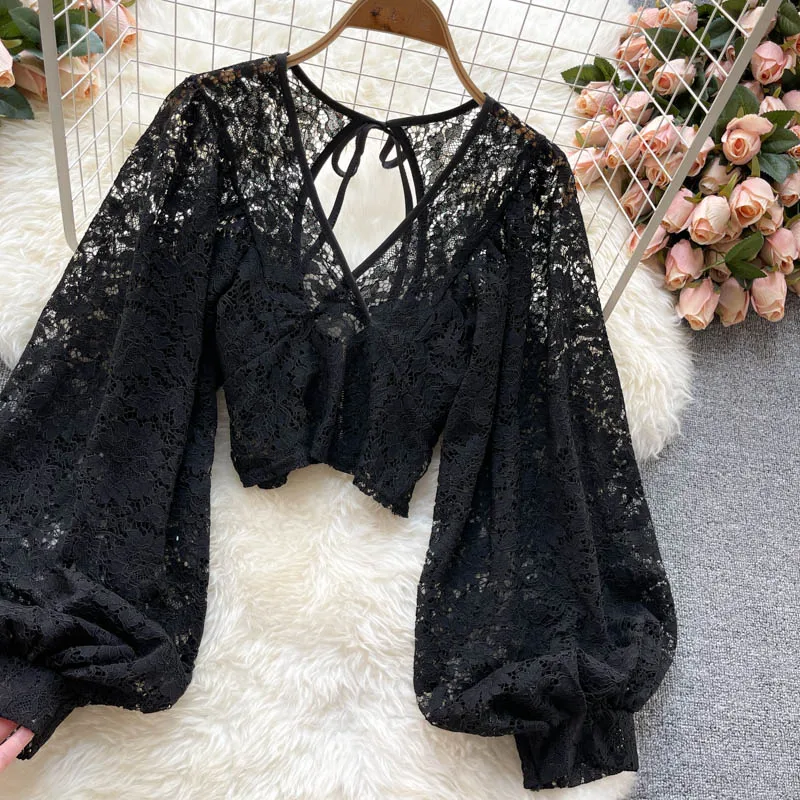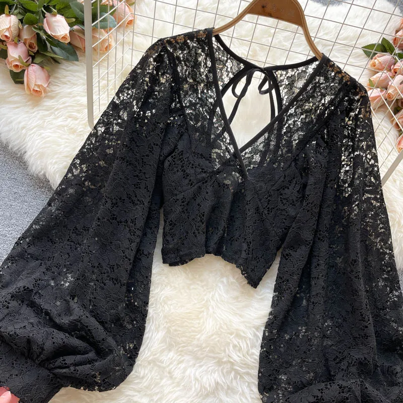 Color: black, Size: One Size - Autumn Black/White/Brown Sexy Lace Blouse Women Elegant V-Neck Puff Long Sleeve Open Back Short Tops Female Party Blusas 2021