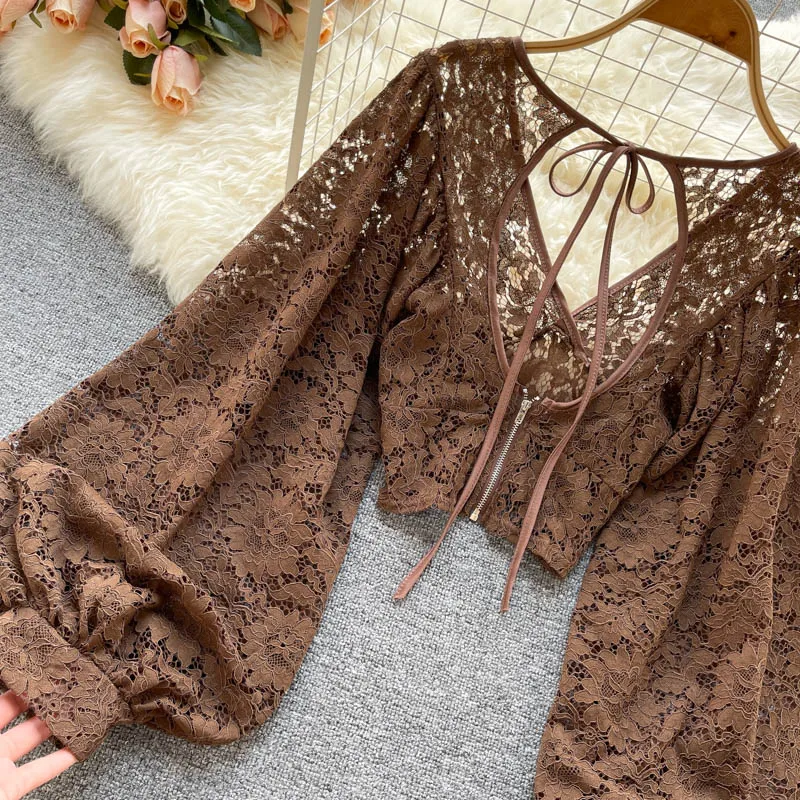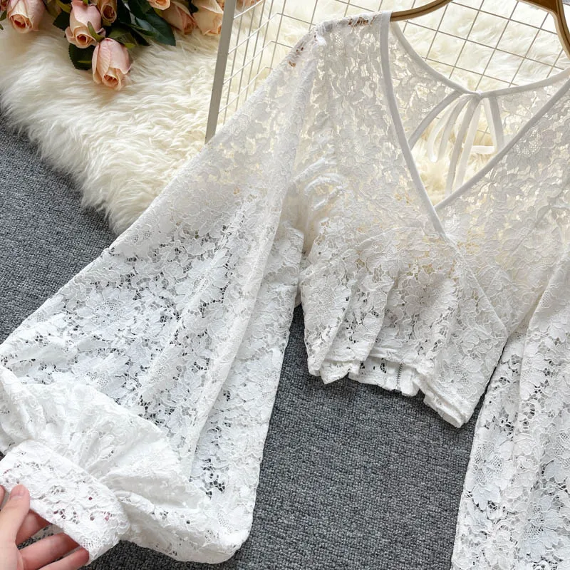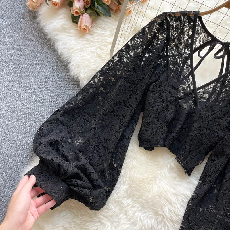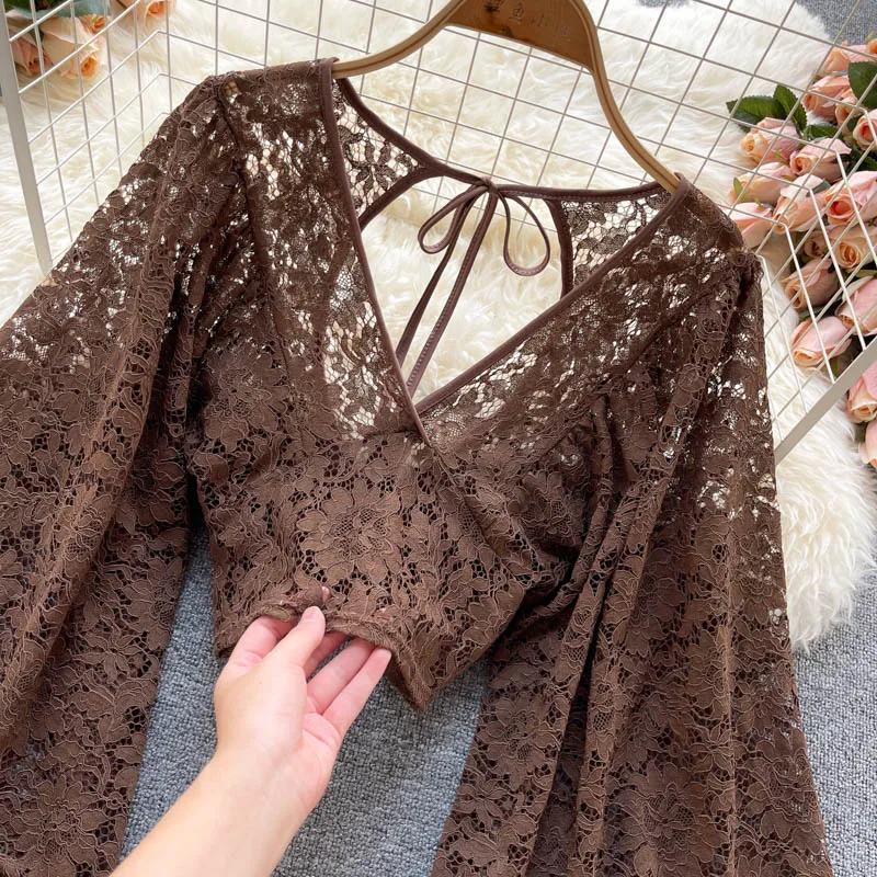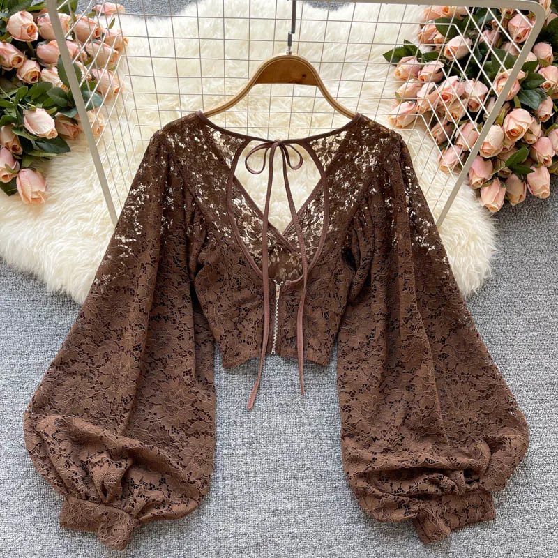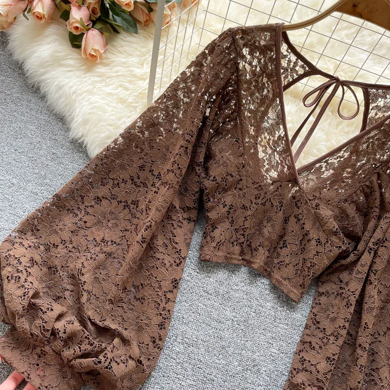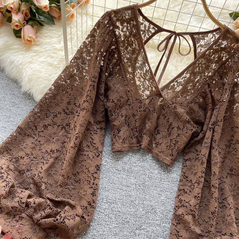 Color: black, Size: One Size - Autumn Black/White/Brown Sexy Lace Blouse Women Elegant V-Neck Puff Long Sleeve Open Back Short Tops Female Party Blusas 2021