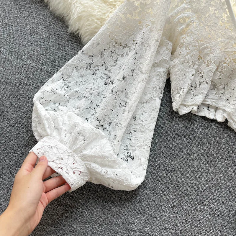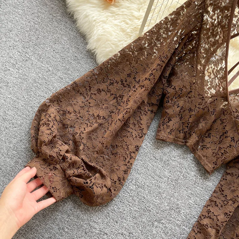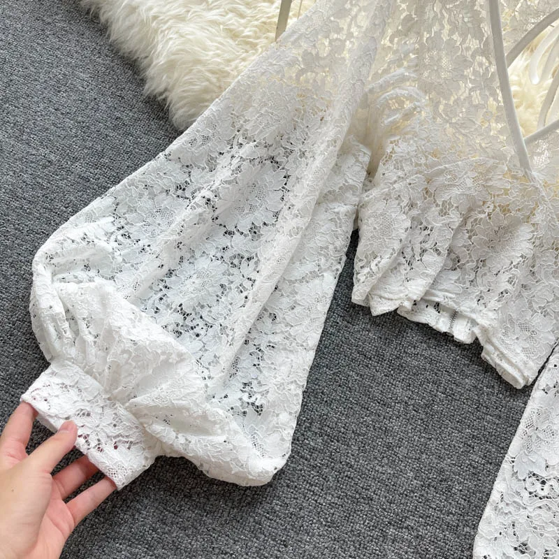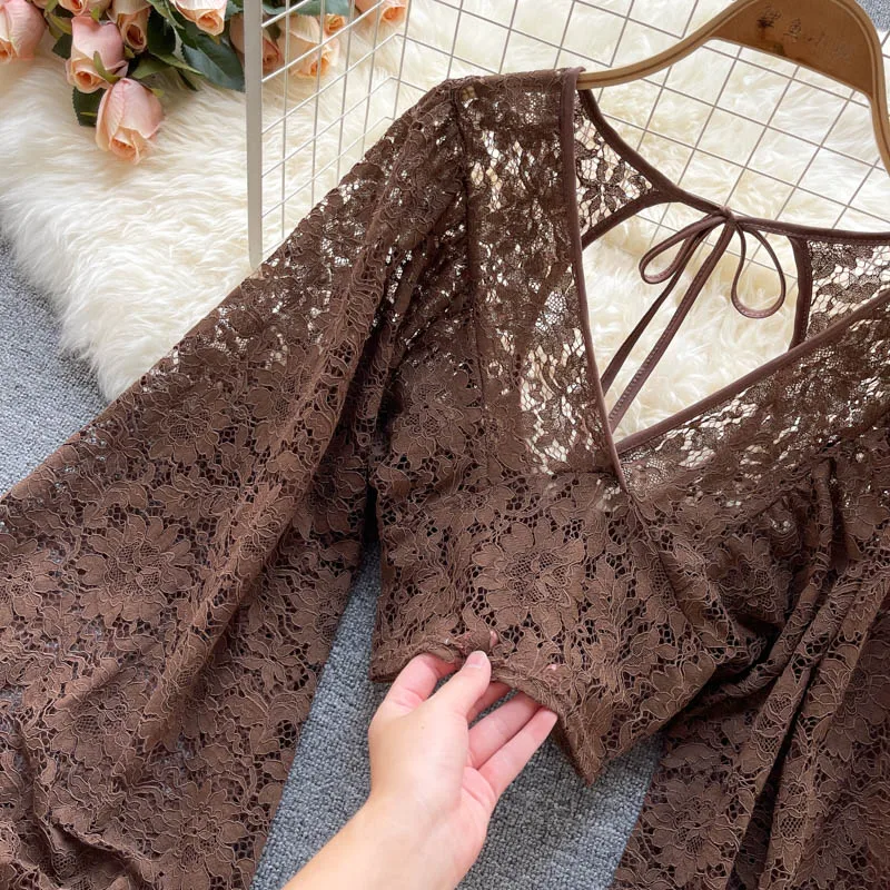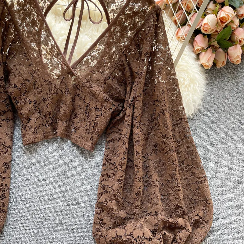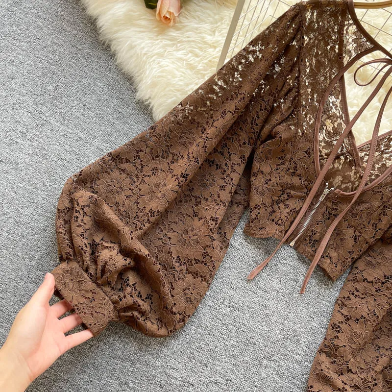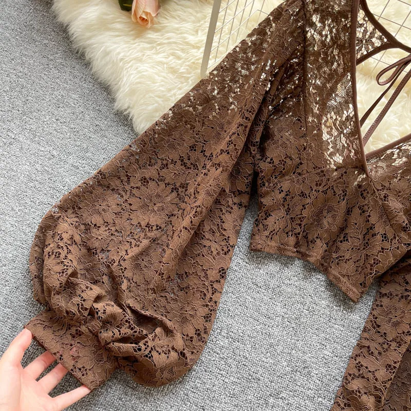 Color: black, Size: One Size - Autumn Black/White/Brown Sexy Lace Blouse Women Elegant V-Neck Puff Long Sleeve Open Back Short Tops Female Party Blusas 2021