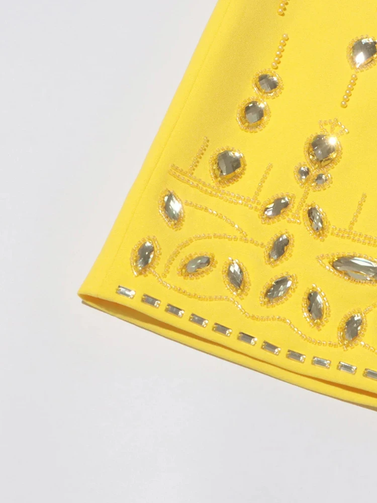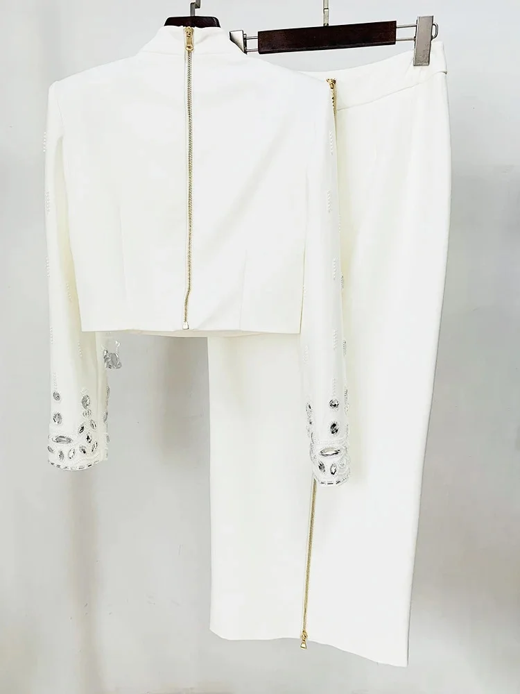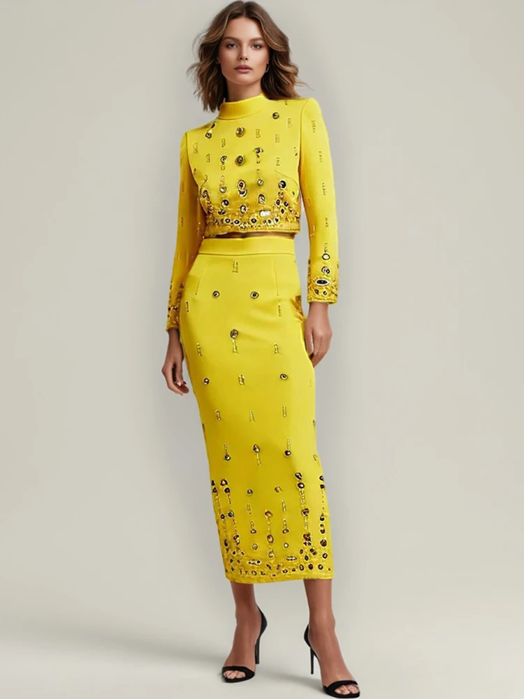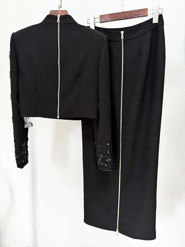 Color: black, Size: S - Spliced Diamonds Two Piece Set For Women Stand Collar Long Sleeve Tops High Waist Skirt Elegant Chic Set Female Fashion New