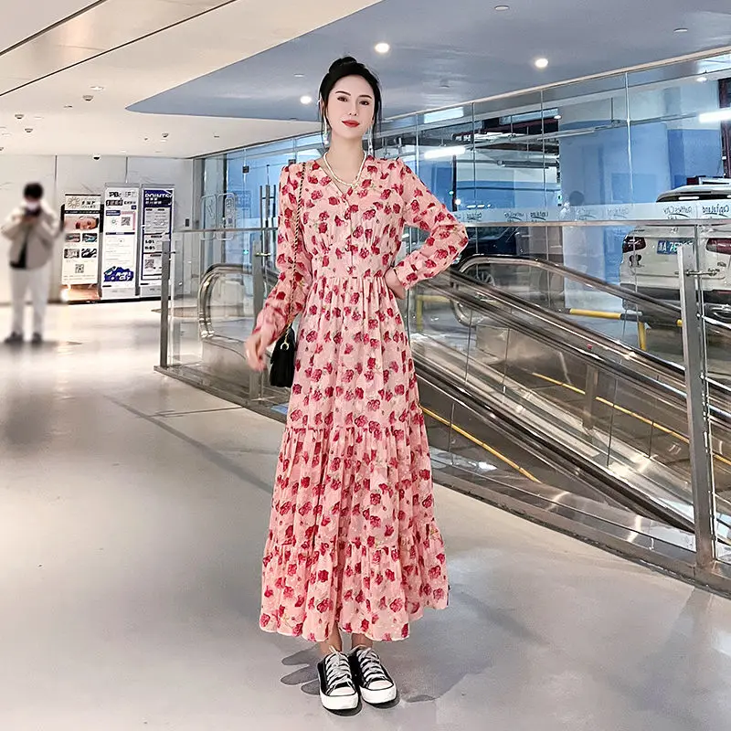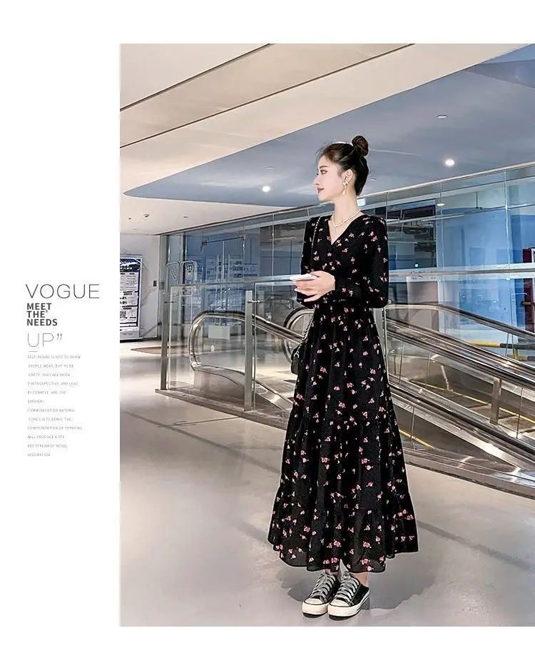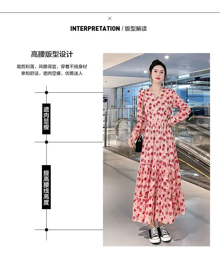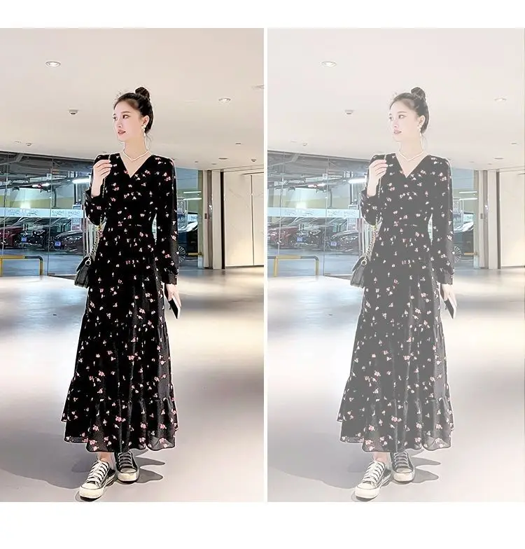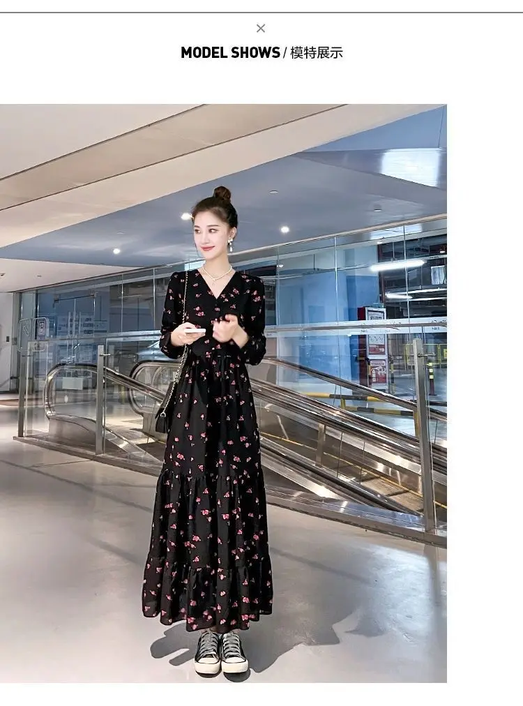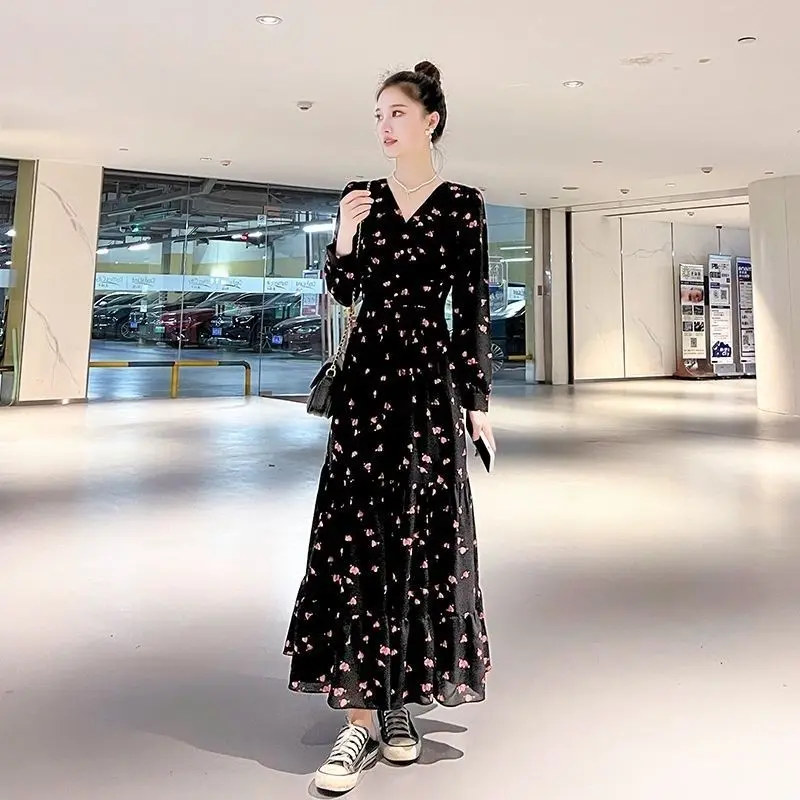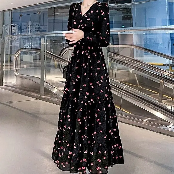 Color: black, Size: XL - Chiffon floral dress 2024 spring/summer new high waisted slimming knee length skirt light luxury French style large skirt 3FWF