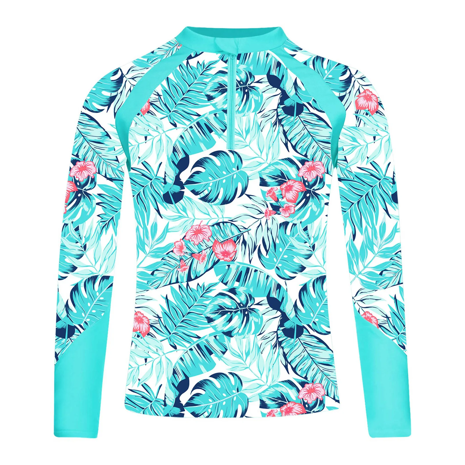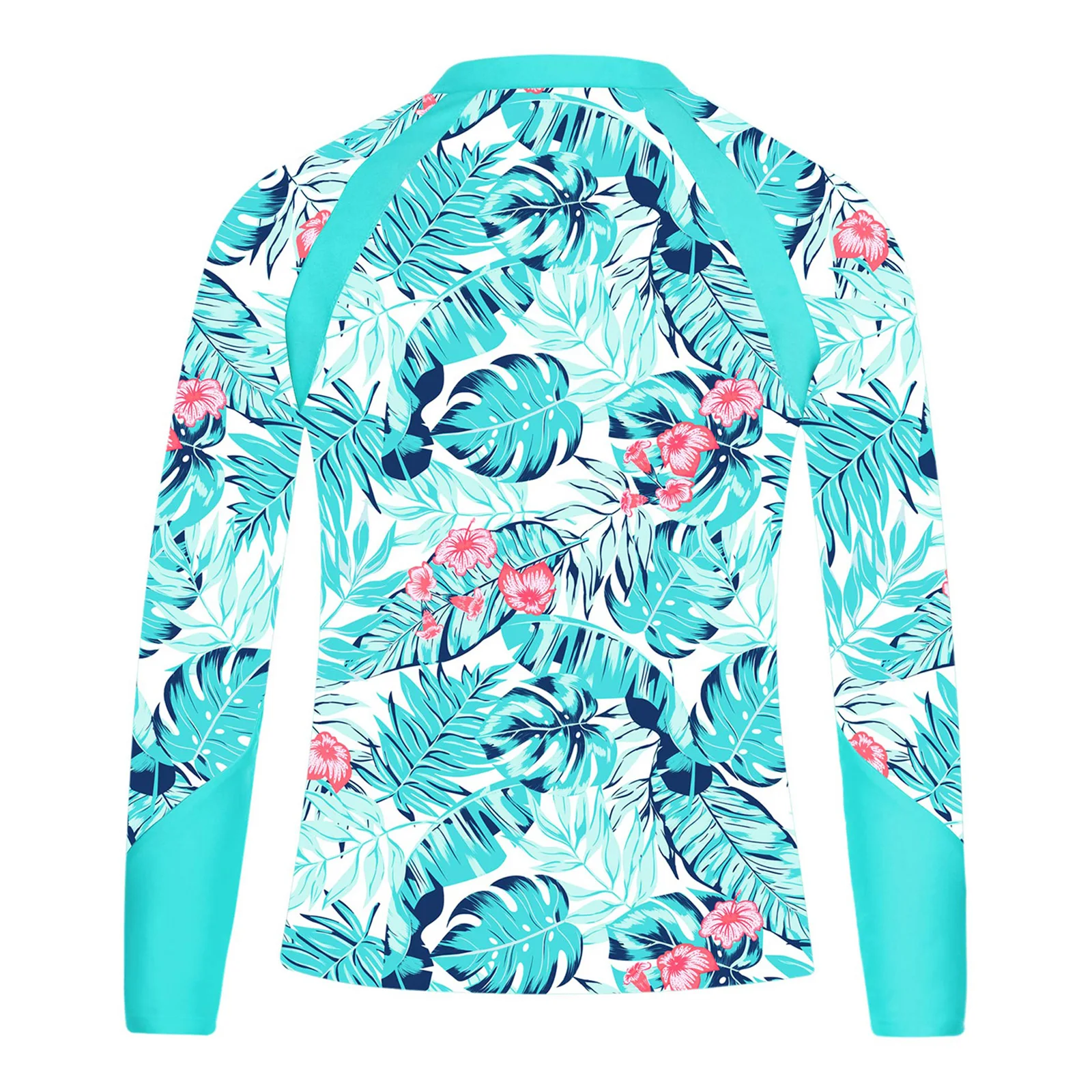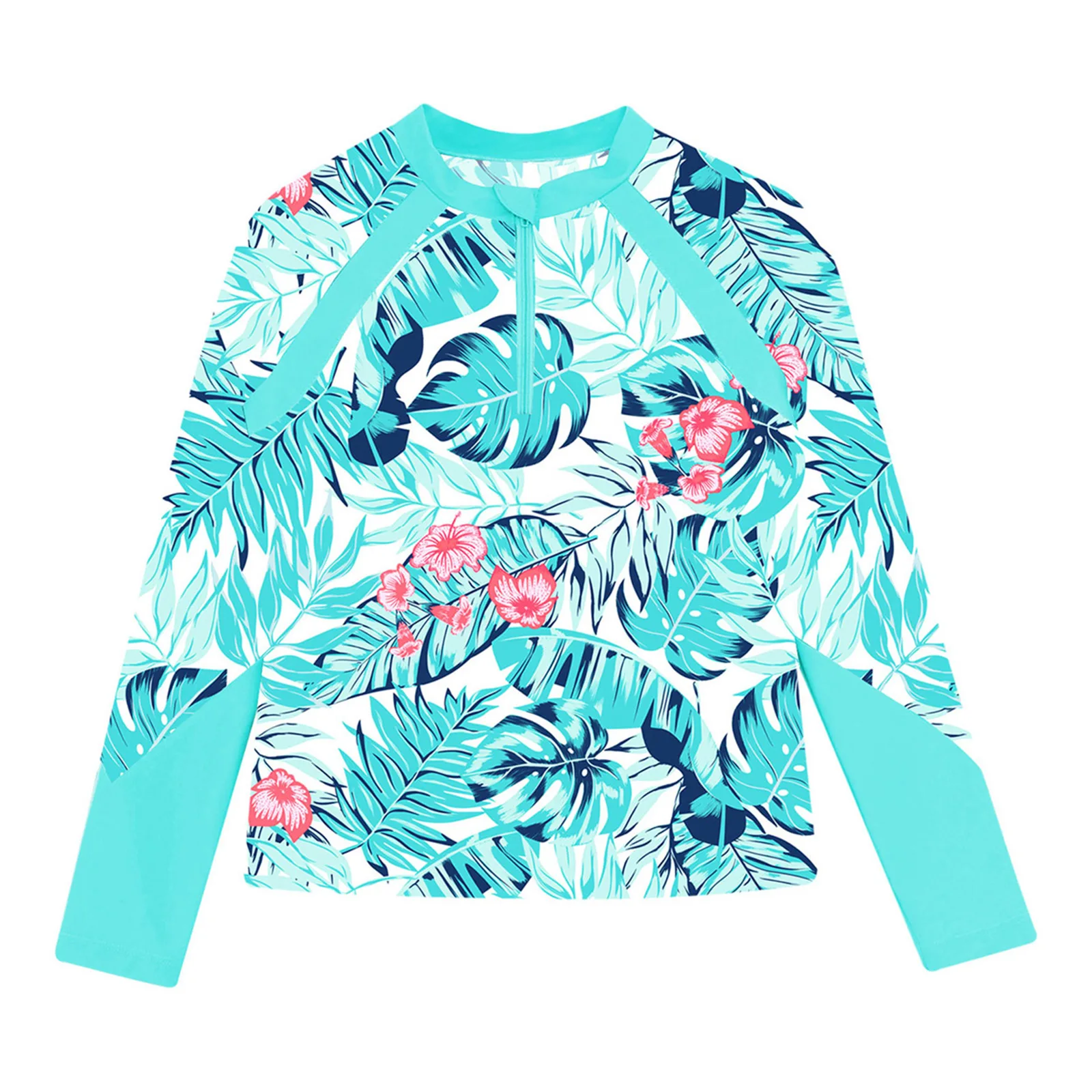 A long sleeve swim top for girls, vibrant print makes girls looks more energetic and beautiful at beach.