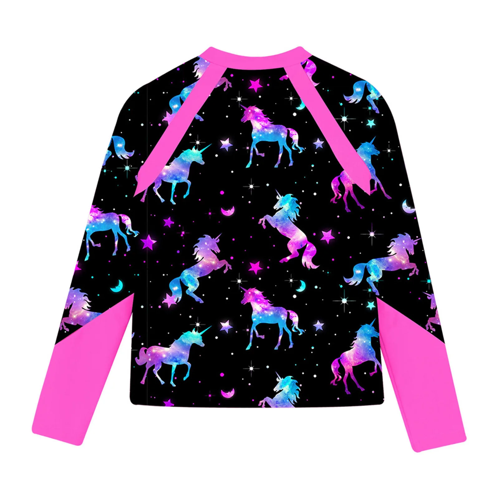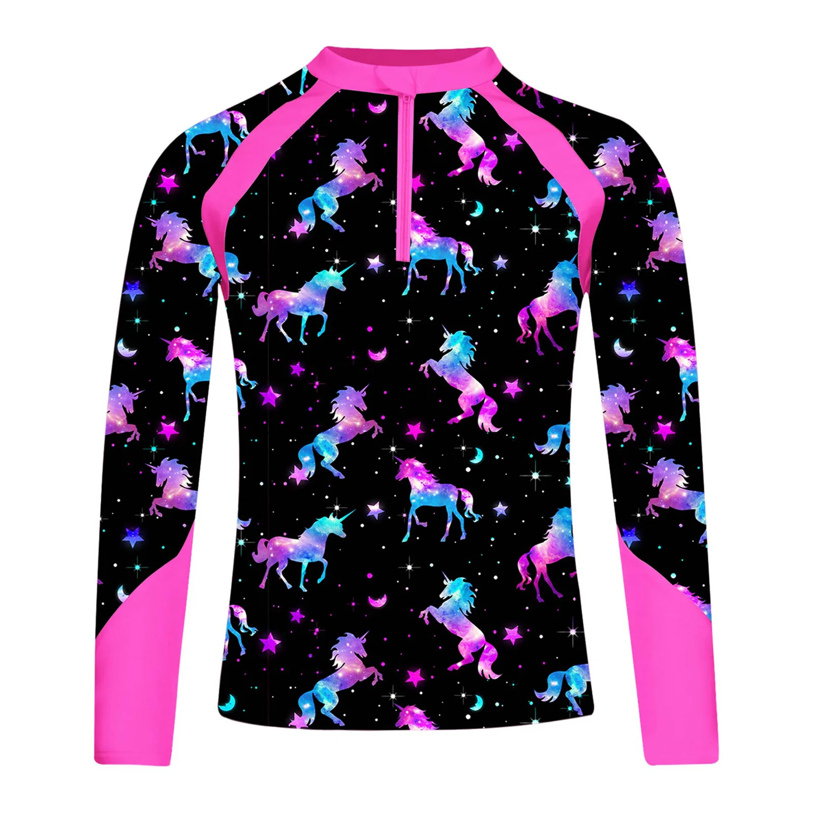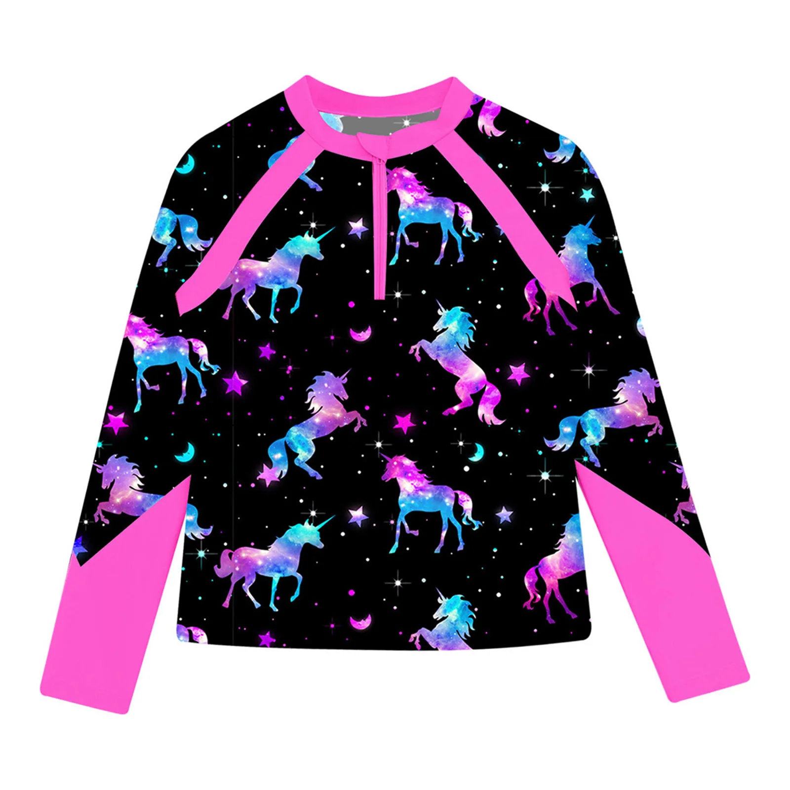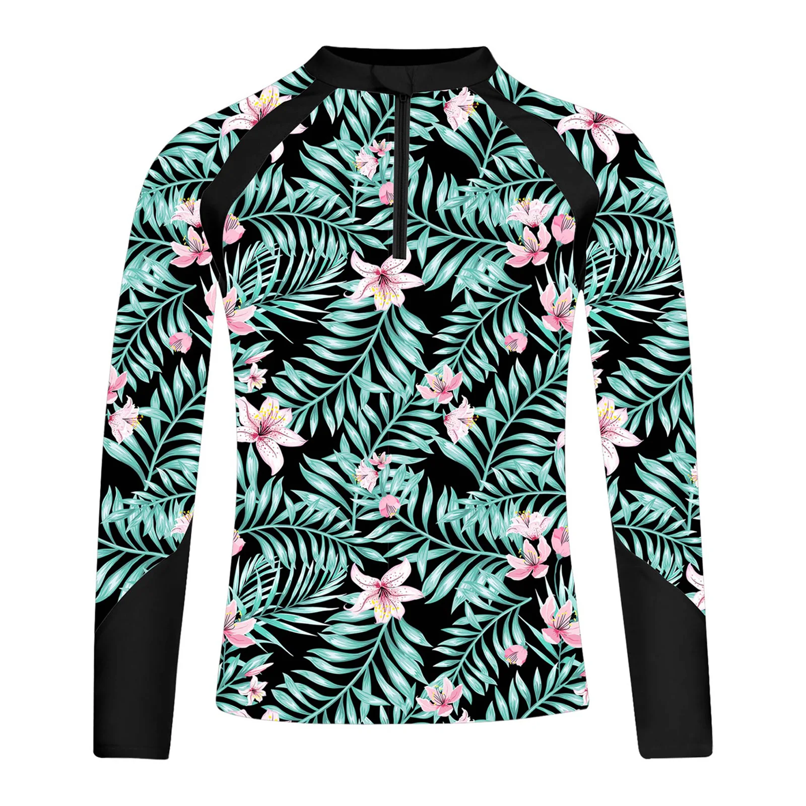A long sleeve swim top for girls, vibrant print makes girls looks more energetic and beautiful at beach.