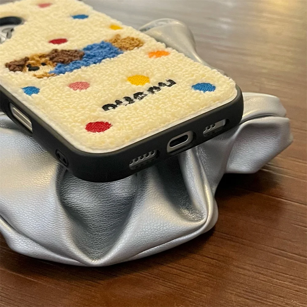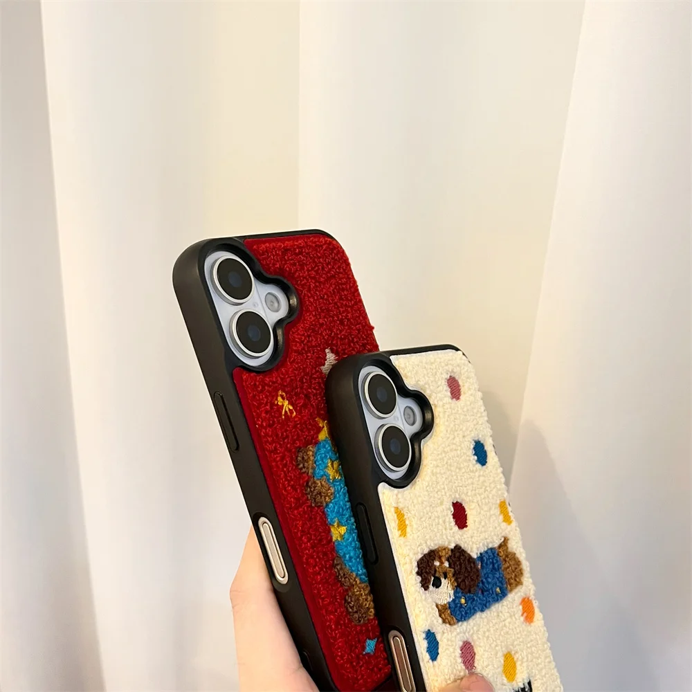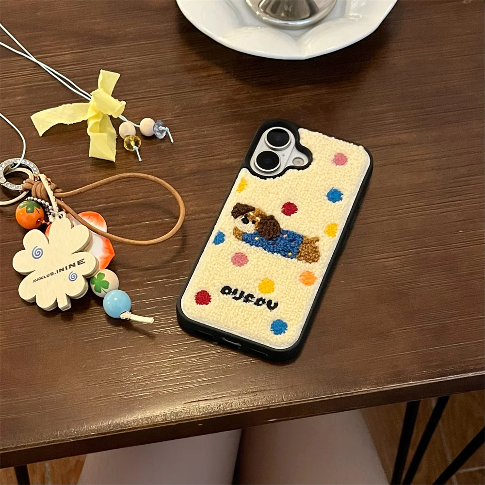 Color: Blue, Material: Acrylic - Luxury Cartoon Embroidery Cute Dog Cats Colorful Dots Phone Case For iPhone 13 14 15 16 Pro Max Plush Winter Shockproof Cover