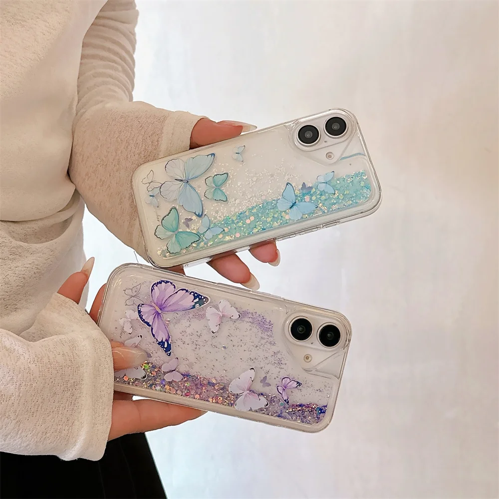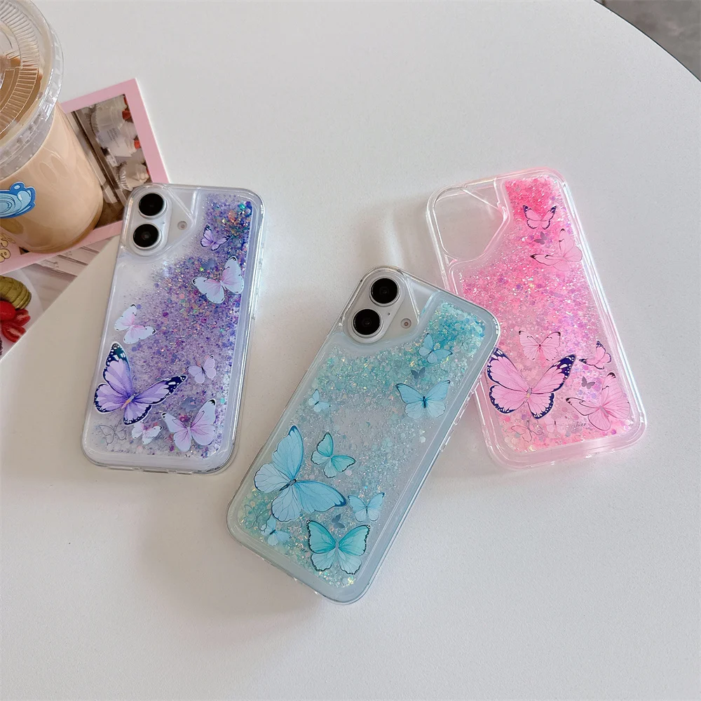 Color: Blue, Material: Plastic - Luminous Quicksand Glitter Butterfly Case for iPhone 16 15 14 Pro Max Plus 13 12 Mini 11 X Xs XR Soft Silicone Bling Shiny Cover