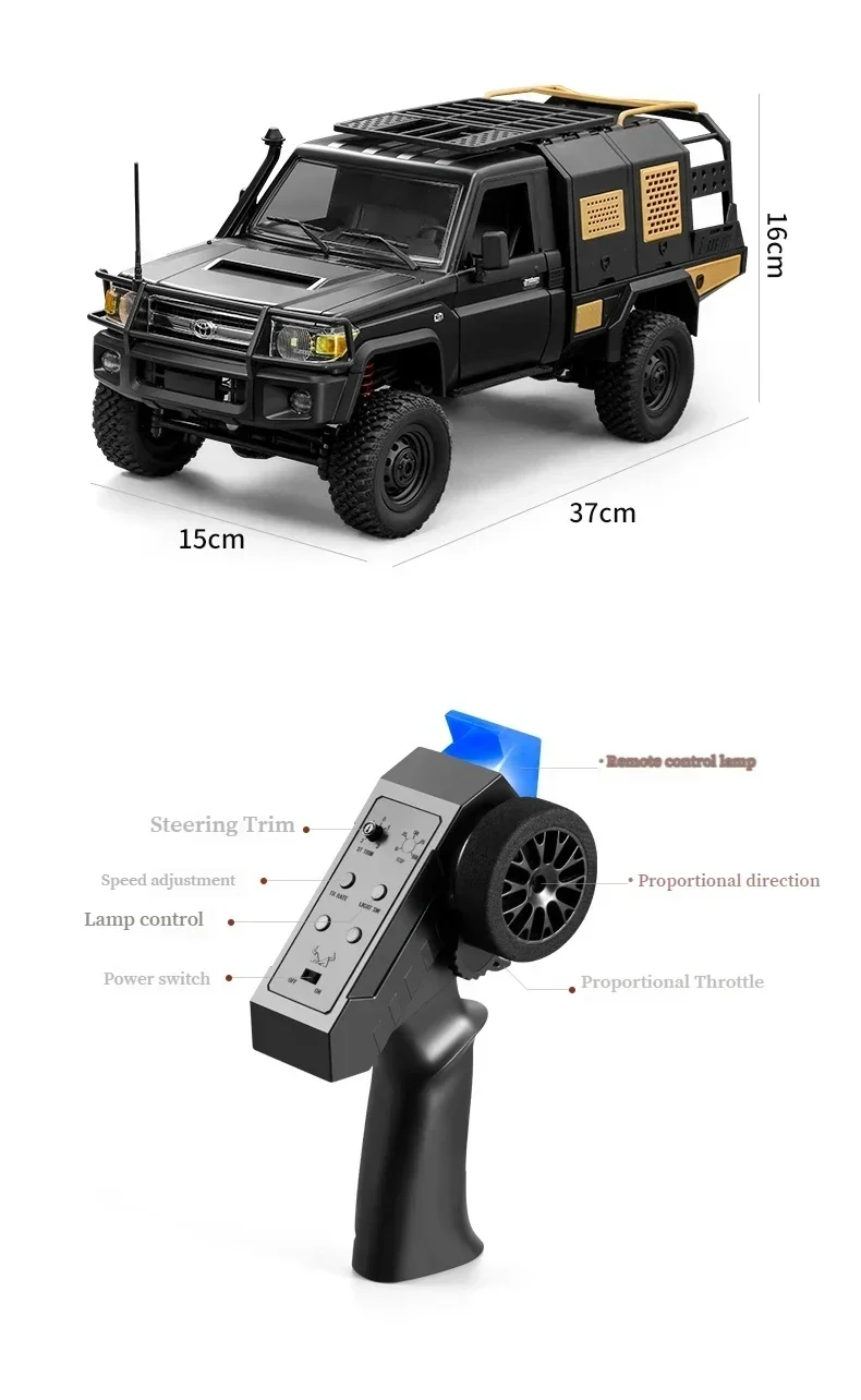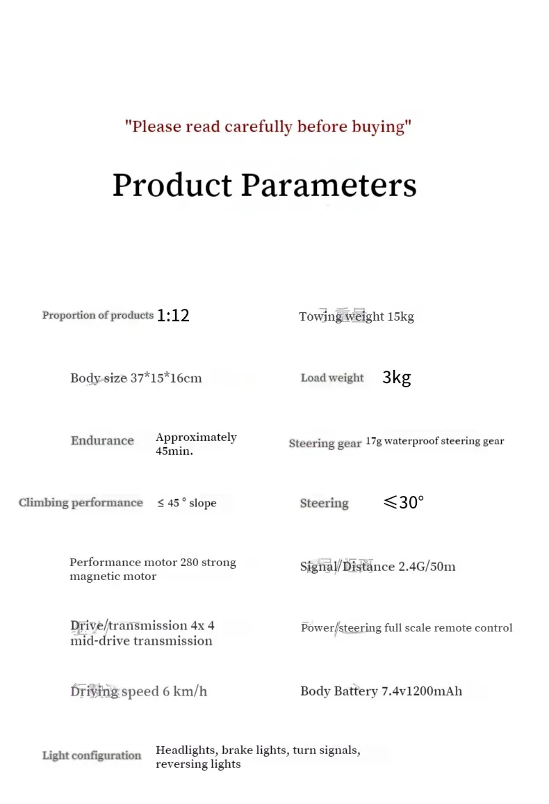● Functions: Forward, backward, left turn, right turn, proportional remote control, two-stage transmission, remote control to control headlights