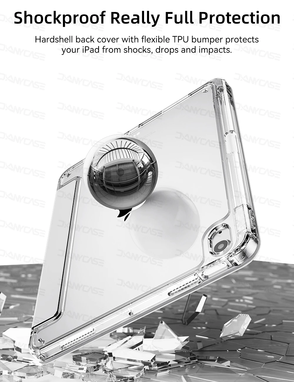 Hardshell back cover with flexible TPU bumper protects your iPad from shocks, drops and impacts.