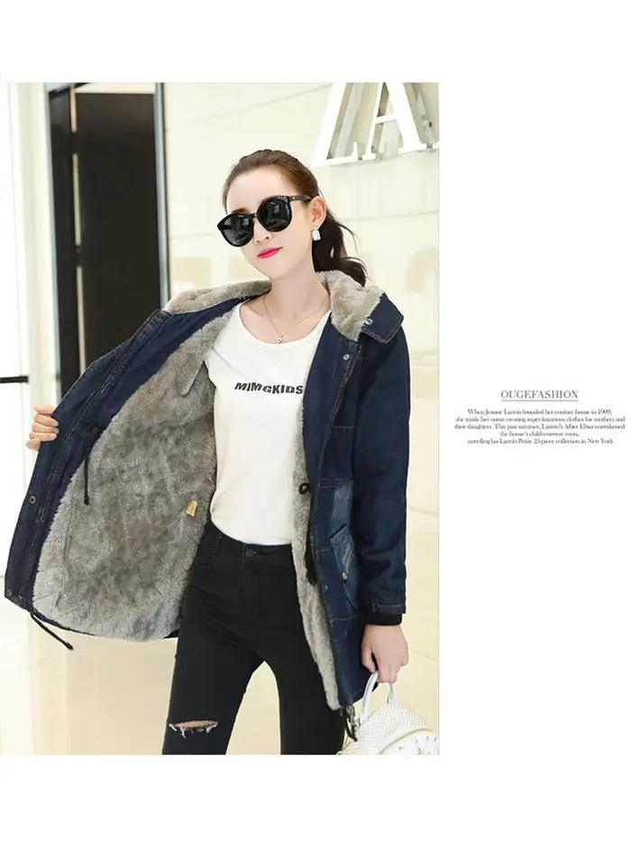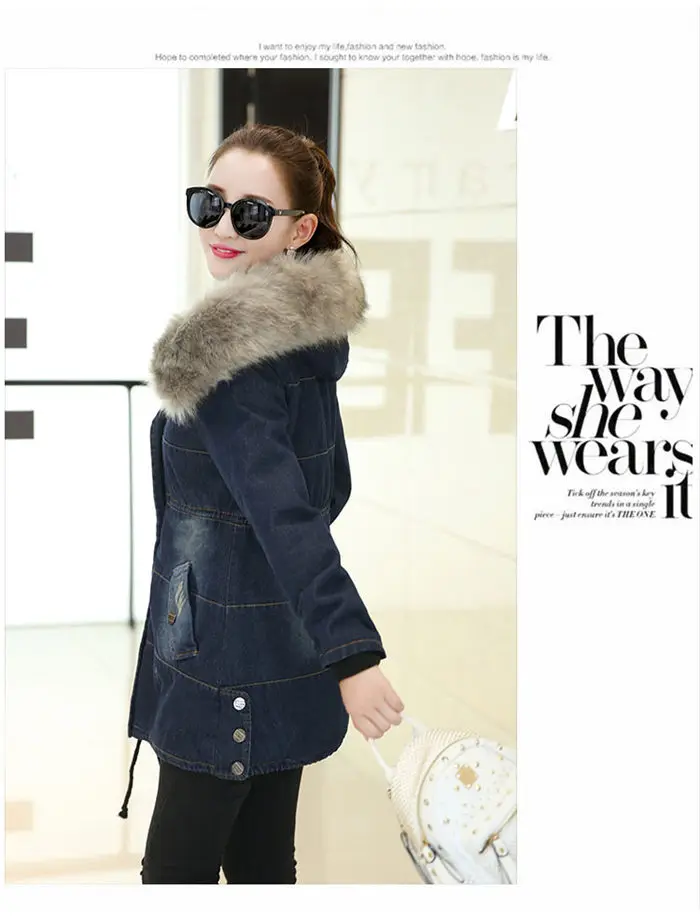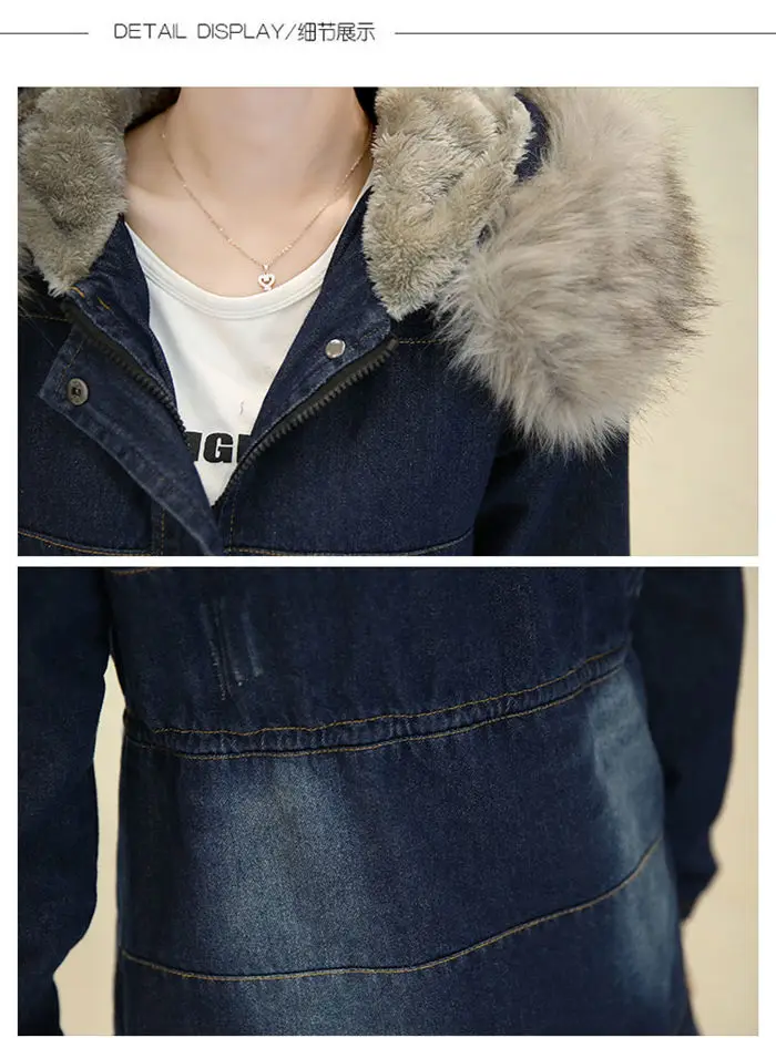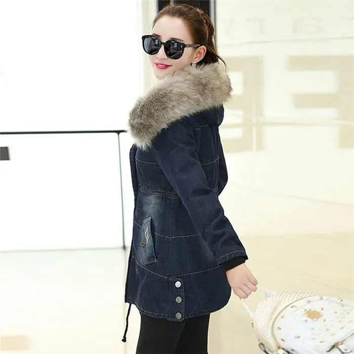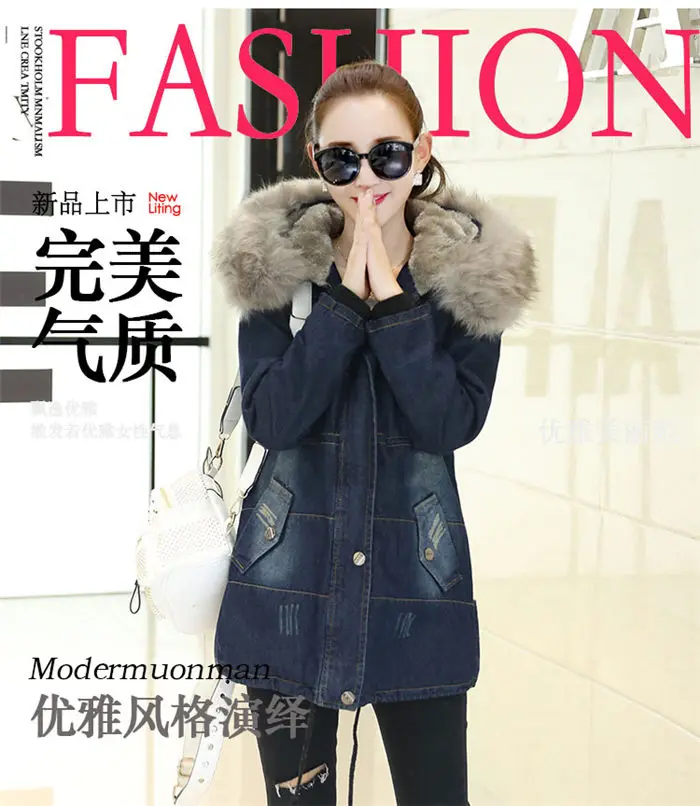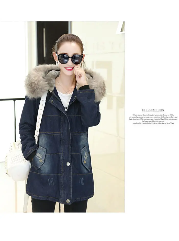 Color: Blue, Size: L - 2019 New Plus Velvet Padded Coat Women Winter Denim Jacket With Large Fur Collar Denim Jacket Hooded Warm Cotton Clothing f1911
