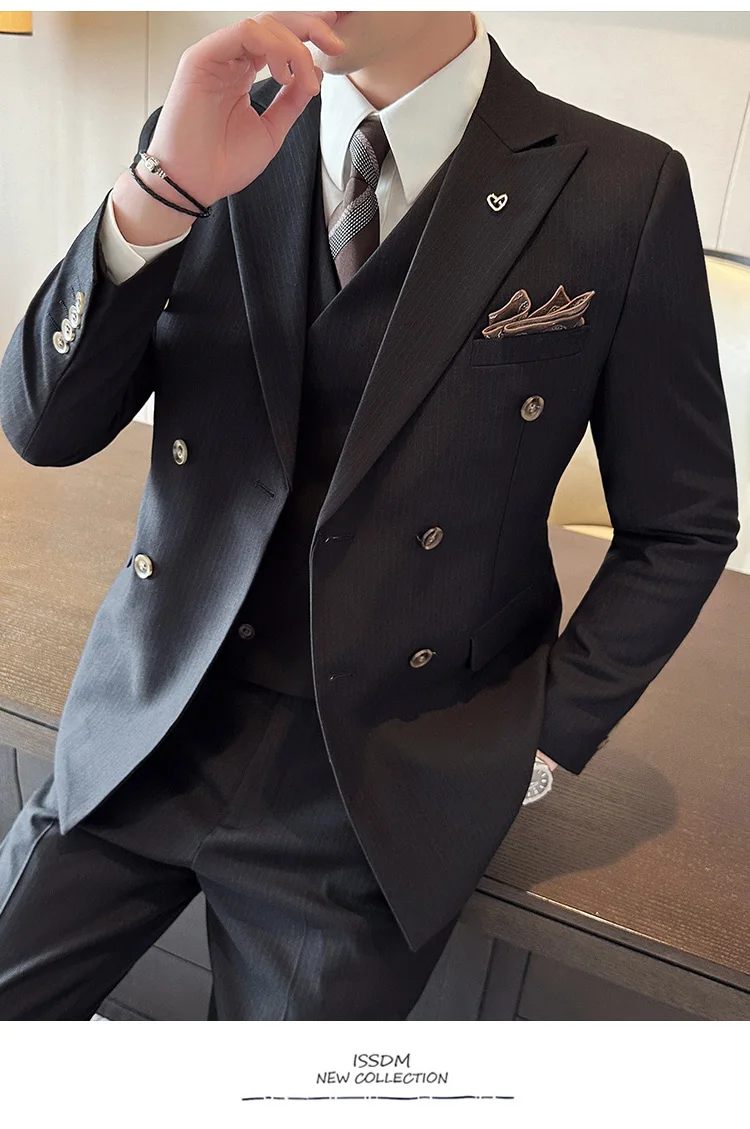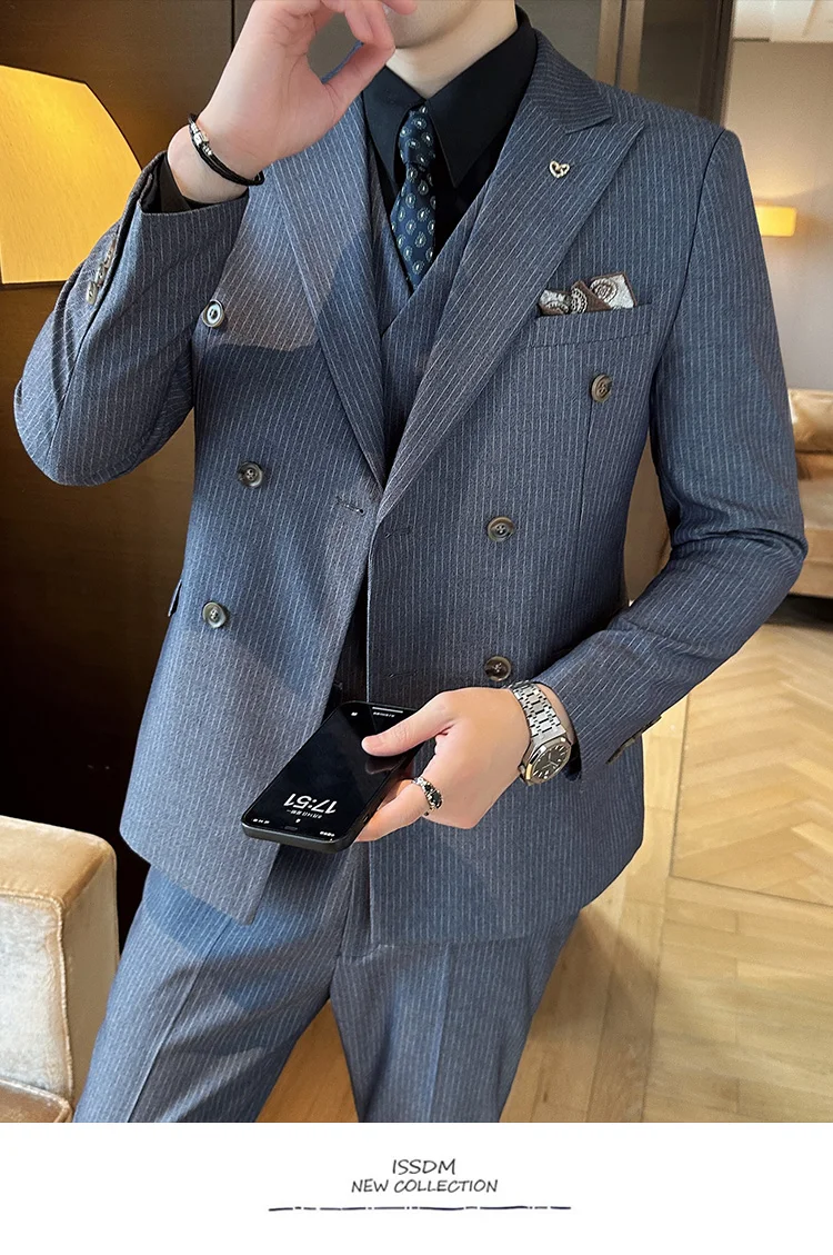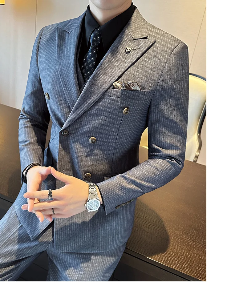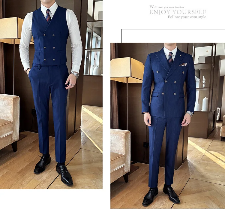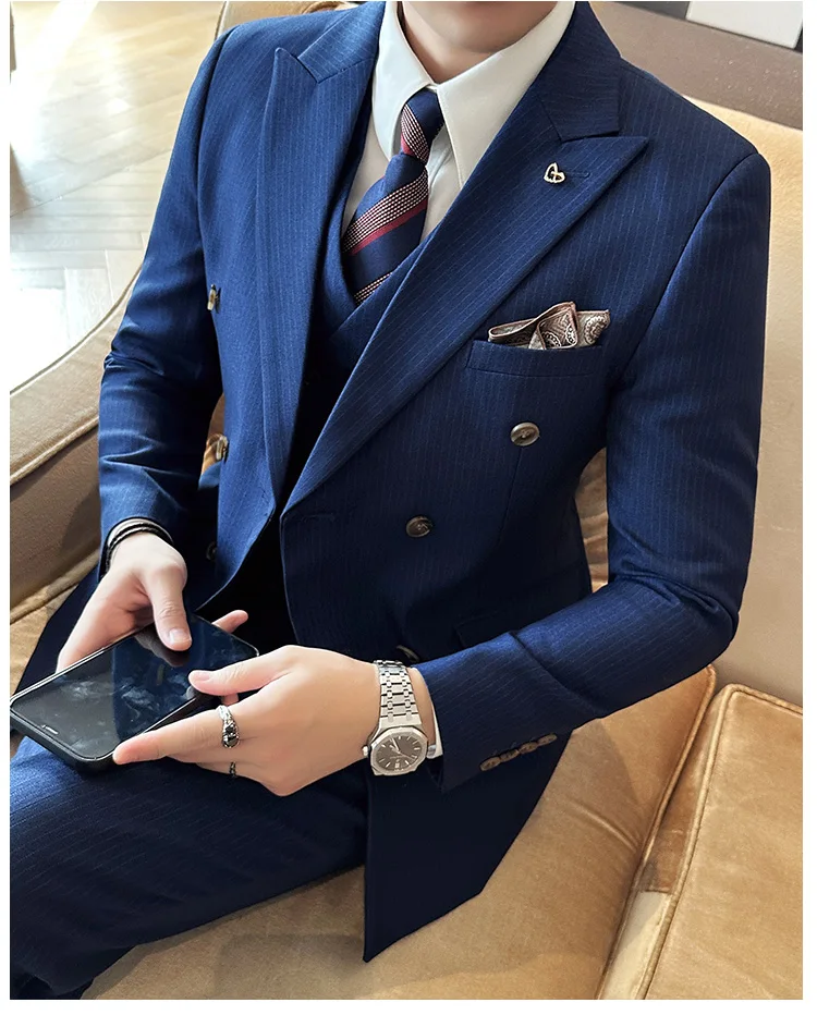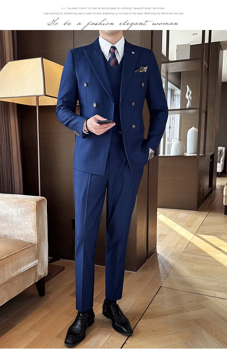 Color: Blue, Size: L - 2025 Men's Double Breasted 3/2 Piece Business Casual Wedding Dress Suit with Trousers Regular Fit Bridegroom High Sense