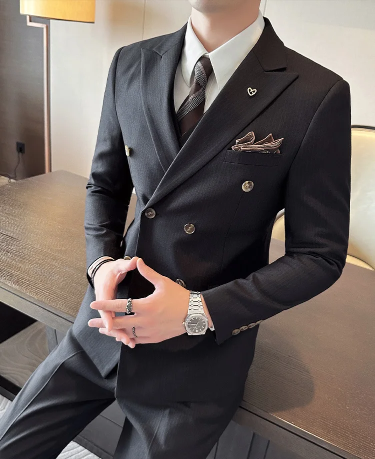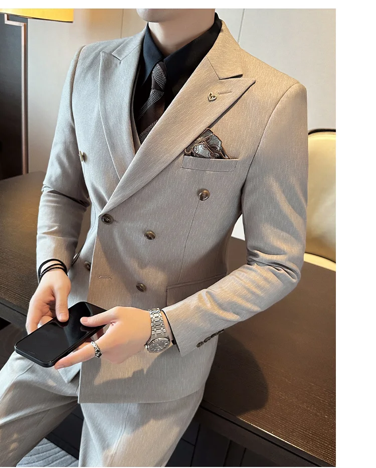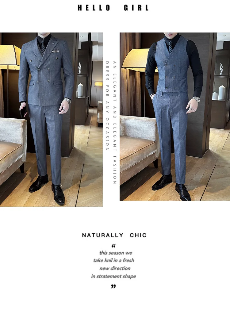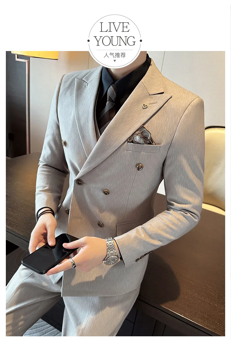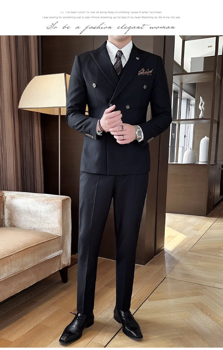 Color: Blue, Size: L - 2025 Men's Double Breasted 3/2 Piece Business Casual Wedding Dress Suit with Trousers Regular Fit Bridegroom High Sense