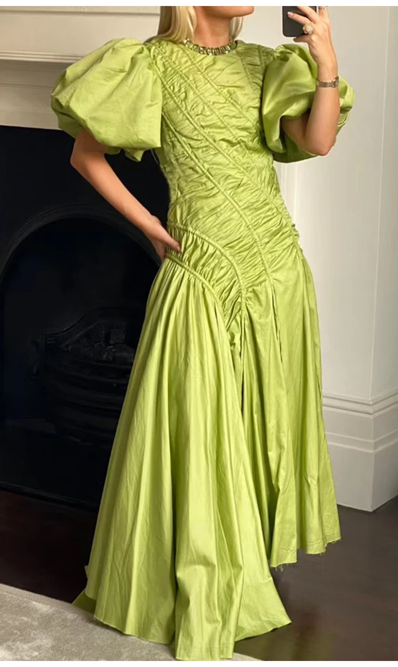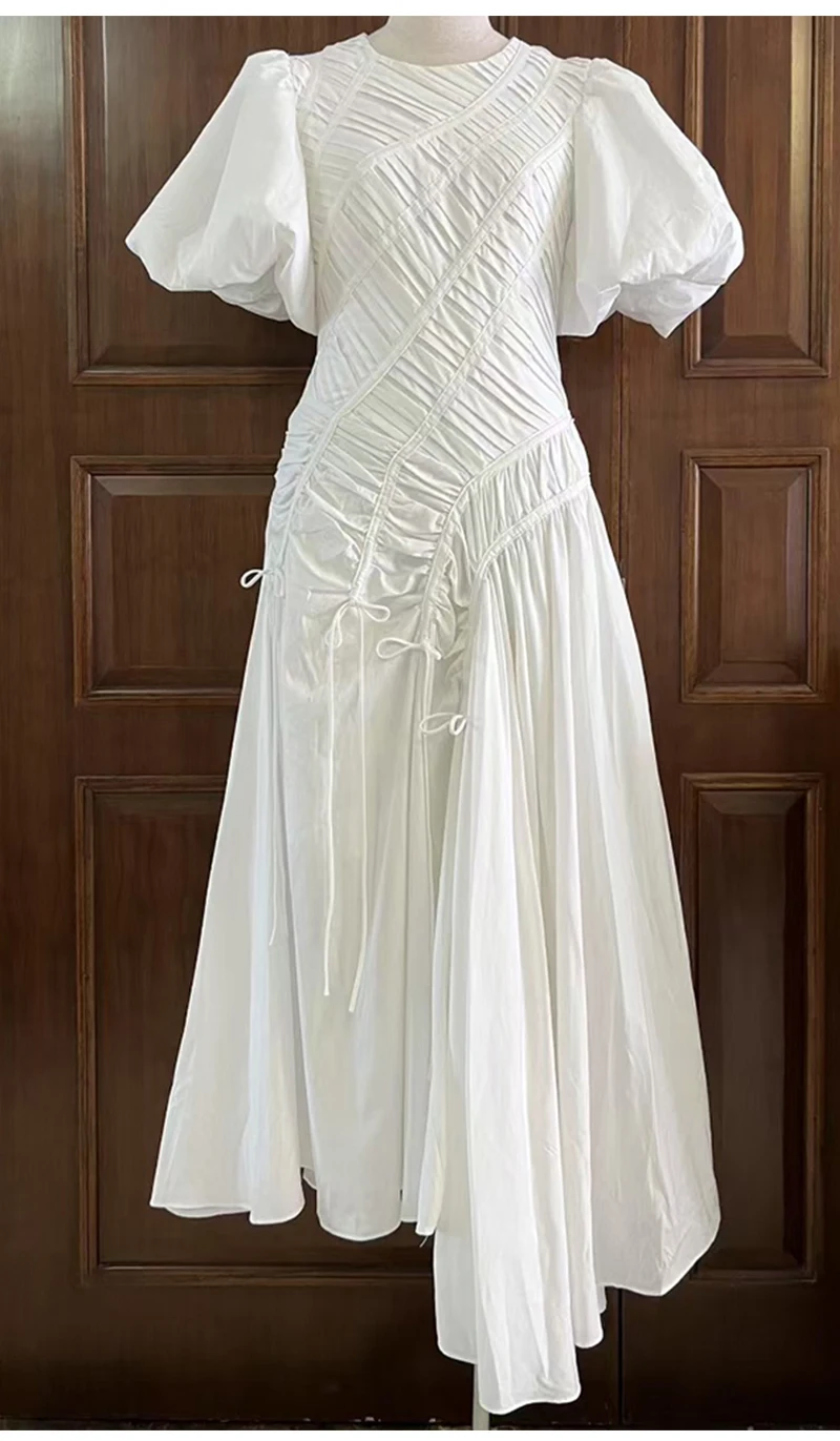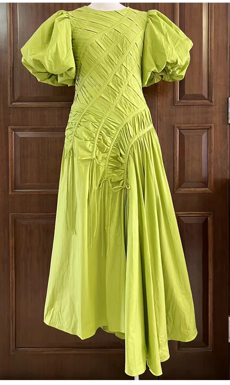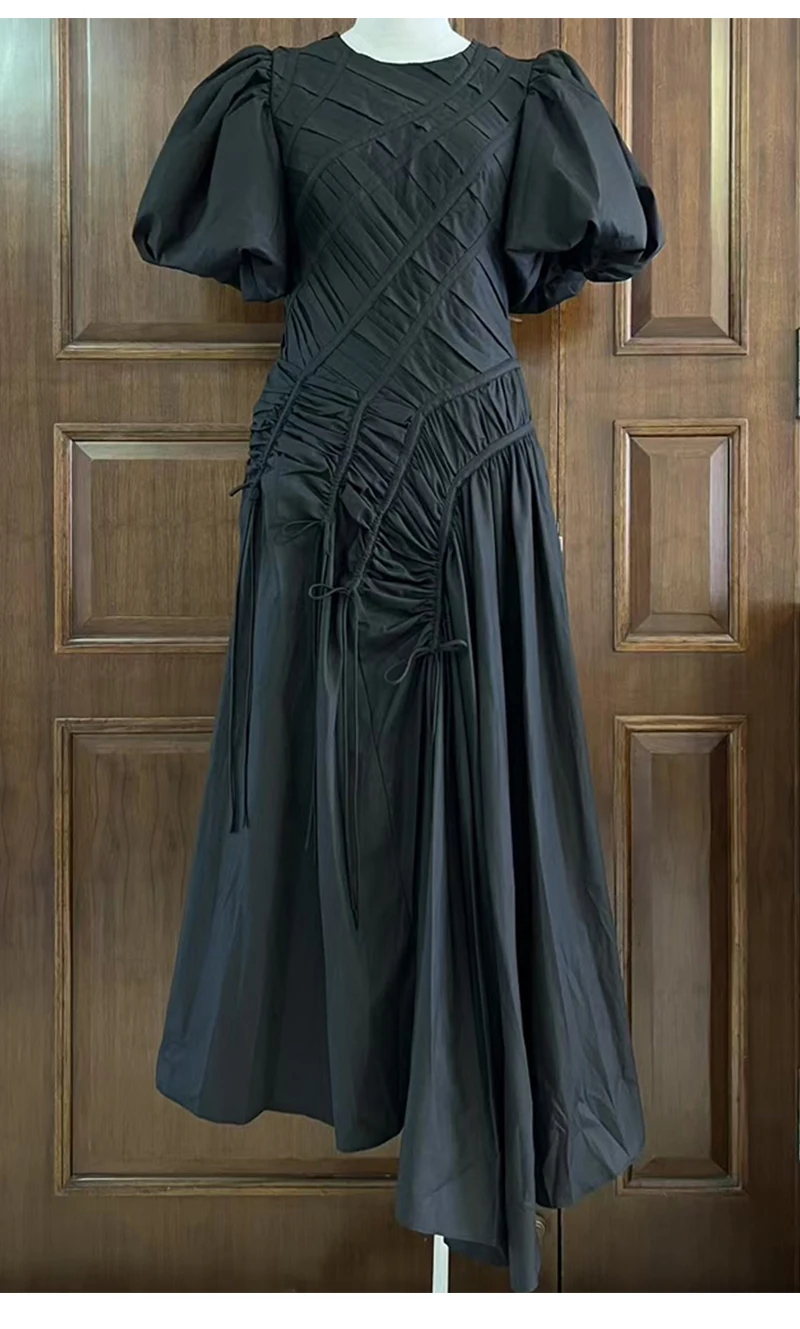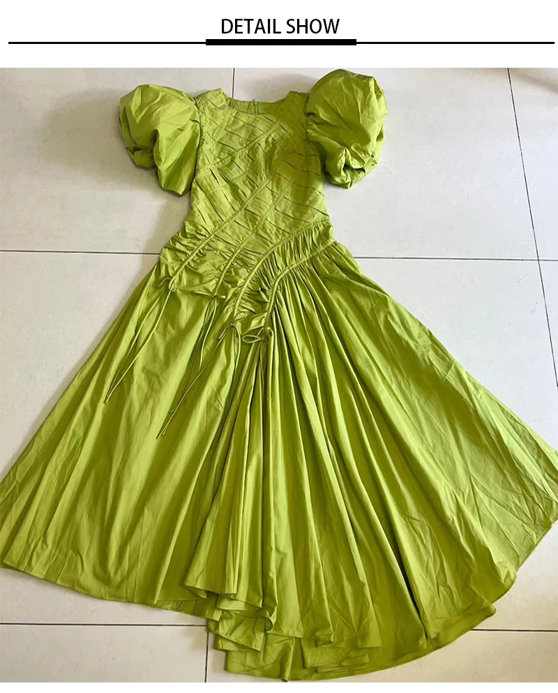 Color: Blue, Size: M - 2025 summer women's new round neck lantern short sleeve irregular stitching drawstring dress slim dinner temperament long dress