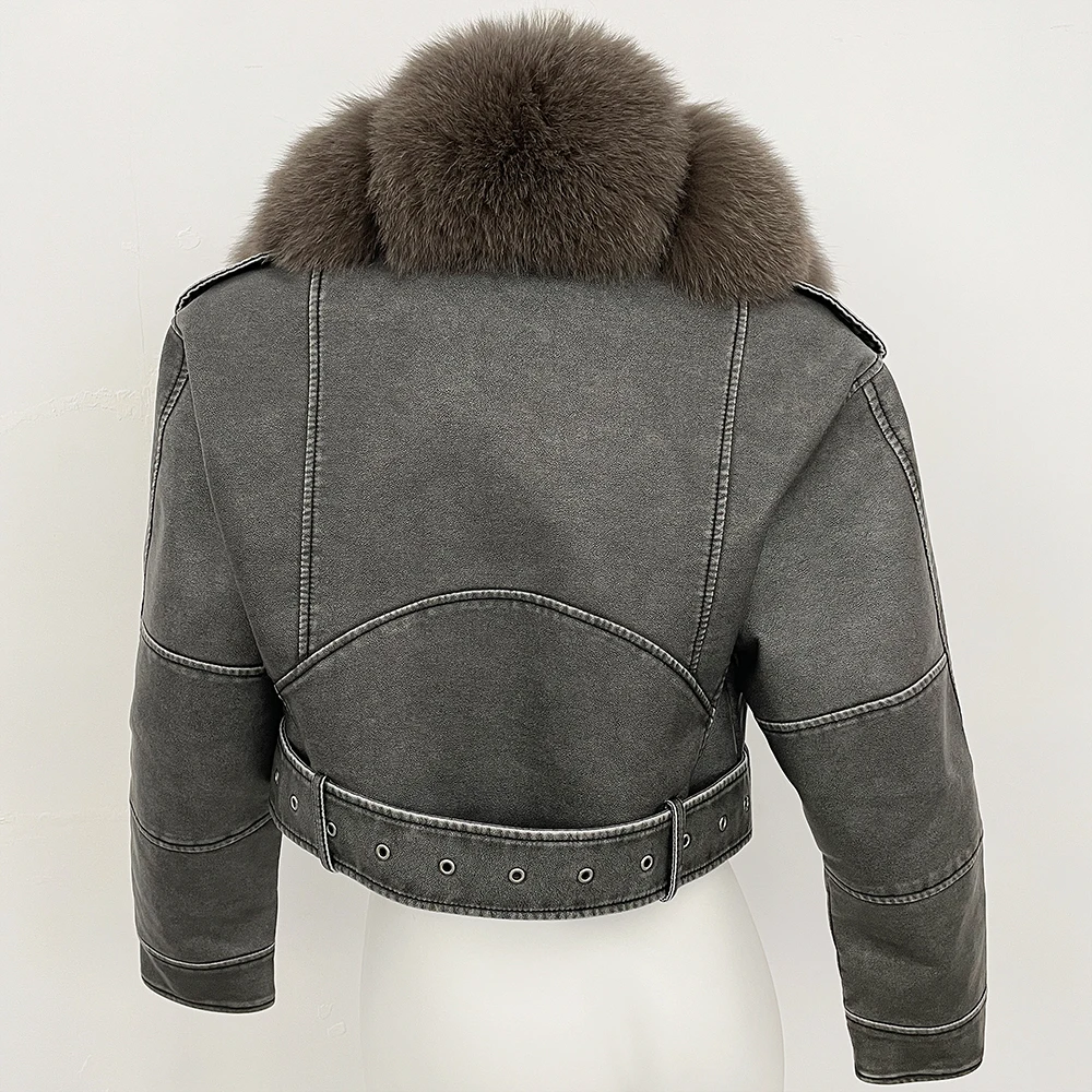 Color: Blue, Size: XL - Fake Leather Coat New Natural Fox Fur Autumn Short Faux Leather Jacket Female Spring PU Women Long Sleeve Real Fur Coat Thin