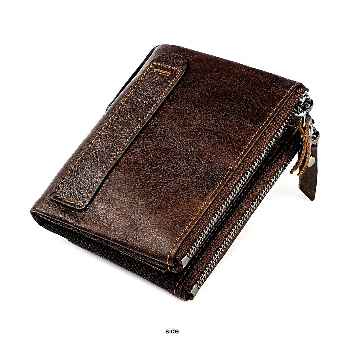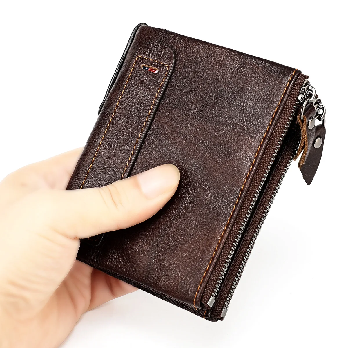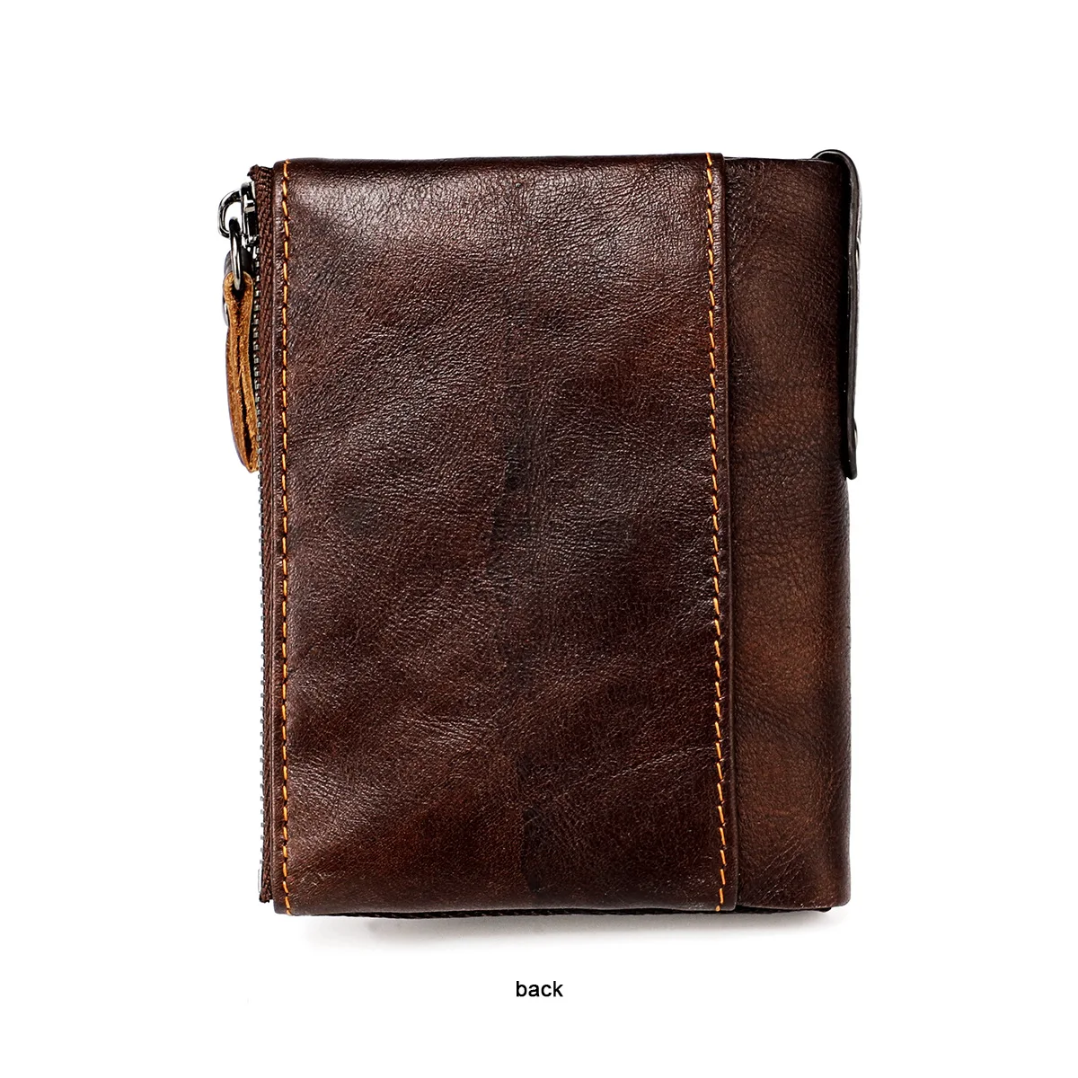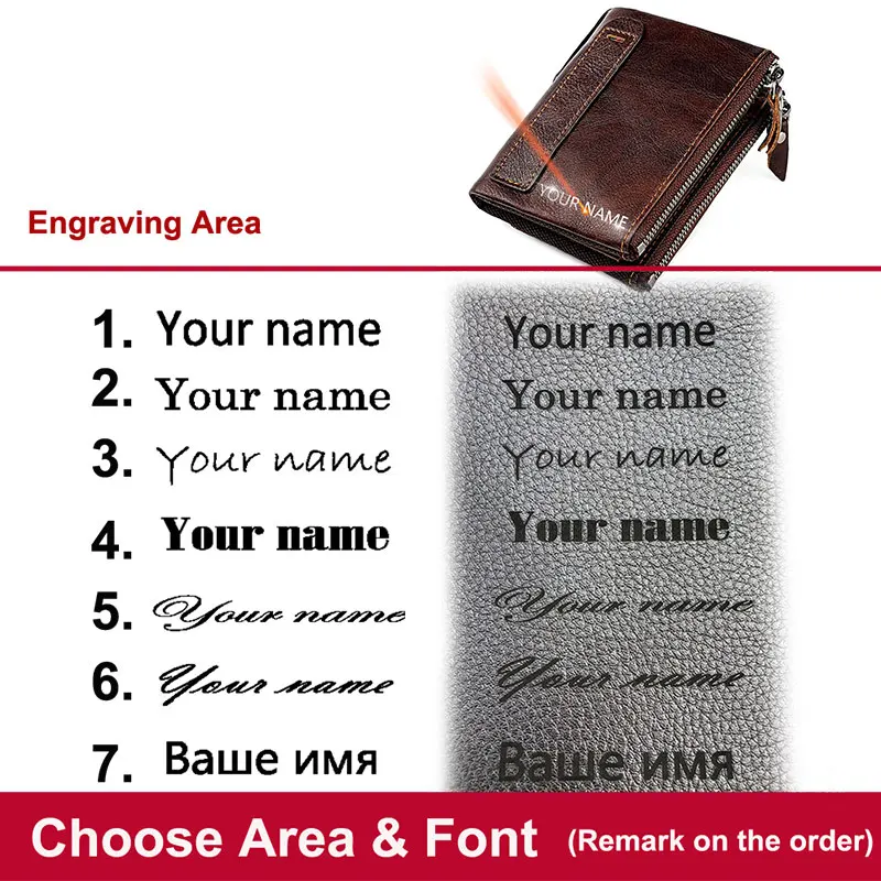 Color: Brown - Genuine Leather Short Men RFID Wallets Name Engraving Leather Card Holder Brand Men Purse Retro Coin Pocket Zipper Male Wallet