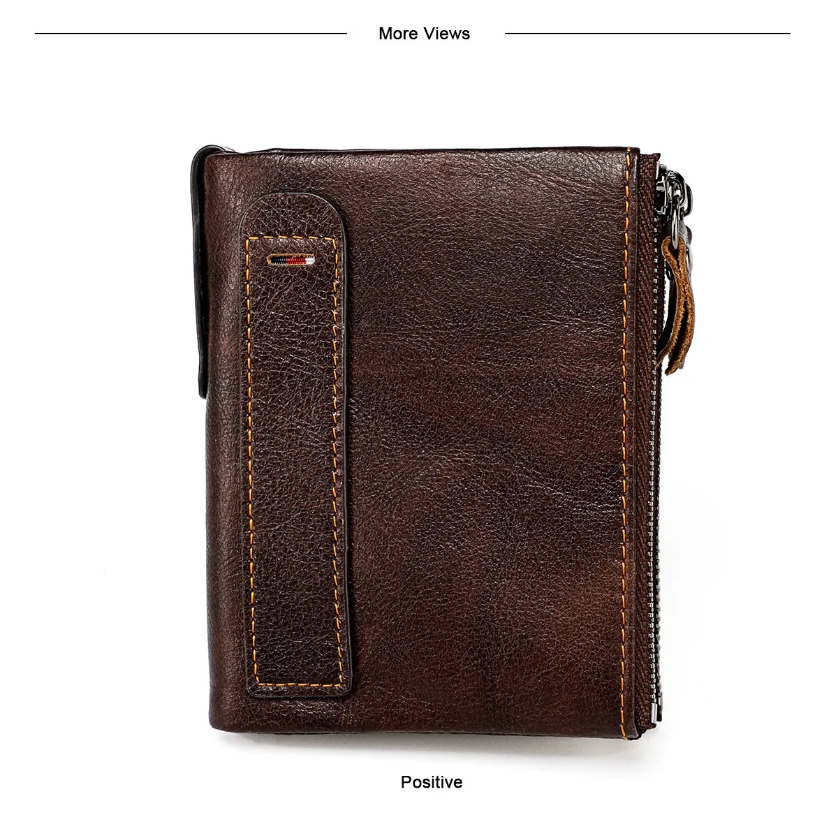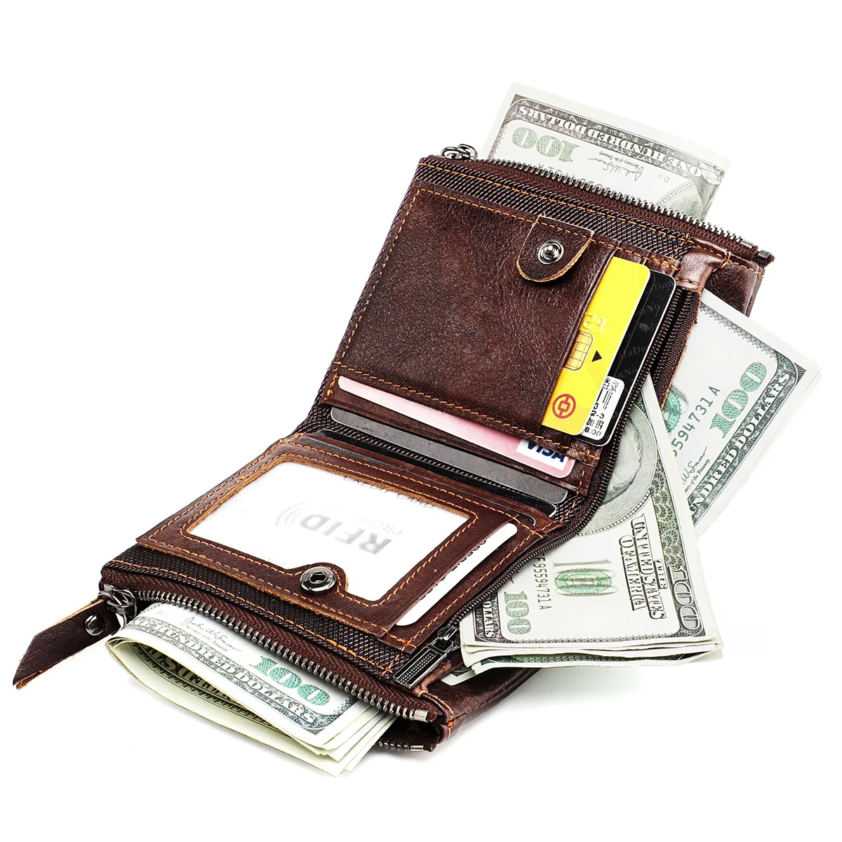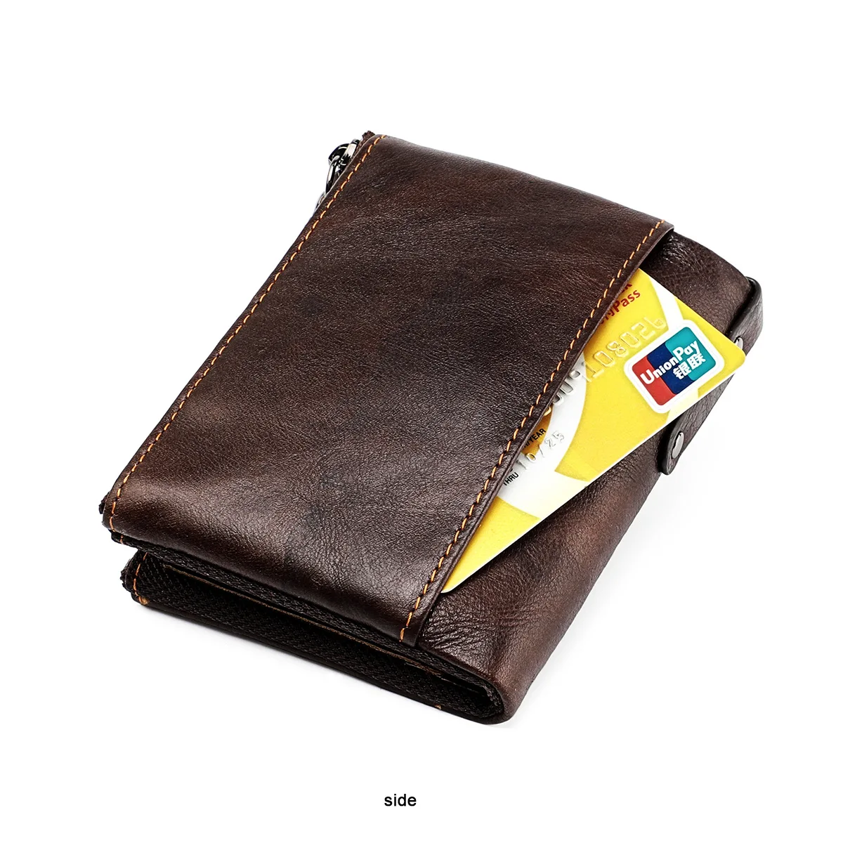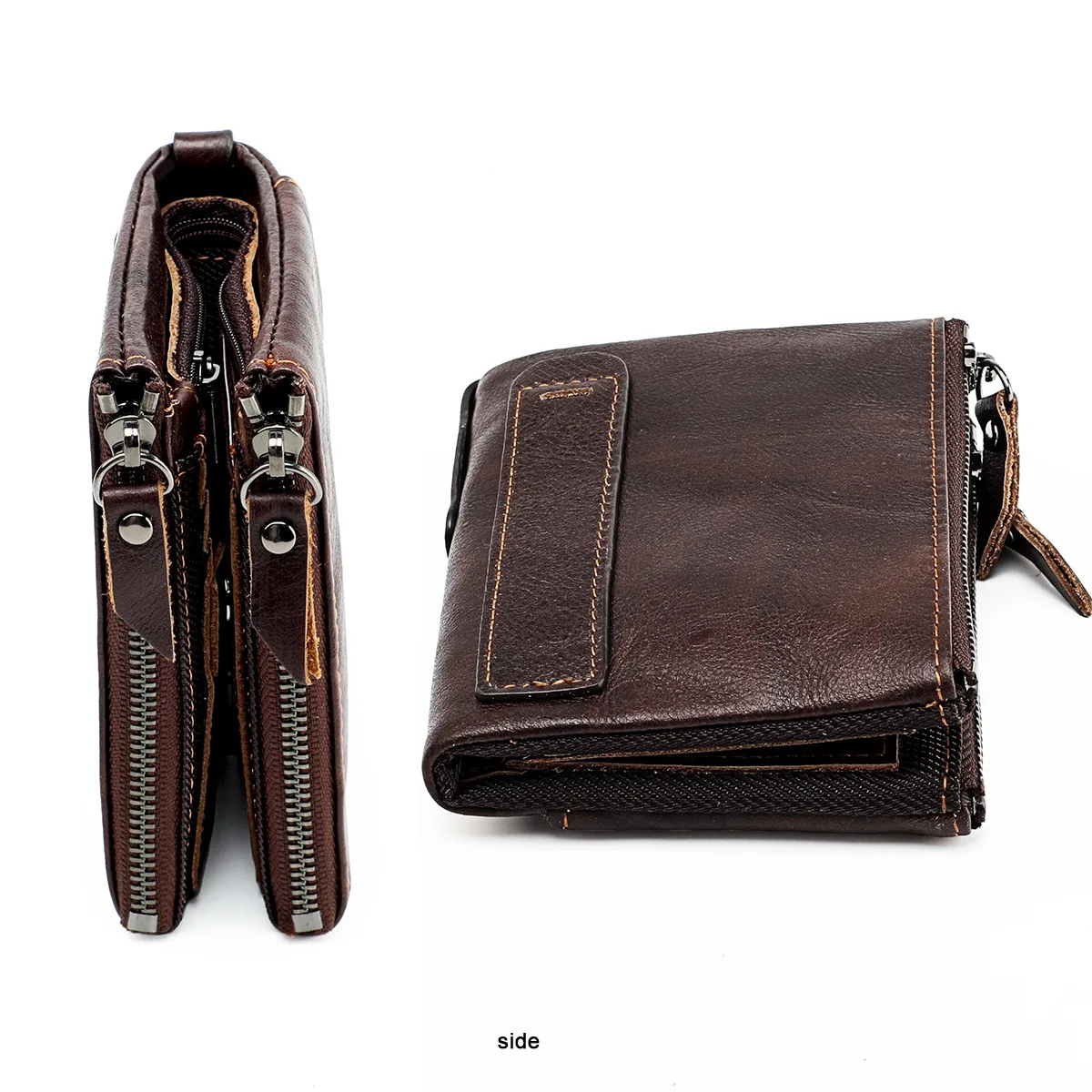 Color: Brown - Genuine Leather Short Men RFID Wallets Name Engraving Leather Card Holder Brand Men Purse Retro Coin Pocket Zipper Male Wallet
