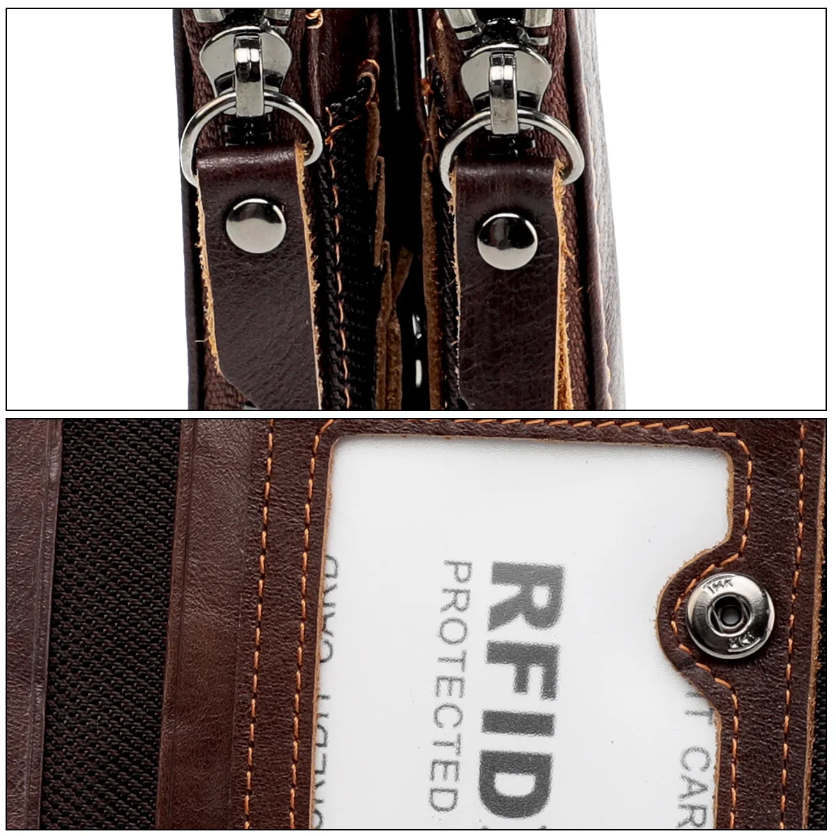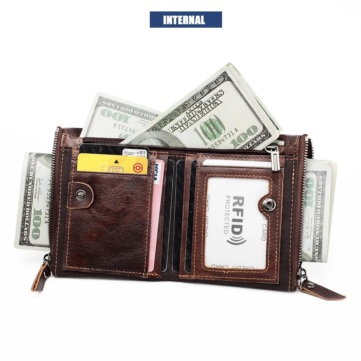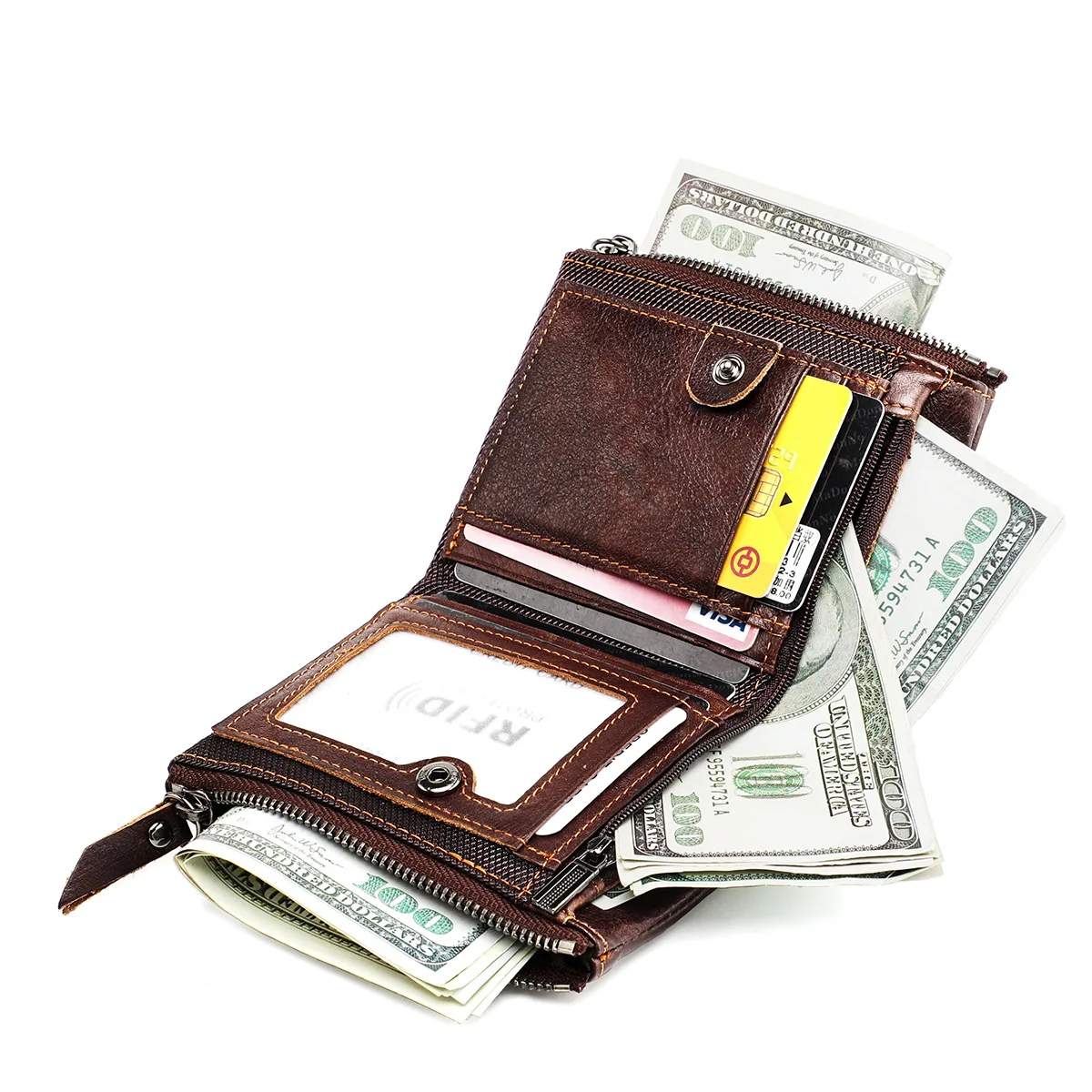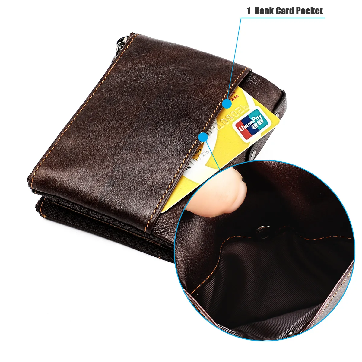 Color: Brown - Genuine Leather Short Men RFID Wallets Name Engraving Leather Card Holder Brand Men Purse Retro Coin Pocket Zipper Male Wallet