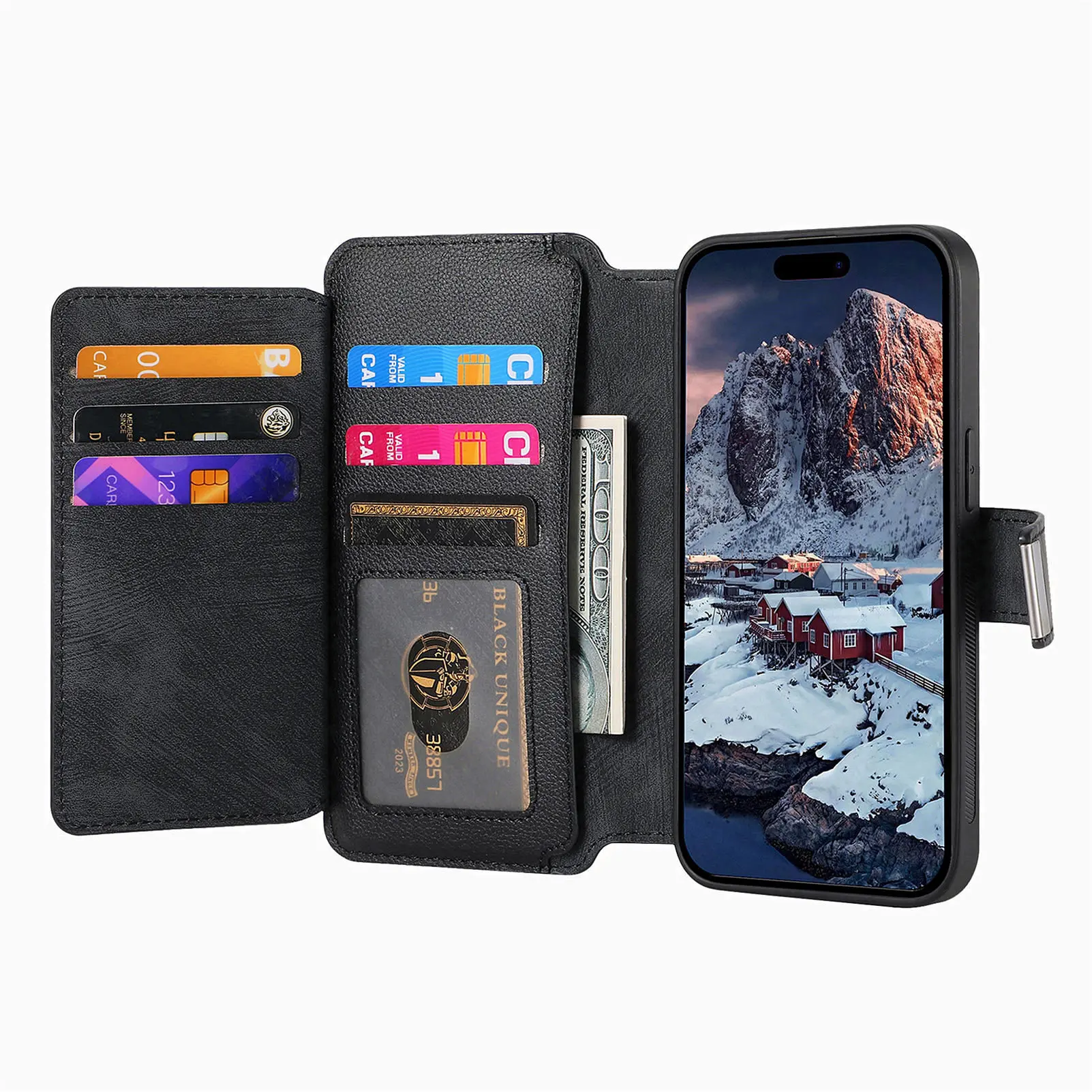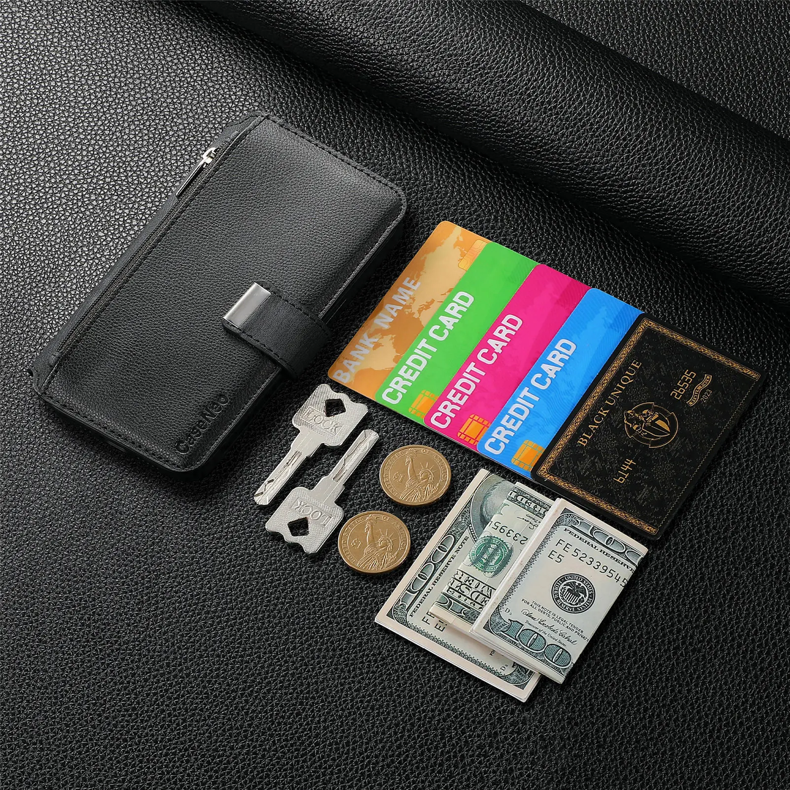 Features: Come with 6 card slots + 1 cash slots + 1 zipper pocket +magnetic closure