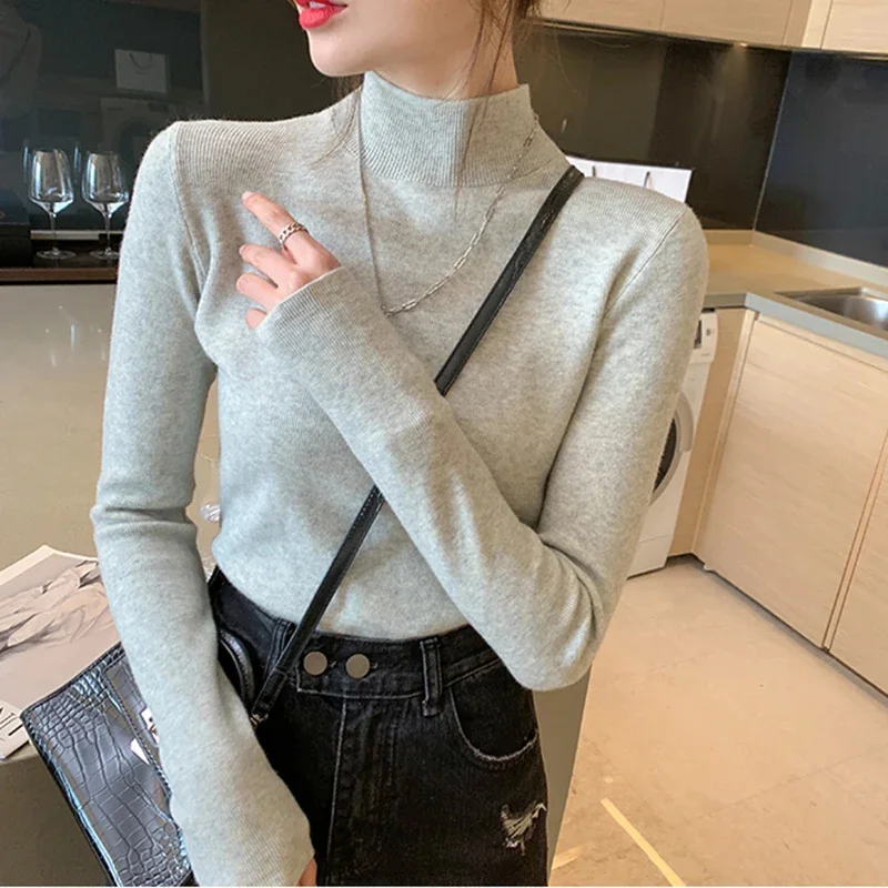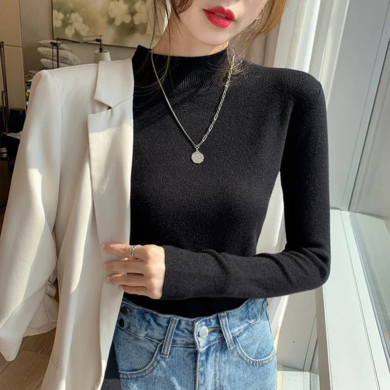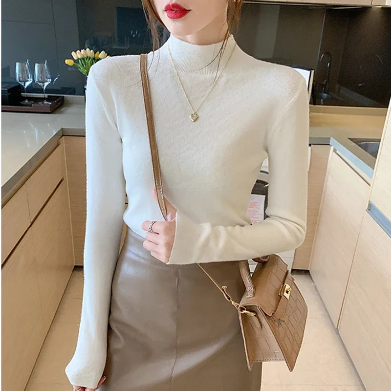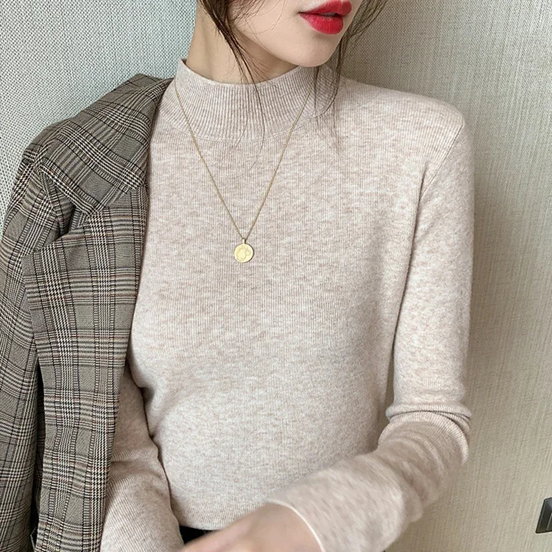 Color: Brown, Size: One Size - Turtleneck Sweater Women Fashion New Stretch Tops Women Knitted Pullovers Long Sleeve Bottoming Knitted Sweater
