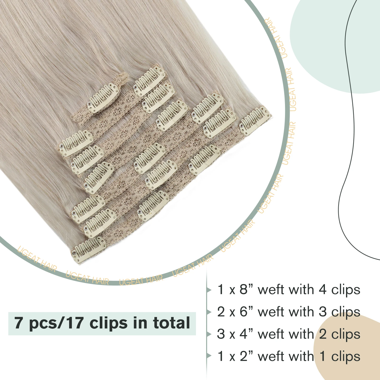 Weight: 100g net hair for 7Pcs 14-22Inch, 120g including the clips;