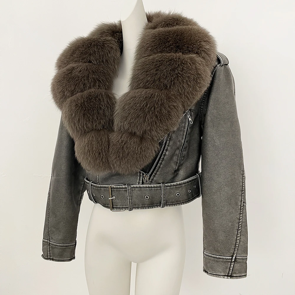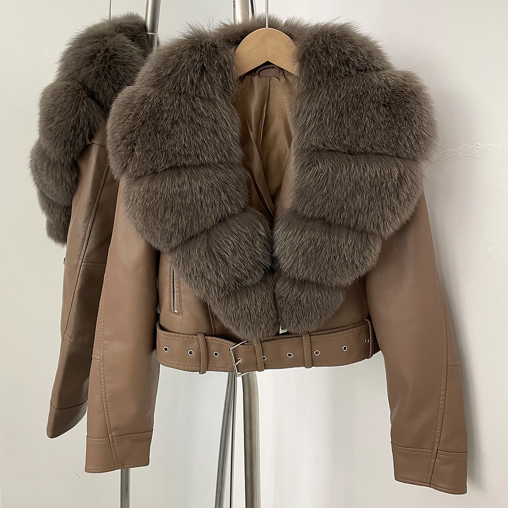 Color: Burgundy, Size: L - Fake Leather Coat New Natural Fox Fur Autumn Short Faux Leather Jacket Female Spring PU Women Long Sleeve Real Fur Coat Thin