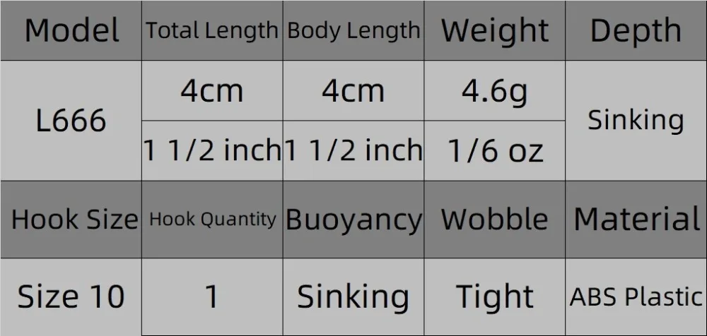 Introducing our high-quality fishing lure, crafted to help you catch more fish. This sinking lure measures 1 1/2 inches (4 cm) in length and weighs in at 1/6 oz (4.6 g), making it the perfect size for a variety of fish species.