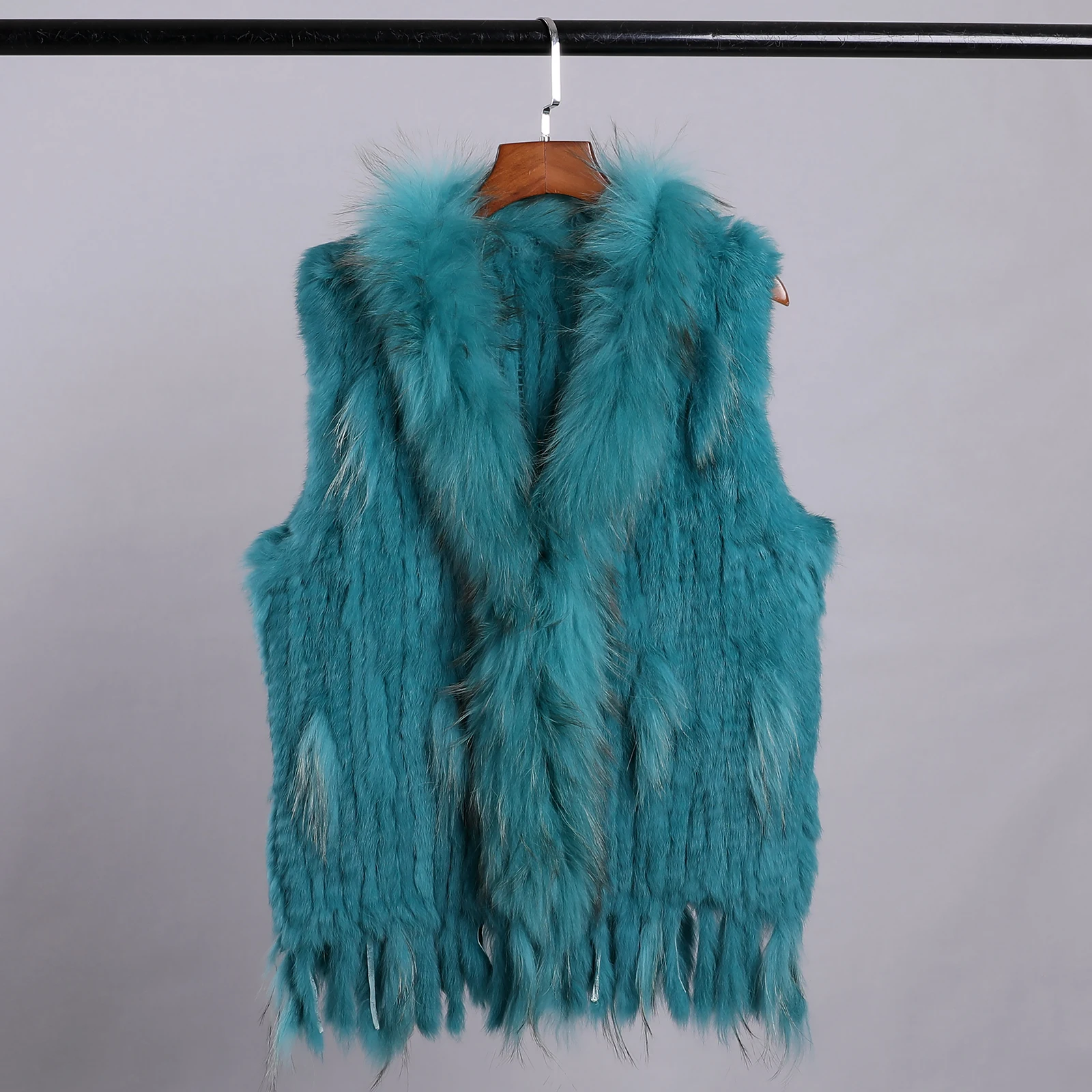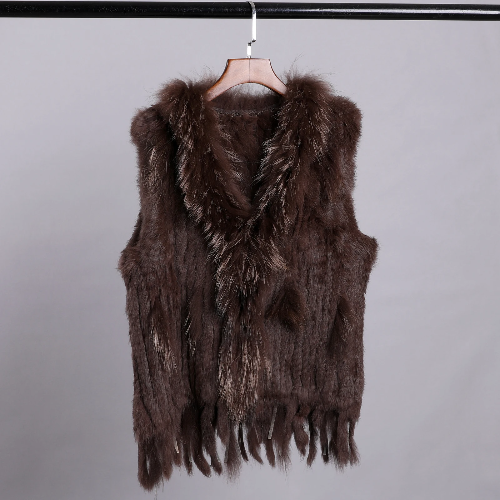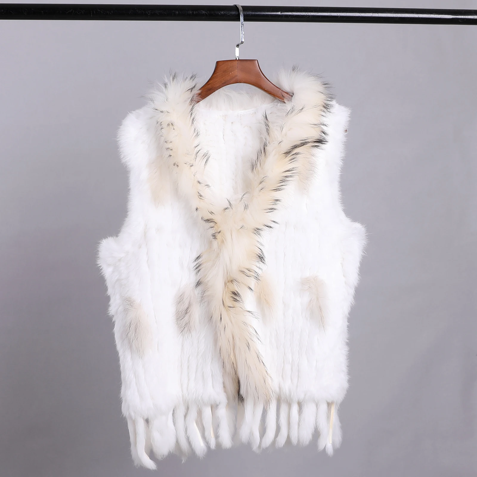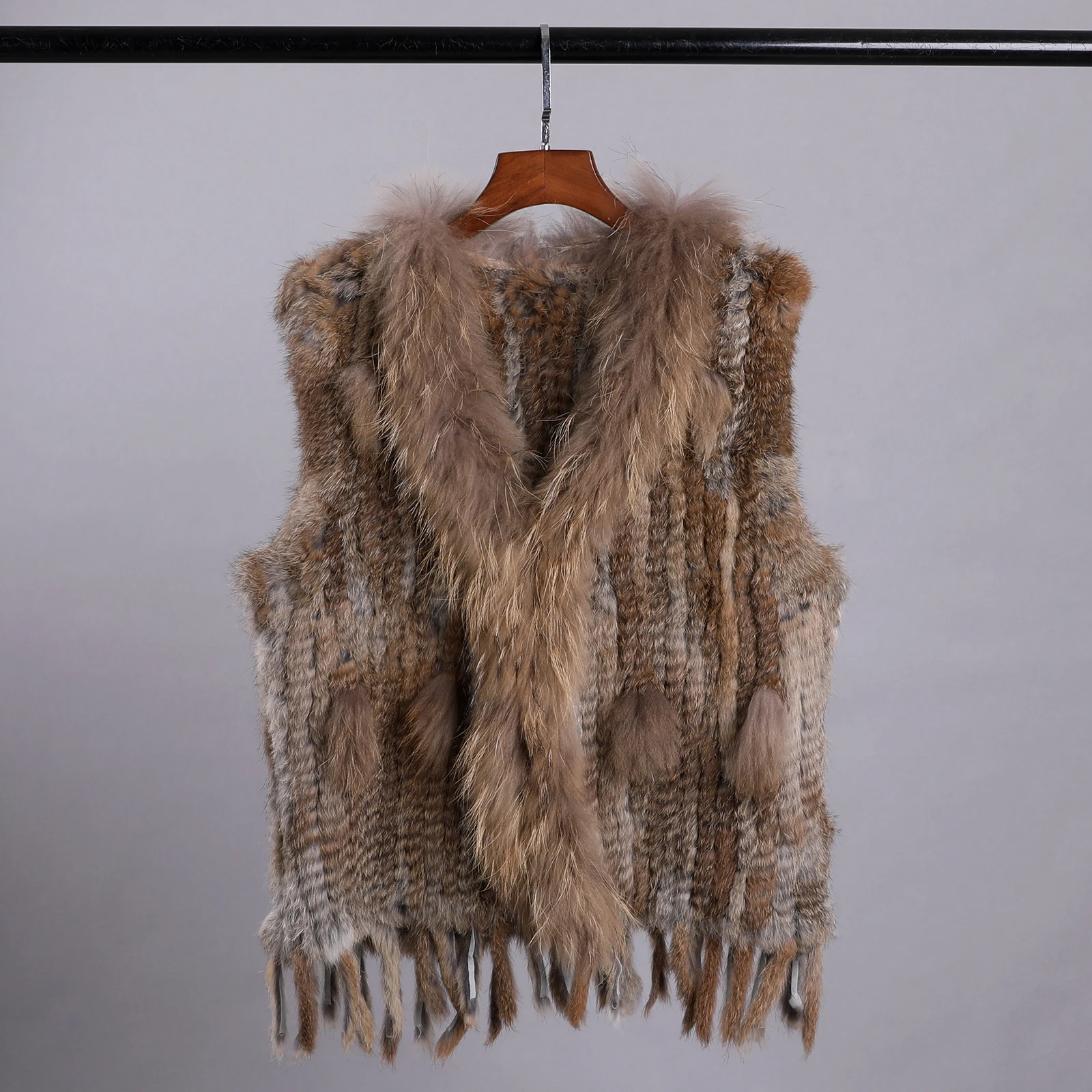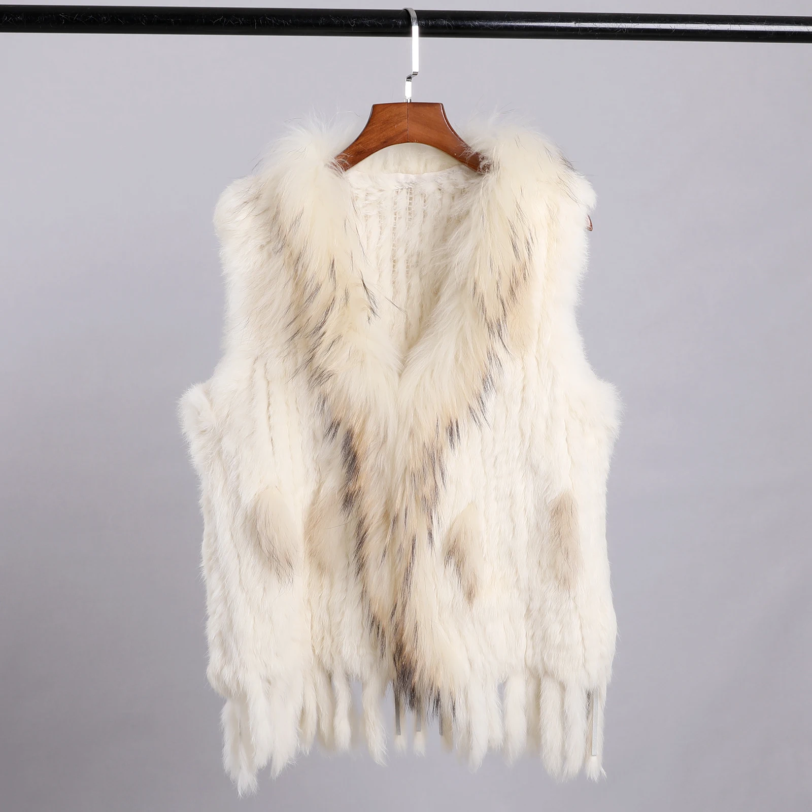 Color: Champagne, Size: XL - Luxury Women's Genuine Premium Long Hair Rabbit Fur Knit Vest Raccoon Fur Trim Gilet Lady Sleeveless Waistcoat Real Fur Jacket